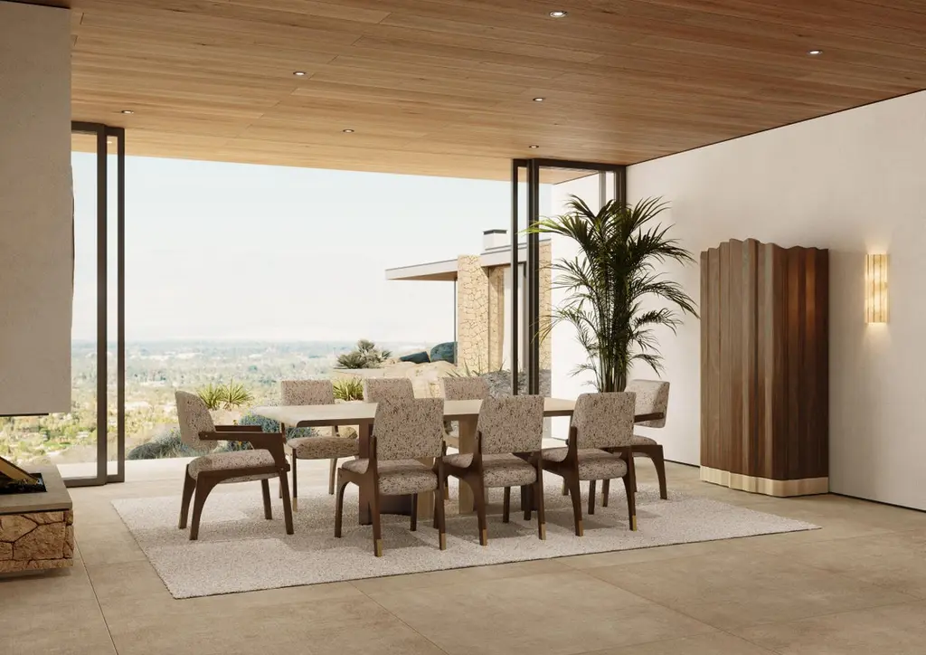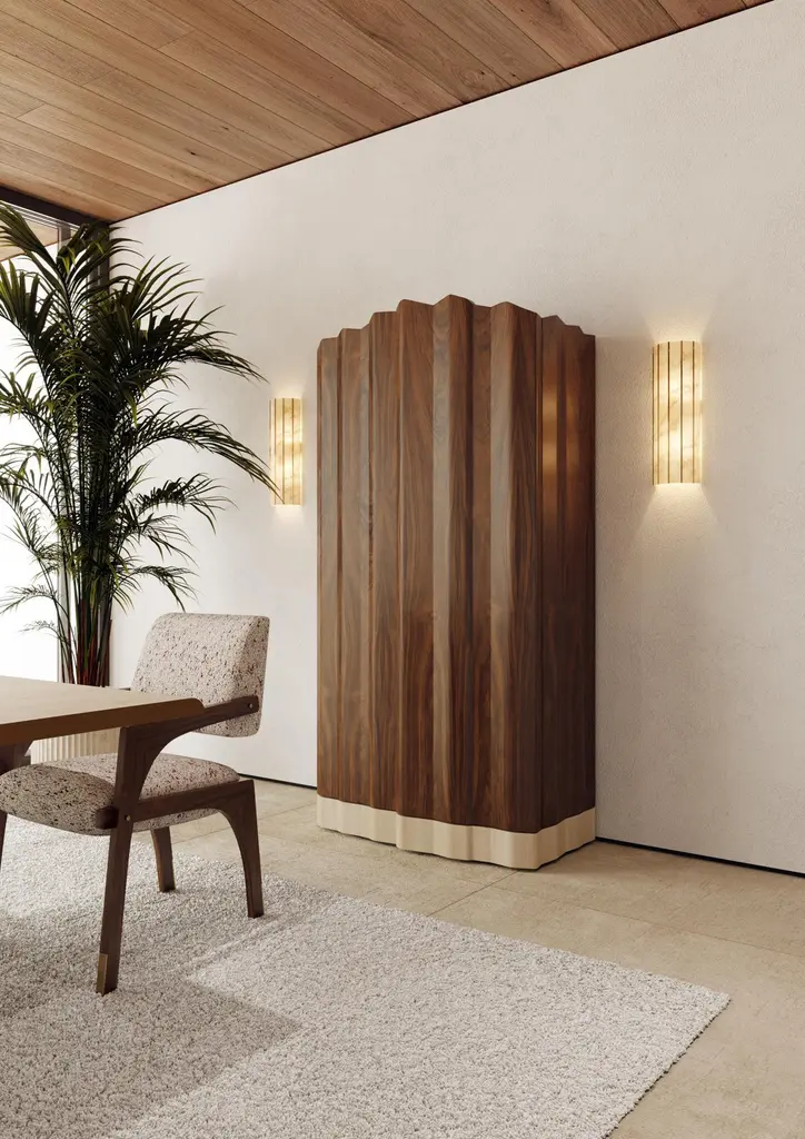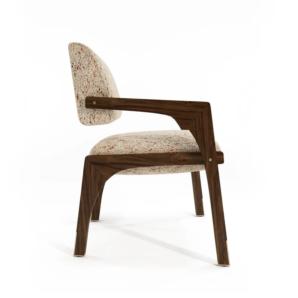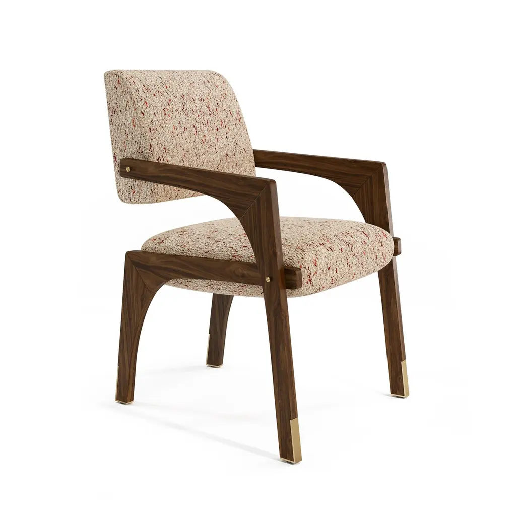 Best Chair Design at the International Design & Architecture Awards 2021Honorable Mention at the European Product Design Awards 2021The Arches dining chair is designed in the likeness of the architectural scale that suggests a crossing through the structures of a utopian city, organized by the principles of symmetry and ideal forms.The chair profile shows details that seem to be drawn from large architectural structures. The raised backrest stands out from the remaining set that only crosses in a single point, whereas a folded brass bar arises as a support element that prevents the contact of the arches with the floor. Arches is a sculptural chair manufactured by a team of joinery, upholstery and exquisite metal work that catches the eye of those who seek for a unique design.Product details:Frame: walnut in matt varnish. Feet: brushed brass.Upholstery: InsidherLand Tan ref. 03Product options:Frame: Lacquered in any Ral Classic color, other woods and finishes under request.Upholstery: InsidherLand fabrics or client fabric.COM: 1.5m 58.99in. (Standard width 140cm 55in.)Weight: 11Kg 24,3 lbsMade to order. Custom sizes and other finishes are available under request.Designed by Joana Santos Barbosa, 2024. Handmade in Portugal.