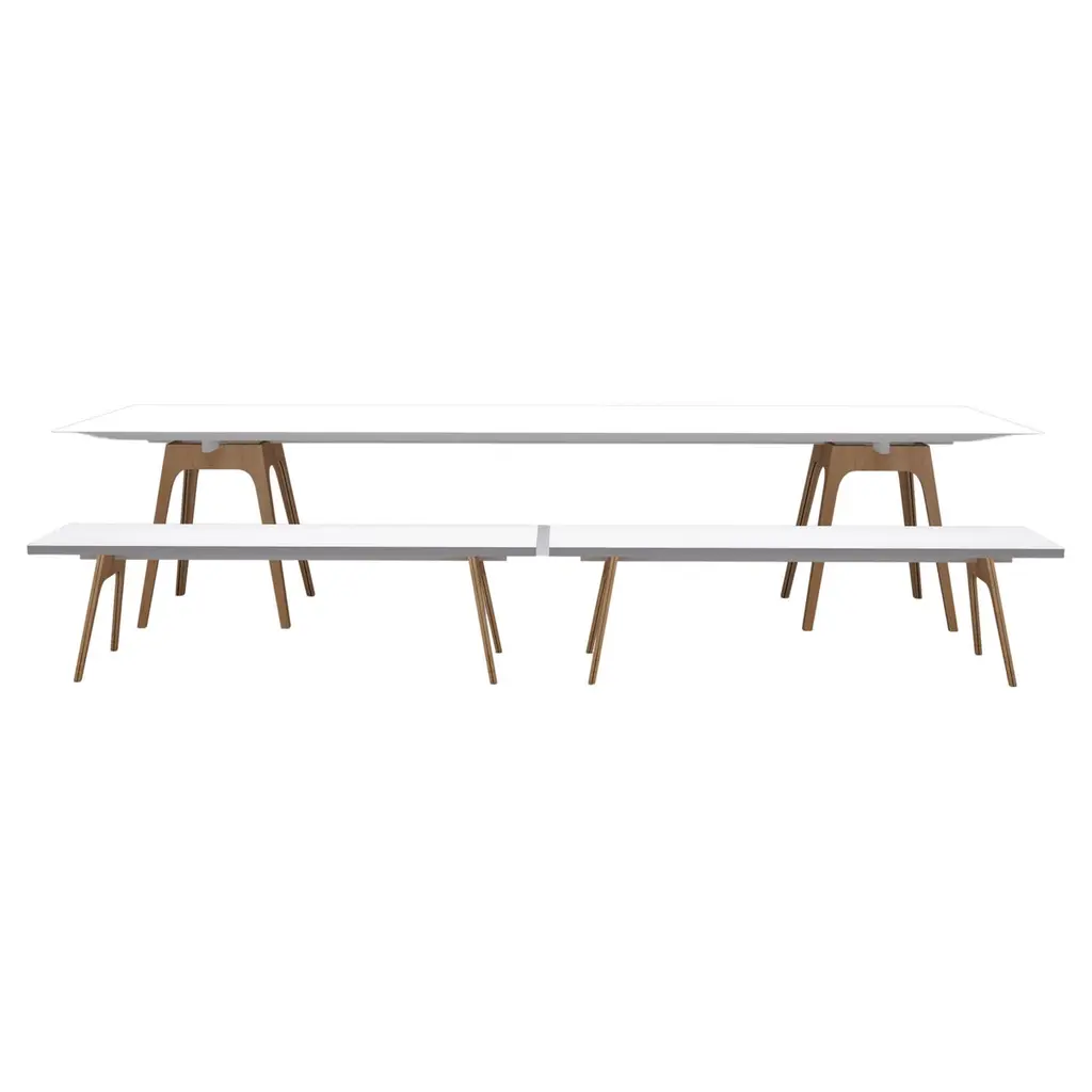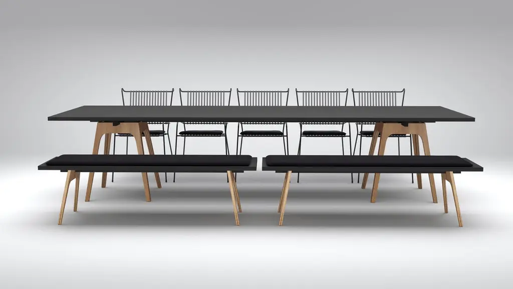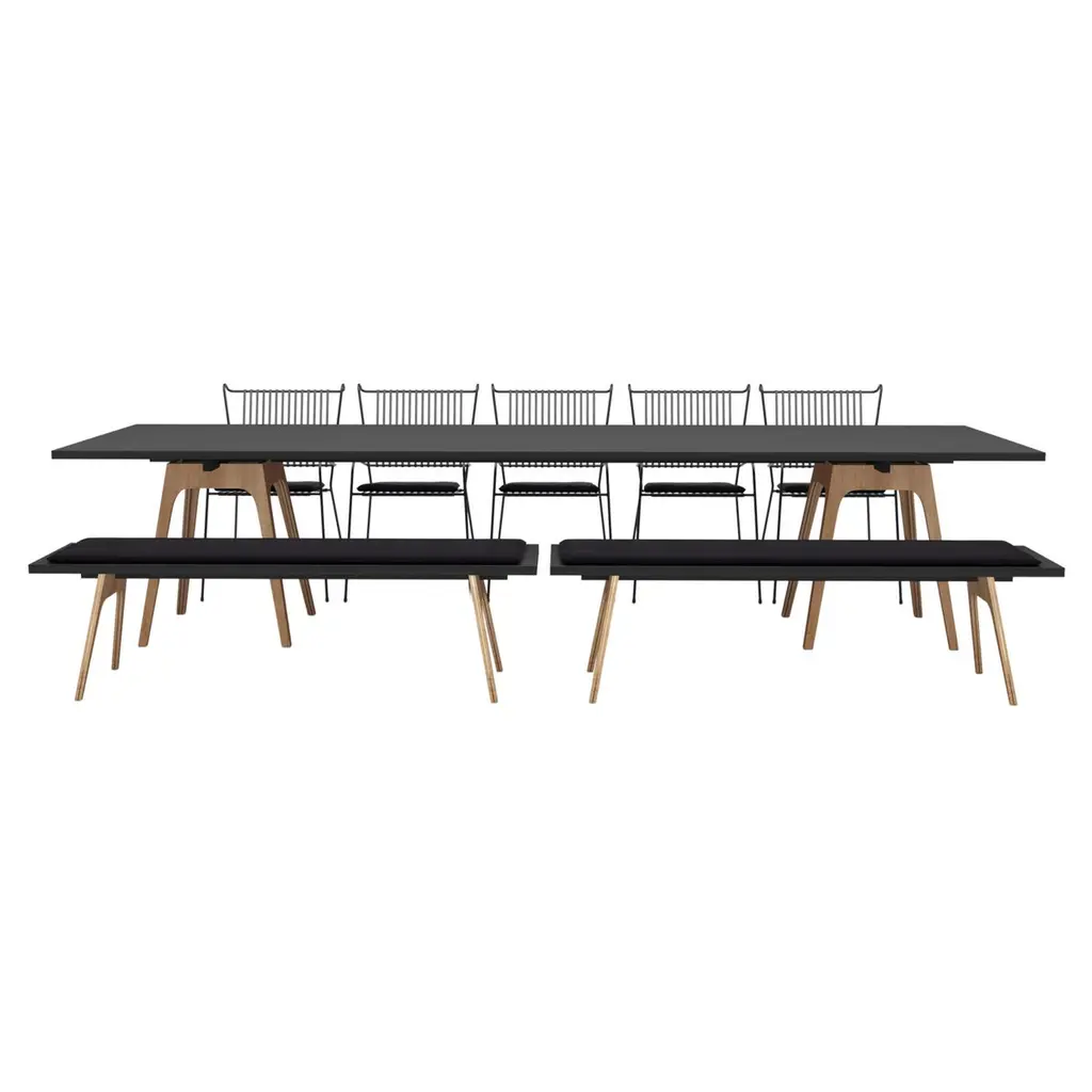 Set of 3 Marina Black Dining Table and Benches by Cools CollectionHandmade.Dimensions: Dining Table: D 100 x W 340 x H 75 cm.Bench: D 35 x W 160 x H 45 cm.Materials: Legs: Teak/Dibond. Tabletop: Spruce with corrosion resistant boatpaint.Table top & bench top available in black or white. Also available with cushions for the bench. Please contact us.An extra large dining table for memorable times with your loved ones. Characterized by its elegant simplicity and powerful presence, the Marina table is made of high-quality wood. The white or black table top is set upon two teak wood blocks, with an intelligent underconstruction that doesn't require screws and stabilizes the table. It is made for indoor/outdoor use. A special boat lacquer protects the wood from the weather. You can find a cozy seat on the optional benches, which can be combined with the Capri chairs or other beautiful chairs of choice.COOLS Collection was launched in 2020 by mother-and-daughter duo Stefania Andorlini and Maria Francesca Staehle, who together decided to start a new adventure and build a brand capturing their joint aesthetic expression and spirit. A joint vision of casual elegance and timeless simplicity characterizes their brand and collection.COOLS are Contemporary Object Of Love, making you want to have them around for a lifetime.We work together with local and specialised artisans across Europe. Our products are made in small batches, from high quality and sustainable materials. Either in form of recycled or long-lasting and recyclable materials, such as steel and aluminum, both endlessly reclaimable and reshapable. We believe in lasting, meaningful design. Design that is self-evident and essential, transcending context and time. We love design that is simultaneously casual, intuitive, humorous and chic. We believe in treasuring what we love. Our designs are: Intentionally casual.Likeable and resonating, with a touch humour.Distinctive, smart and surprising.Consciously balancing function and aesthetics.Timeless, contemporary, to treasure and love for years to come.