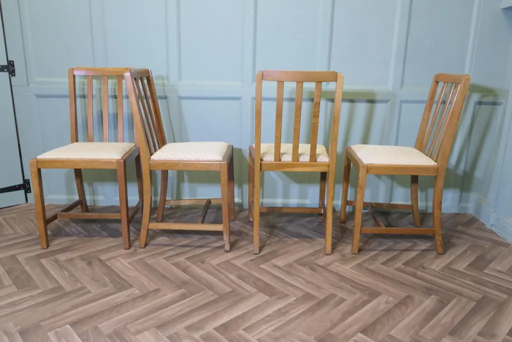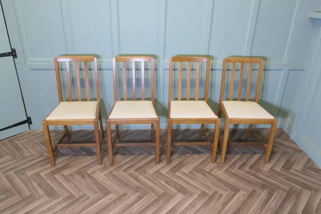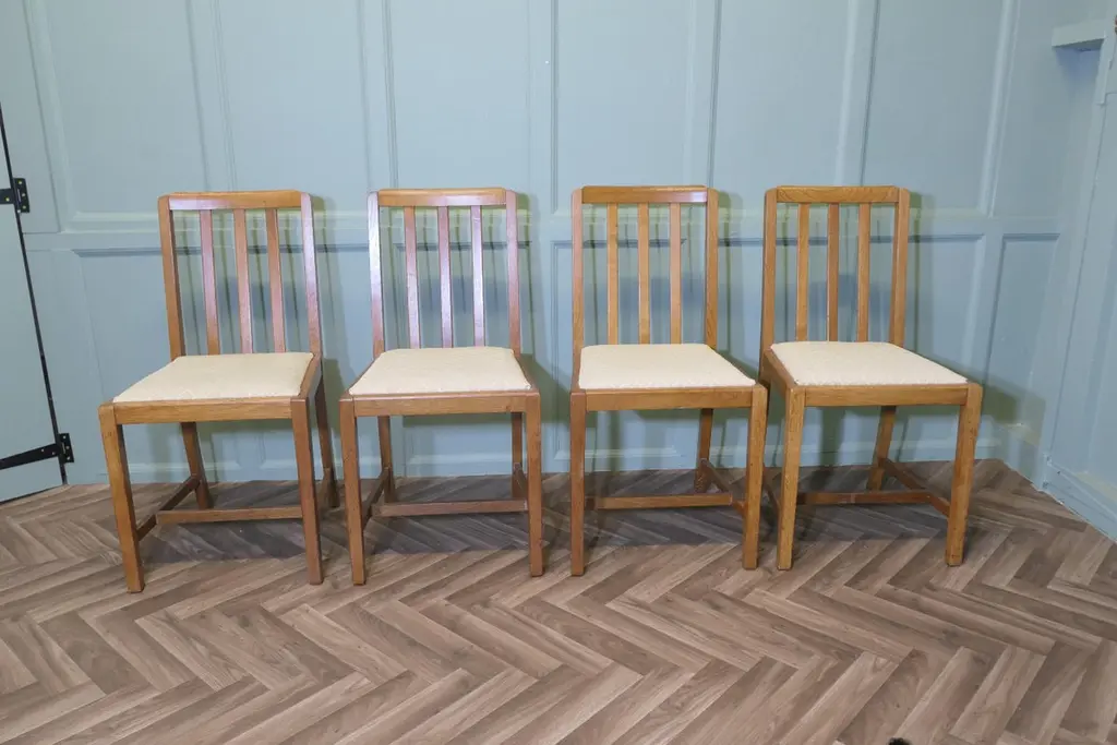 Set of 4 Arts and Crafts Golden Oak Dining Chairs This is a very handsome set of 4 Oak Chairs, the chairs have square legs and the backs have flat slatsThe seats are the drop in type and easy to have recovered to match your own schemeThe chairs are in good sound condition with very little sign of wear all in all a very good setThe chairs are 33” high at the back, 17” across the front and seats are 18” highTST116