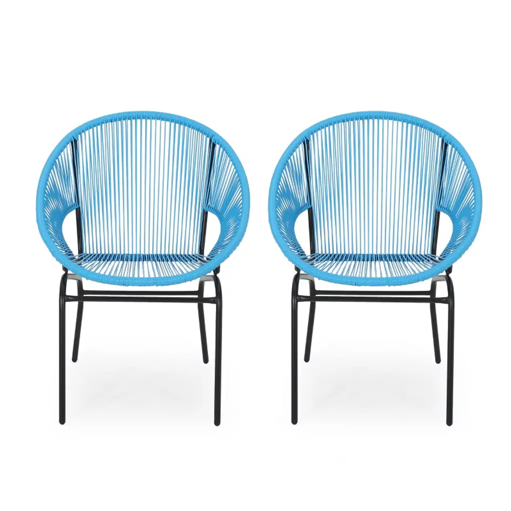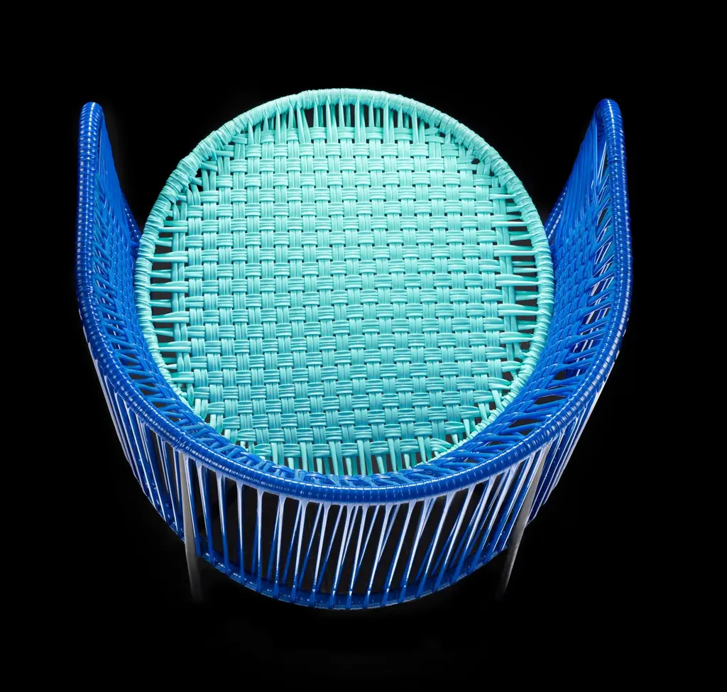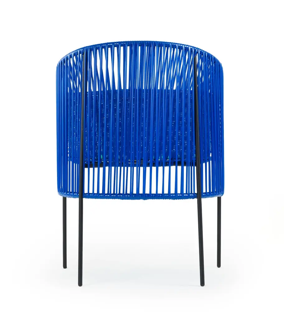 Set of 4 blue caribe dining chair by Sebastian Herkner.Materials: galvanized and powder-coated tubular steel. PVC strings are made from recycled plastic.Technique: Made from recycled plastic and weaved by local craftspeople in Colombia. Dimensions: W 55.3 x D 56 x H 75 cm Also available colors: blue/ mint/ black, mint/ green/ black, orange/ rose/ curry, green/ rose/ curry.The charming caribe dining chair is a colorful design for seating arrangements inside and outdoors. It’s part of the Caribe collection, designed by Sebastian Herkner for Ames. The German designer visited Colombia together with Ames founder Ana Maria Calderon-Kayser and translated the vibrancy and spirit of the country’s people and traditions into joyful, modern furniture pieces defined by clean lines, strong colors, and the hand-woven webbing.Each chair is made in Santa Marta, a city on the Caribbean coast of Colombia, by local craftspeople. They weave the PVC strings, which are made from recycled plastic, around the steel frame. The weaving technique the artesanos and artesanas use are called Momposino, a traditional method known for intricate patterns. Just the preparation of all the materials takes ten days, while the production of each chair takes three days.German designer Sebastian Herkner is a long-term collaborator of Ames and has visited Colombia multiple times to experience the country’s cities, nature and people first hand. He also visited many of the ateliers that Ames has partnered with to learn about the unique traditional crafts of Colombia's regions. A sought-after contemporary designer and recipient of many industry awards, he has worked with many international design brands, creating intriguing pieces that showcase his intuition for interesting material, color, and texture combinations.
