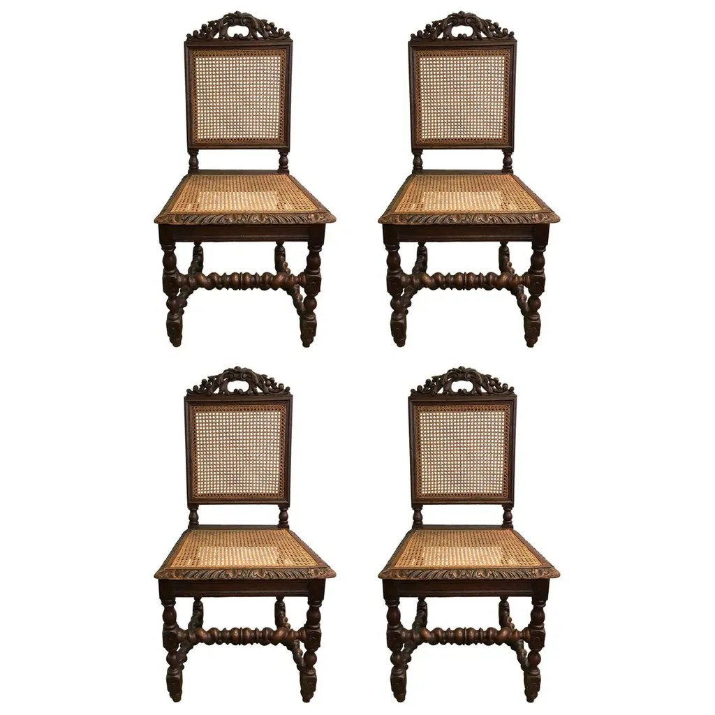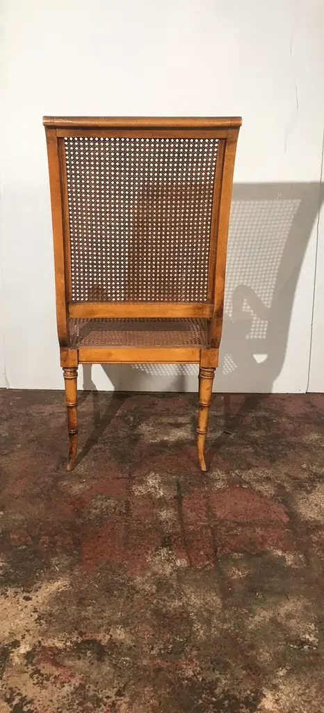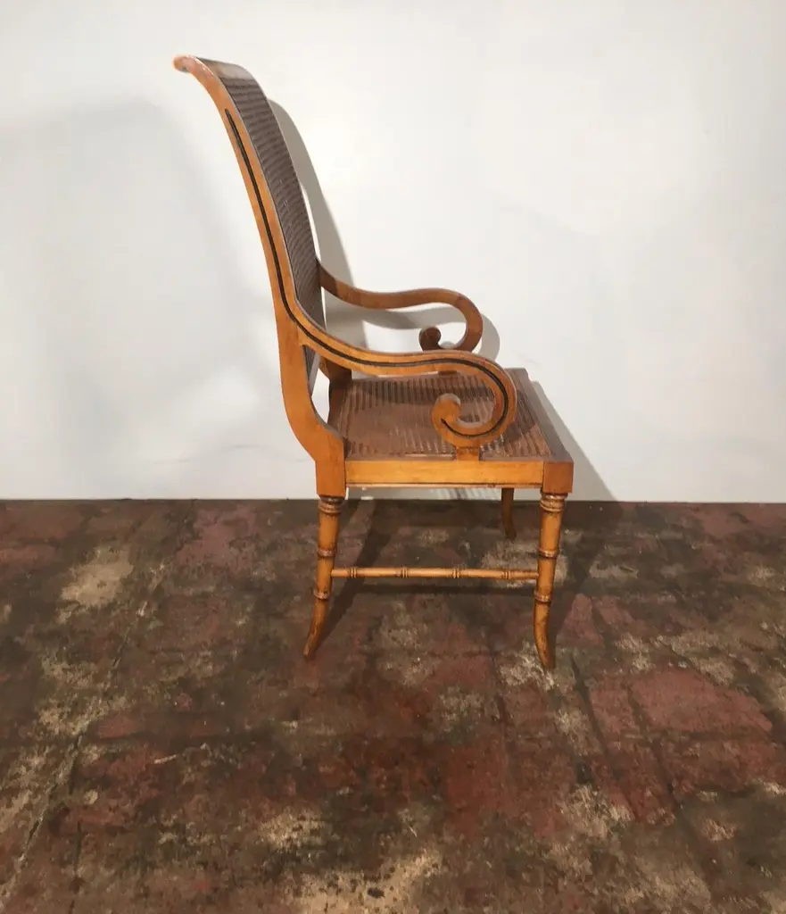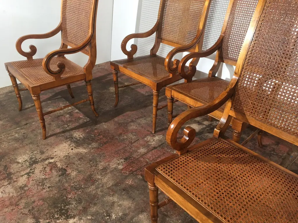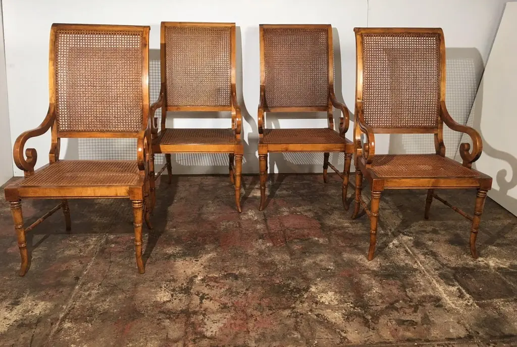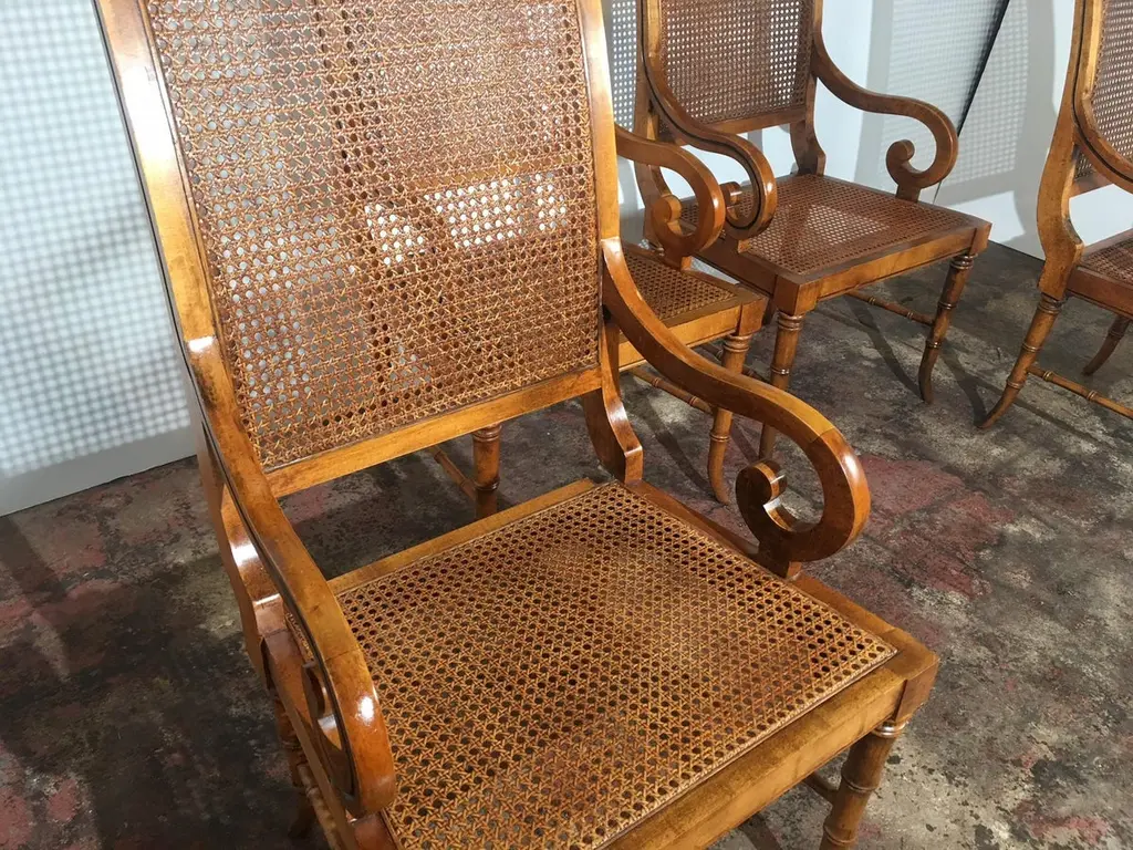 Set of four cane seat cane back dining room chairs. The arms are curved, and the legs are faux bamboo. Measure arm: 23.50"H. The price is for the set.