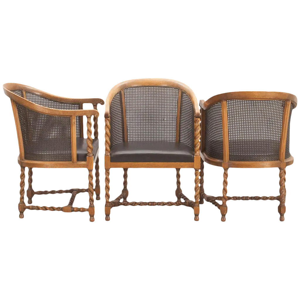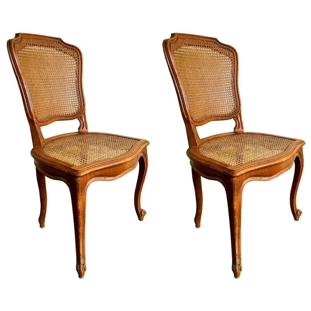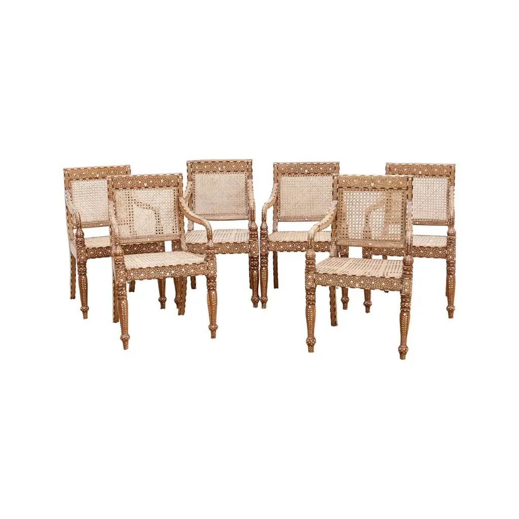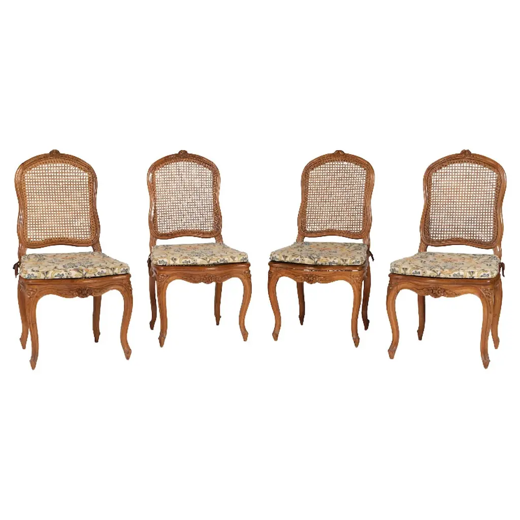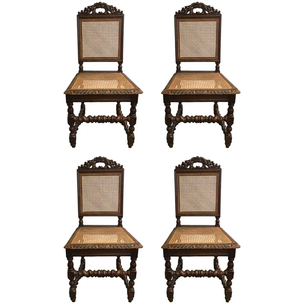 Set of four cane seat cane back dining room chairs. The arms are curved, and the legs are faux bamboo. Measure arm: 23.50"H. The price is for the set.