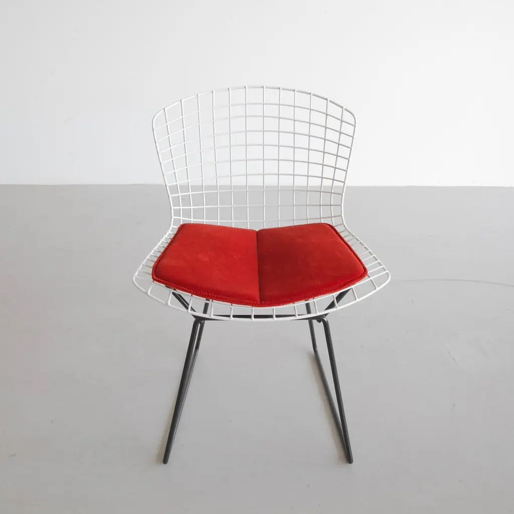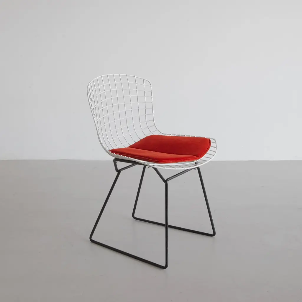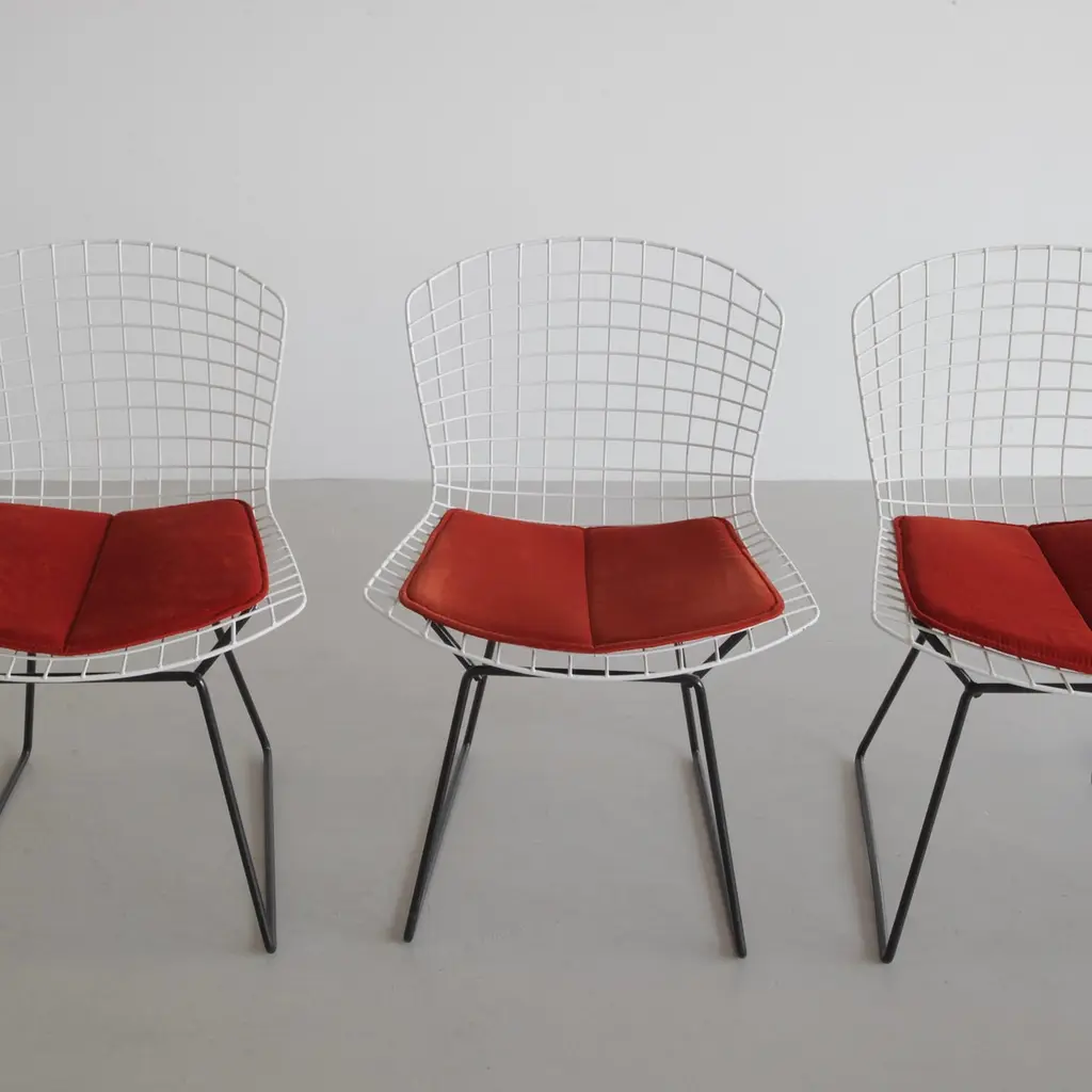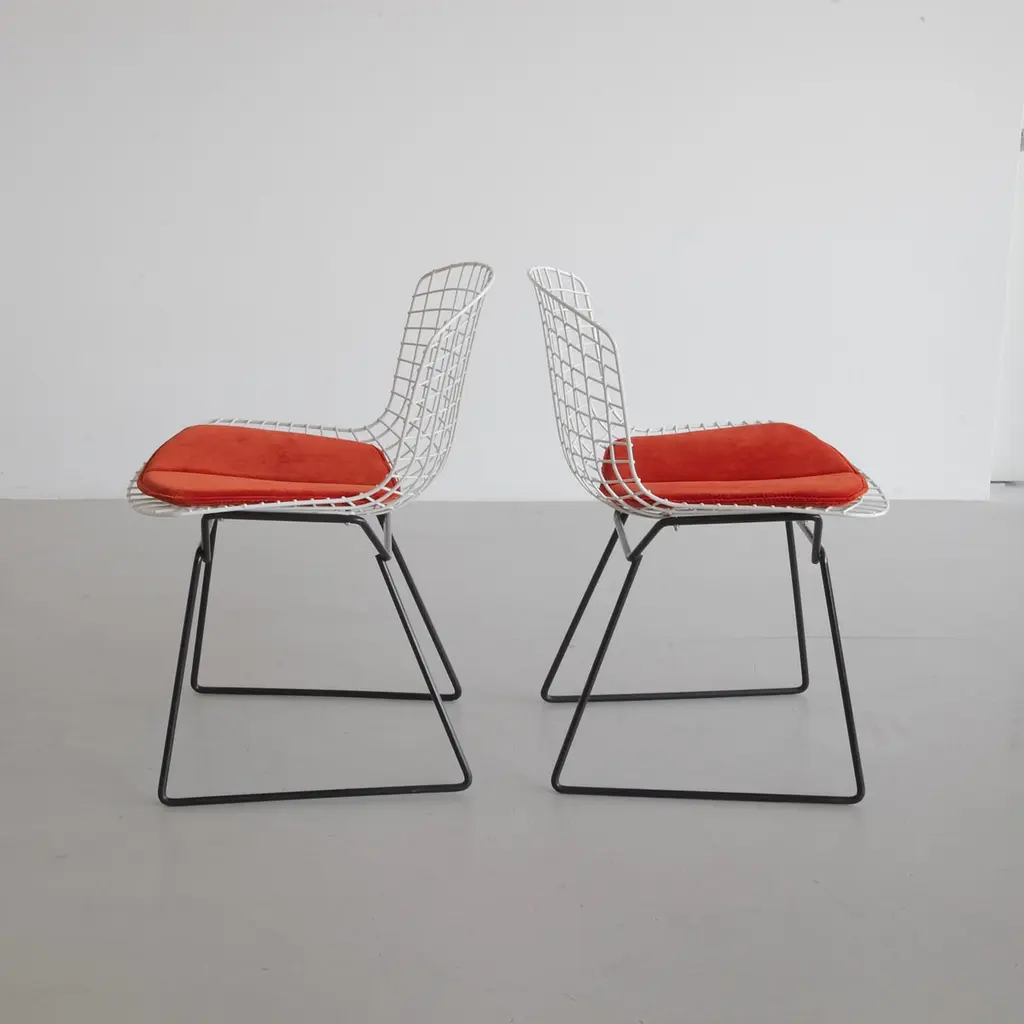 A set of black and white Side Chairs, designed by Harry Bertoia. U.S.A., Knoll International, 1970s.Vintage set of side chairs with burnt orange-coloured velvet pads. The Bertoia Side Chair, originally designed in 1952) is one of the iconic designs by Harry Bertoia, who was not only a furniture designer but also a sculptor.Seat height: 46cmCondition: Good vintage condition.