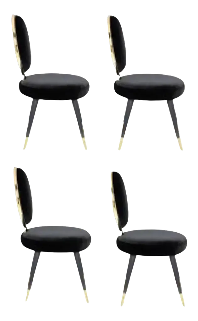 Set of 4 graceful dining chairs, Royal StrangerDimensions: 95 x 54 x 54 cmMaterials: Blossom pink velvet upholstery with stainless steel coated in brass frame elevated by lacquered wood legs and brass feet covers.Available in: Mint green, light pink, royal green, royal redA round and sweet shaped chair involved in a graceful glamour of gold contour. The perfect addiction for an elegant and sweet Ambience.Royal Stranger is an exclusive furniture brand determined to bring you the best unique pieces of art and design.Fusing design, art and the best craftsmanship, they strive to deliver the best state of the handmade art furniture. The design team works every day to create meaningful products that represent values such as passion, function, aesthetics and know-how. Values that are meant to represent Royal Stranger’s DNA. This dedication is present at all stages of production and the combination of craftsmanship and innovative design contributes toour final purpose: to produce certified high-quality products, made with passion and expertise and using royal materials such as gold leaf, rich woods and high quality lacquers.It was in 2013, as an architects, that Sofia Santos & Rui Santos started to push the boundaries of innovation in several retail design concepts for some of the best stores in Portugal. This will has always been present in their work, and that’s how the brand was born.