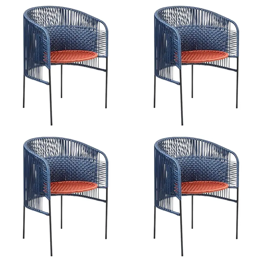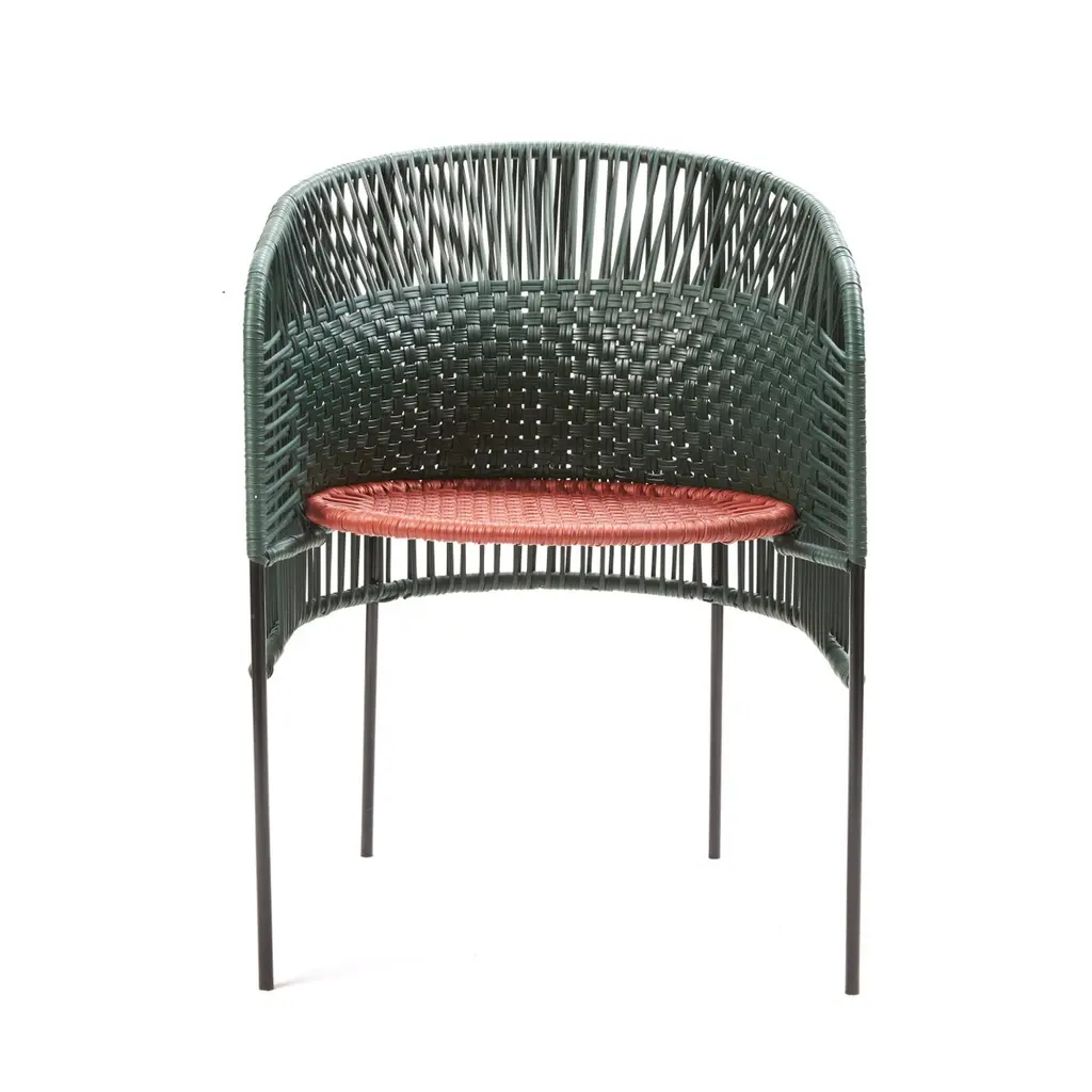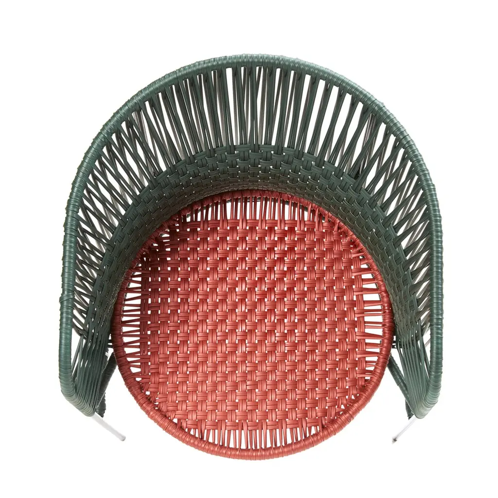 Set of 4 Green Caribe chic dining chair by Sebastian HerknerMaterials: Galvanized and powder-coated tubular steel. PVC strings are made from recycled plastic.Technique: Made from recycled plastic and weaved by local craftspeople in Colombia. Dimensions: W 55.3 x D 56 x H 75 cm Also available colors: Blue/ mint/ black, mint/ green/ black, orange/ rose/ curry, green/ rose/ curry. The Caribe Chic dining chair is an elegant design by Sebastian Herkner and can be used inside and outdoors. It’s part of our Caribe Chic collection, featuring an intricate hand-woven webbing in contrasting earthy, muted shades. The pieces and colors are inspired by the incredible nature of the Colombian Huila region where the serene Tatacoa desert meets the powerful Rio Magdalena.Each armchair is made in Santa Marta, a city on the Caribbean coast of Colombia, by local craftspeople. They weave the PVC strings, which are made from recycled plastic, around a powder-coated tubular steel frame. The weaving technique the artesanos and artesanas use are called Momposino, a traditional method known for intricate patterns. Just the preparation of all the materials takes ten days, while the production of each armchair takes three days.German designer Sebastian Herkner is a long-term collaborator of Ames and has visited Colombia multiple times to experience the country’s cities, nature and people first hand. He also visited many of the ateliers that Ames has partnered with to learn about the unique traditional crafts of Colombia's regions. A sought-after contemporary designer and recipient of many industry awards, he has worked with many international design brands, creating intriguing pieces that showcase his intuition for interesting material, color, and texture combinations.