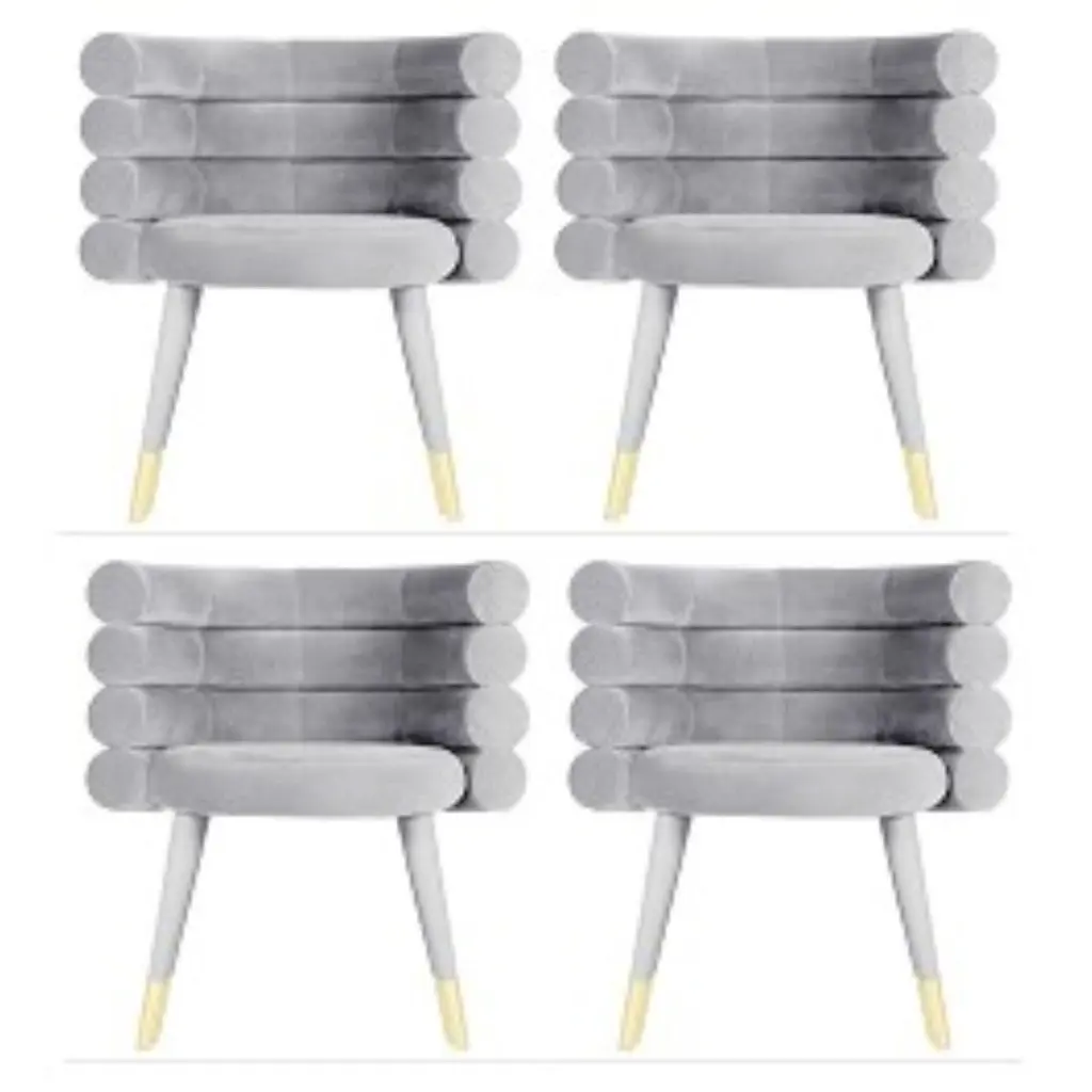 Set of 4 grey marshmallow dining chairs, Royal StrangerDimensions: 78 x 70 x 60 cmMaterials: Velvet upholstery and brassAvailable in: Mint green, light pink, royal green and royal redRoyal Stranger is an exclusive furniture brand determined to bring you the best unique pieces of art and design.Fusing design, art and the best craftsmanship, they strive to deliver the best state of the handmade art furniture. The design team works every day to create meaningful products that represent values such as passion, function, aesthetics and know-how. Values that are meant to represent Royal Stranger’s DNA. This dedication is present at all stages of production and the combination of craftsmanship and innovative design contributes toour final purpose: To produce certified high-quality products, made with passion and expertise and using royal materials such as gold leaf, rich woods and high quality lacquers.It was in 2013, as an architects, that Sofia Santos & Rui Santos started to push the boundaries of innovation in several retail design concepts for some of the best stores in Portugal. This will has always been present in their work, and that’s how the brand was born.