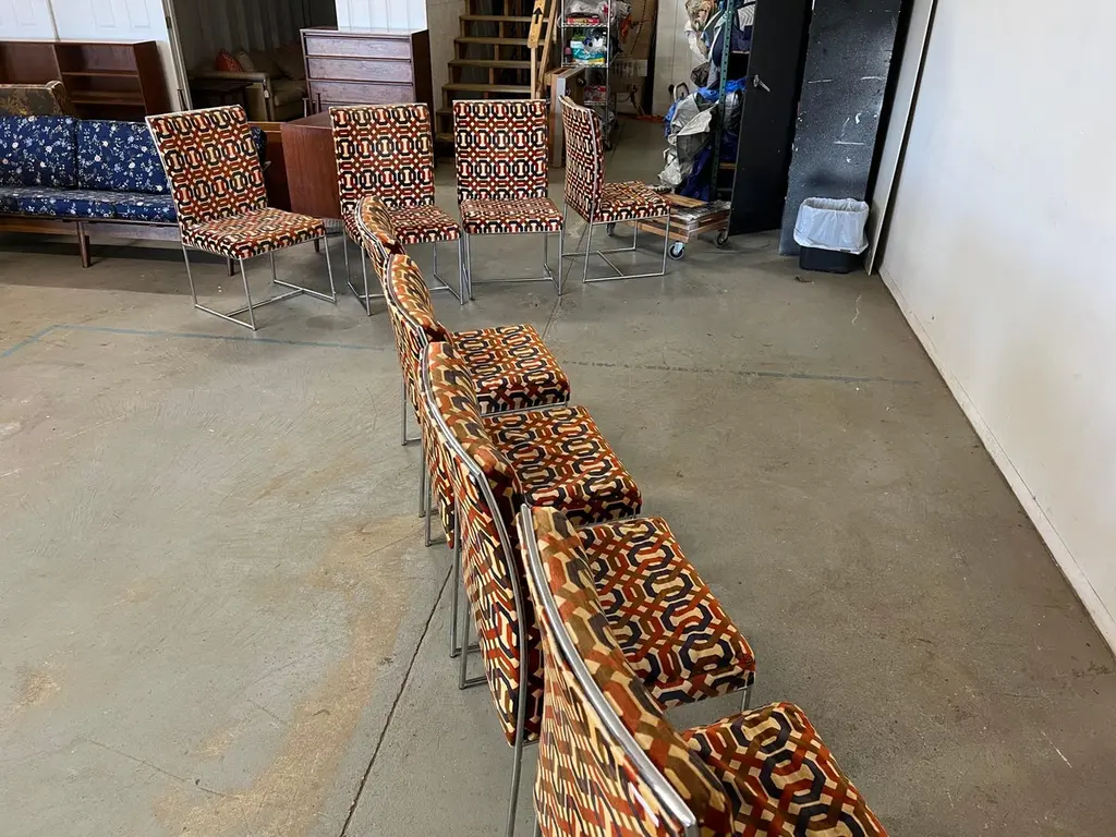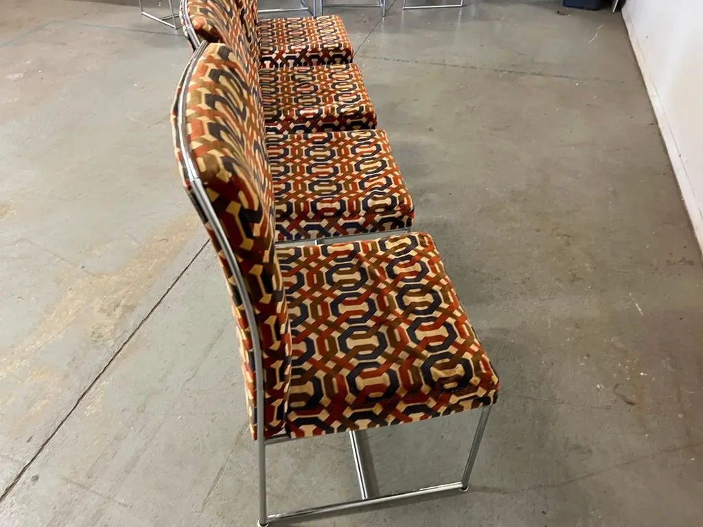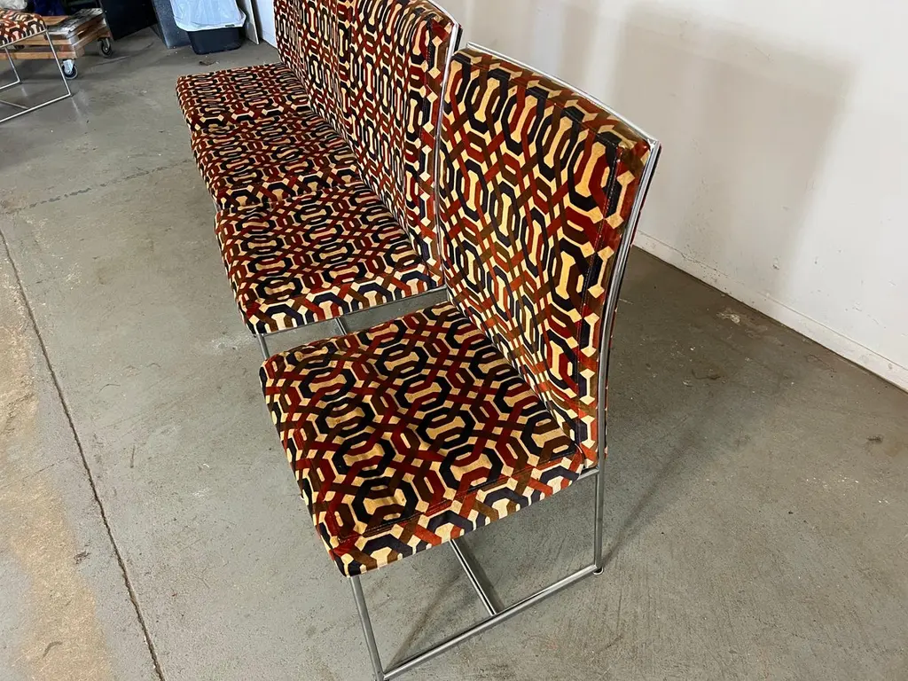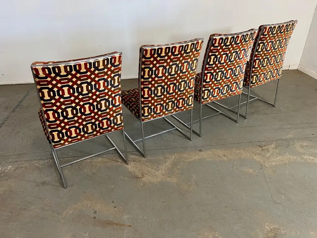Offered is a vintage set of 4 Mid-Century Modern dining chairs by Milo Baughman for Thayer Coggin. These beautiful chairs have chrome framed bases and original Velvet geometric upholstery. The Chrome is tublular. These chairs make a statement and will complete any design project. We have 2 sets of four chairs each( total available). In good condition for their age, but need to be reupholstered. Has some stains and wear in upholstery. They are signed and dated 1978. . Still a wonderful set that will make an excellent addition to your home! Check out our other listings for matching chrome dining tables plus more by Milo Baughman and other Classic Mid-Century Modern designers.Approximate dimensions:21" W x 23" D x 37" Hseat height 18".