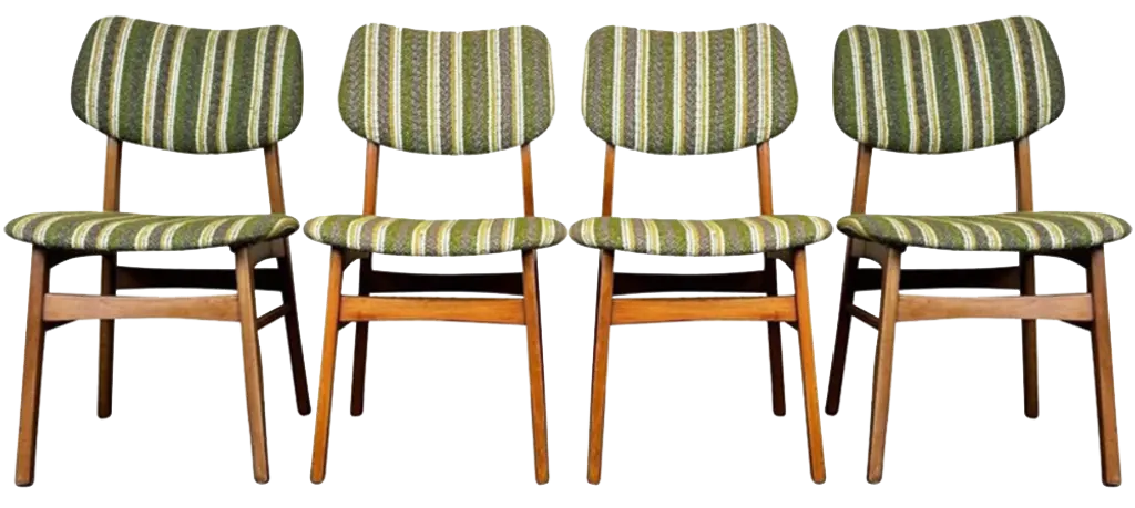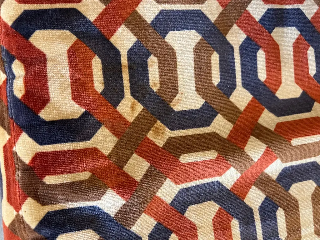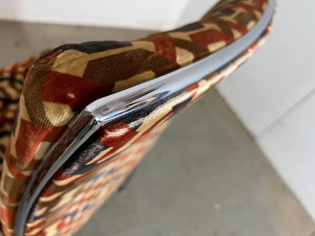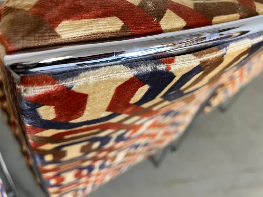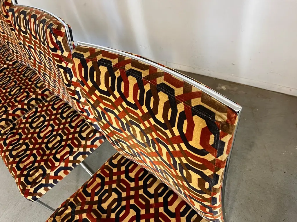 Offered is a vintage set of 4 Mid-Century Modern dining chairs by Milo Baughman for Thayer Coggin. These beautiful chairs have chrome framed bases and original Velvet geometric upholstery. The Chrome is tublular. These chairs make a statement and will complete any design project. We have 2 sets of four chairs each( total available). In good condition for their age, but need to be reupholstered. Has some stains and wear in upholstery. They are signed and dated 1978. . Still a wonderful set that will make an excellent addition to your home! Check out our other listings for matching chrome dining tables plus more by Milo Baughman and other Classic Mid-Century Modern designers.Approximate dimensions:21" W x 23" D x 37" Hseat height 18".