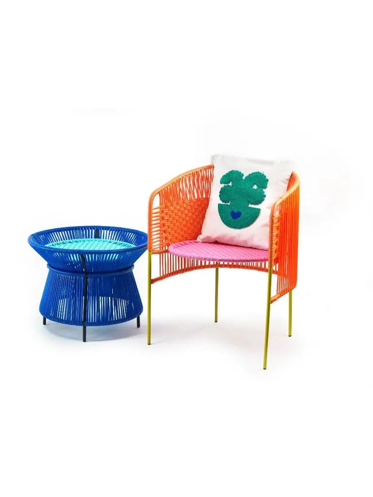 Set of 4 Mint caribe dining chair by Sebastian HerknerMaterials: Galvanized and powder-coated tubular steel. PVC strings are made from recycled plastic.Technique: Made from recycled plastic and weaved by local craftspeople in Colombia. Dimensions: W 55.3 x D 56 x H 75 cm Also available colors: blue/ mint/ black, mint/ green/ black, orange/ rose/ curry, green/ rose/ curry. The charming Caribe Dining Chair is a colorful design for seating arrangements inside and outdoors. It’s part of the Caribe collection, designed by Sebastian Herkner for Ames. The German designer visited Colombia together with Ames founder Ana Maria Calderon-Kayser and translated the vibrancy and spirit of the country’s people and traditions into joyful, modern furniture pieces defined by clean lines, strong colors, and the hand-woven webbing.Each chair is made in Santa Marta, a city on the Caribbean coast of Colombia, by local craftspeople. They weave the PVC strings, which are made from recycled plastic, around the steel frame. The weaving technique the artesanos and artesanas use are called Momposino, a traditional method known for intricate patterns. Just the preparation of all the materials takes ten days, while the production of each chair takes three days.German designer Sebastian Herkner is a long-term collaborator of Ames and has visited Colombia multiple times to experience the country’s cities, nature and people first hand. He also visited many of the ateliers that Ames has partnered with to learn about the unique traditional crafts of Colombia's regions. A sought-after contemporary designer and recipient of many industry awards, he has worked with many international design brands, creating intriguing pieces that showcase his intuition for interesting material, color, and texture combinations.
