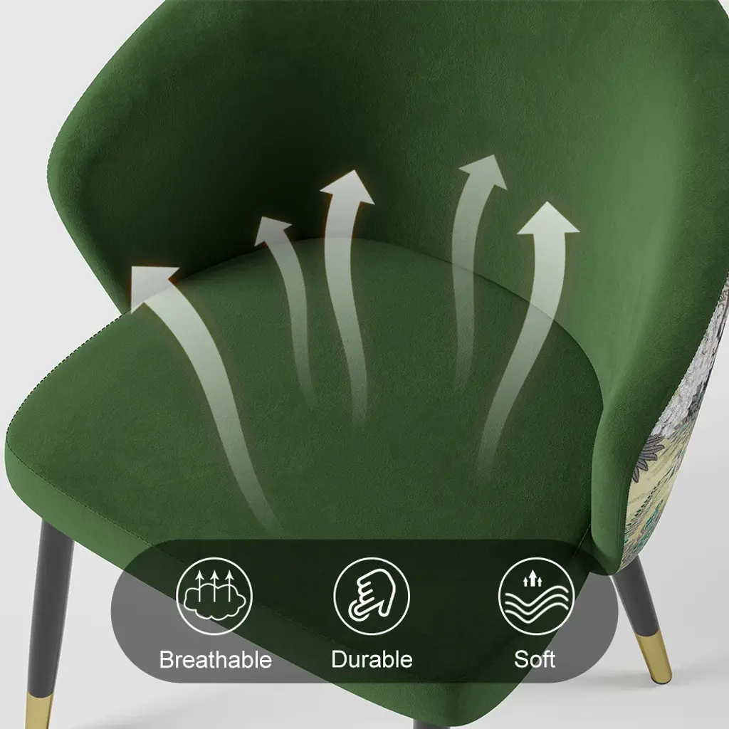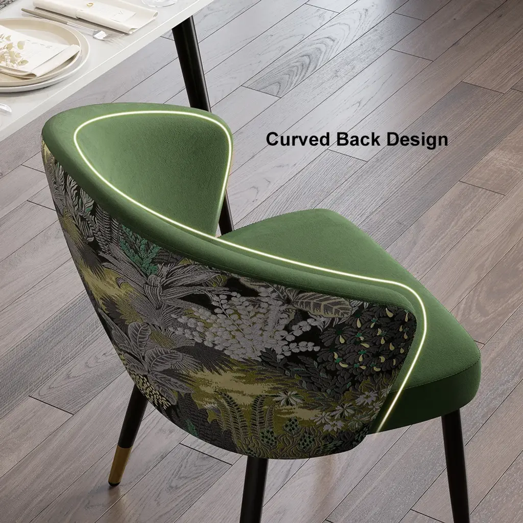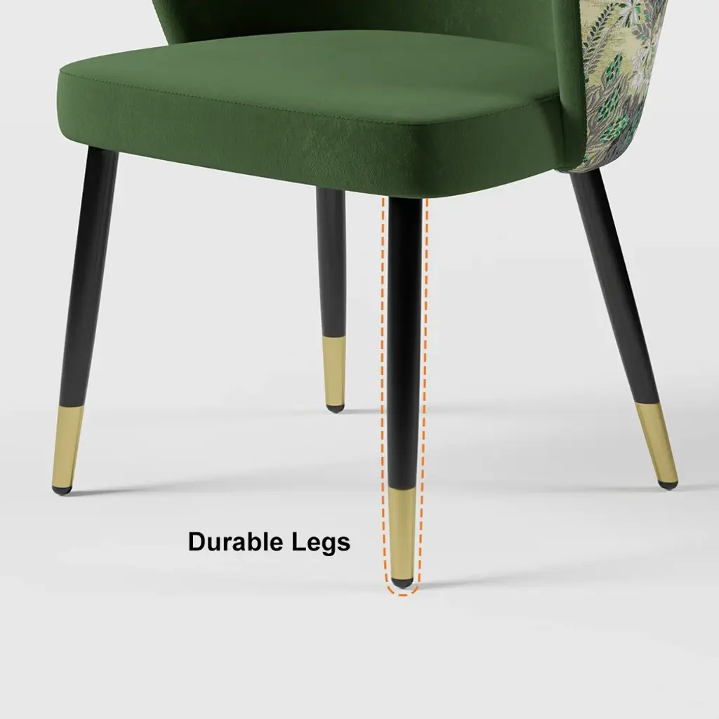 Add luxury to your dining room with this set of green velvet dining chairs. These luxurious chairs have a modern solid-back design draped in sumptuous velvet for both style and comfort. Strong metal and carbon steel legs in black and gold support these chairs to give any dining space a chic contrast and an utterly modern style. For gathering or not, these stylish yet very durable chairs are timeless for your home.