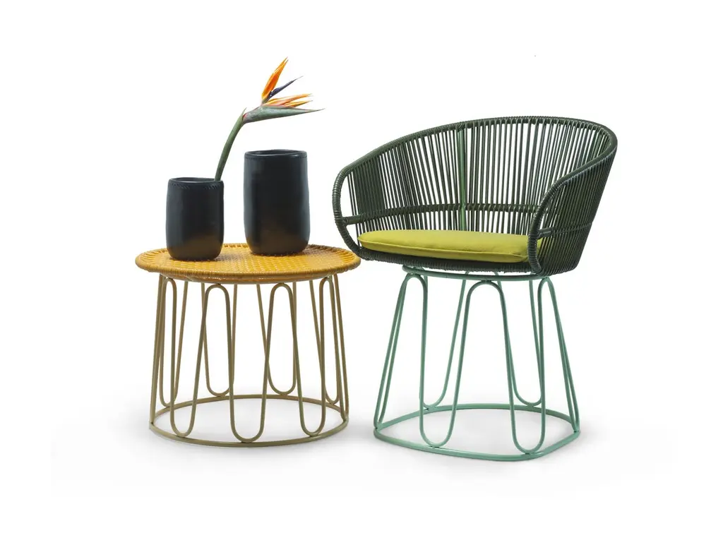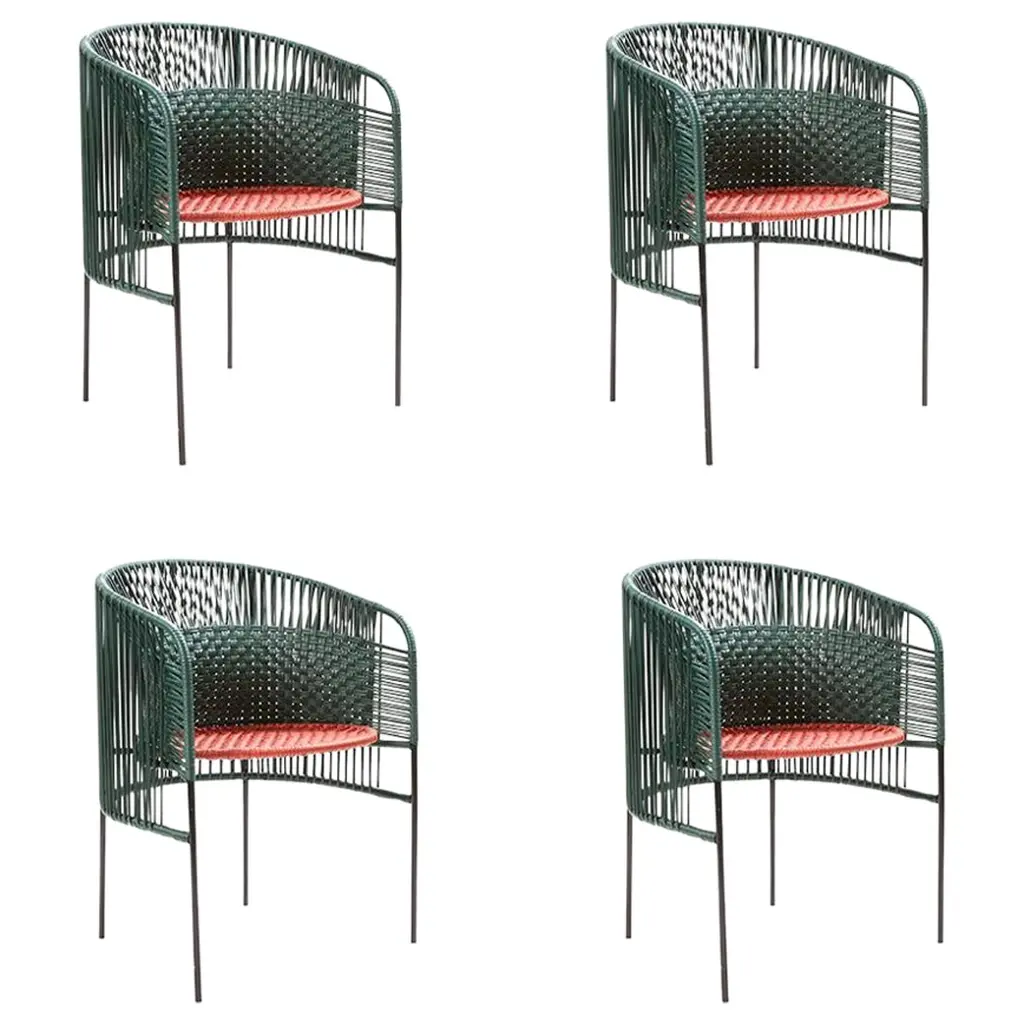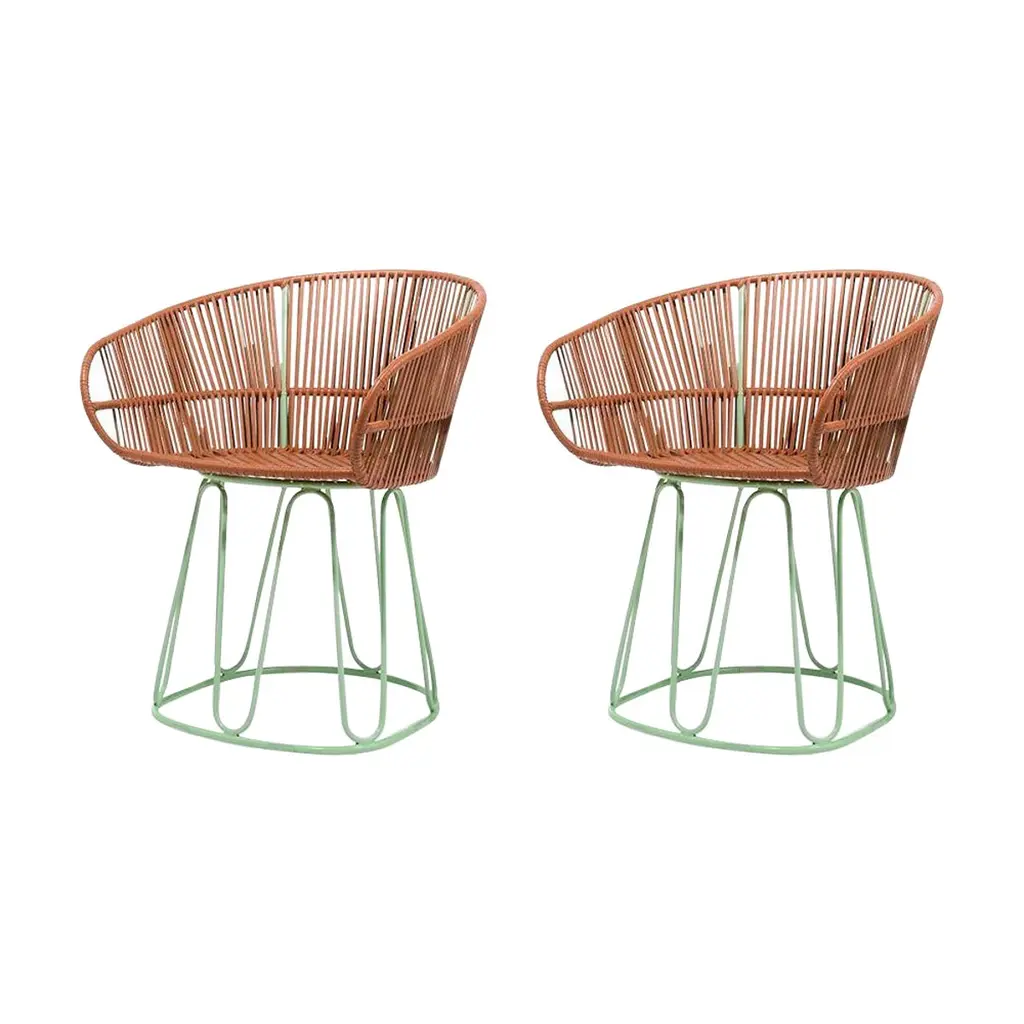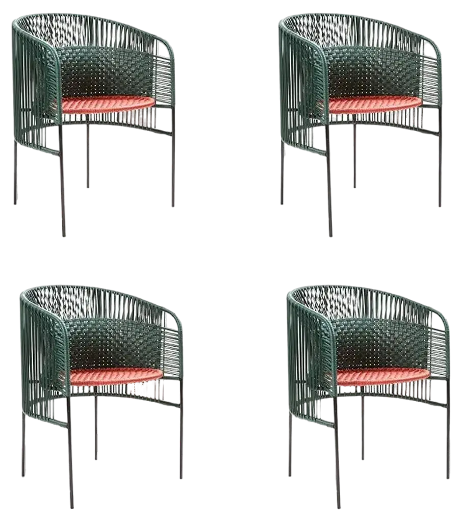 Set of 4 Olive Circo dining chair by Sebastian HerknerMaterials: Galvanized and powder-coated tubular steel. PVC strings.Technique: Made from recycled plastic. Weaved by local craftspeople in Colombia. Dimensions: W 61.5 x D 56.5 x H 77.5 cm Available in colors: olive - menta, honey - sand, purple - carne, black matt - black.Featuring gentle curves and intricate webbing, the Circo Dining Chair adds a touch of colorful elegance to indoor and outdoor spaces. A design by Sebastian Herkner, the comfortable and lightweight chair captures Colombia's vibrancy and spirit with its intriguing color contrast of webbing and steel frame. Additional seat pads covered with premium fabrics by Nya Nordiska, suitable for indoor use or outdoor use, are available upon request.Each chair is made in Santa Marta, a city on the Caribbean coast of Colombia, by local craftspeople. They weave the PVC strings, which are made from recycled plastic, around a powder-coated tubular steel frame. The weaving technique the artesanos and artesanas use are called Momposino, a traditional method known for intricate patterns. Just the preparation of all the materials takes 20 days, while the production of each chair takes two days.German designer Sebastian Herkner is a long-term collaborator of Ames and has visited Colombia multiple times to experience the country’s cities, nature and people first hand. He also visited many of the ateliers that Ames has partnered with to learn about the unique traditional crafts of Colombia's regions. A sought-after contemporary designer and recipient of many industry awards, he has worked with many international design brands, creating intriguing pieces that showcase his intuition for interesting material, color, and texture combinations.