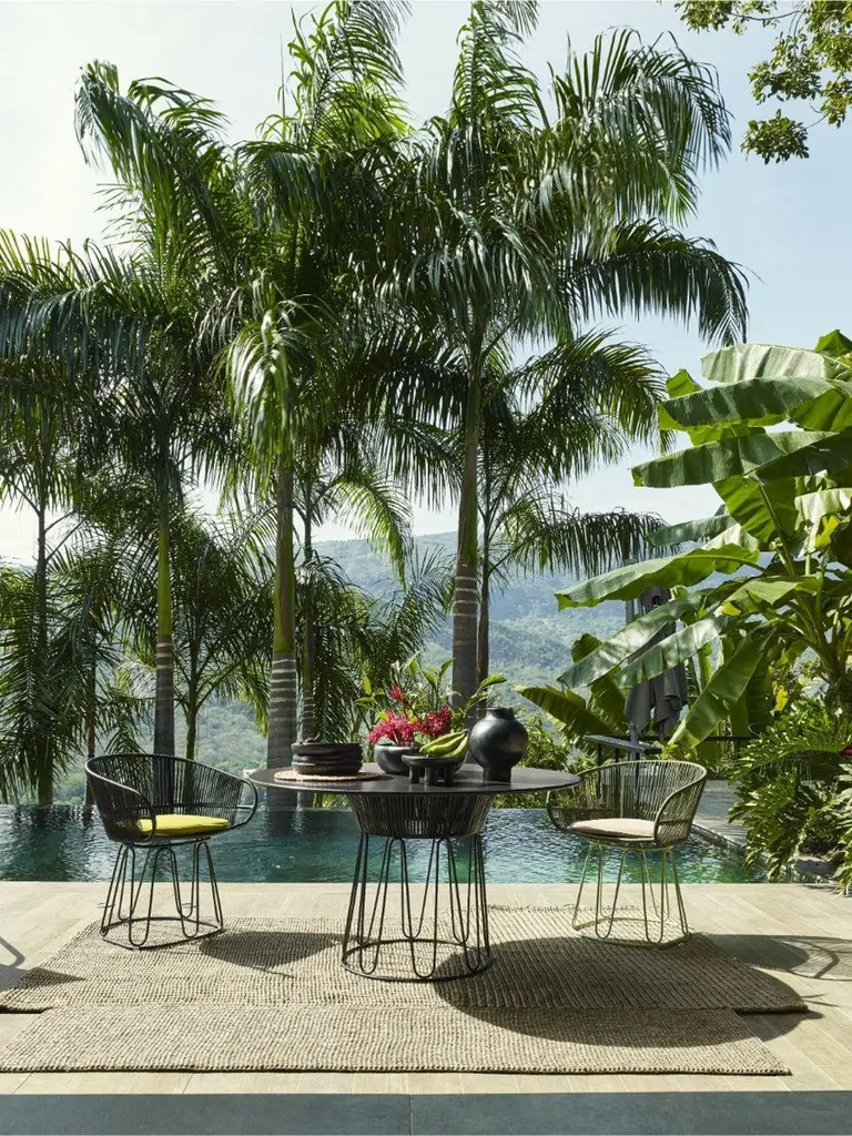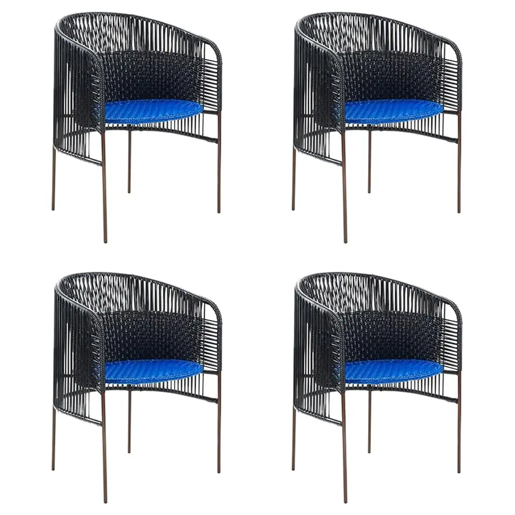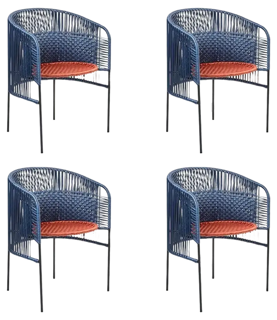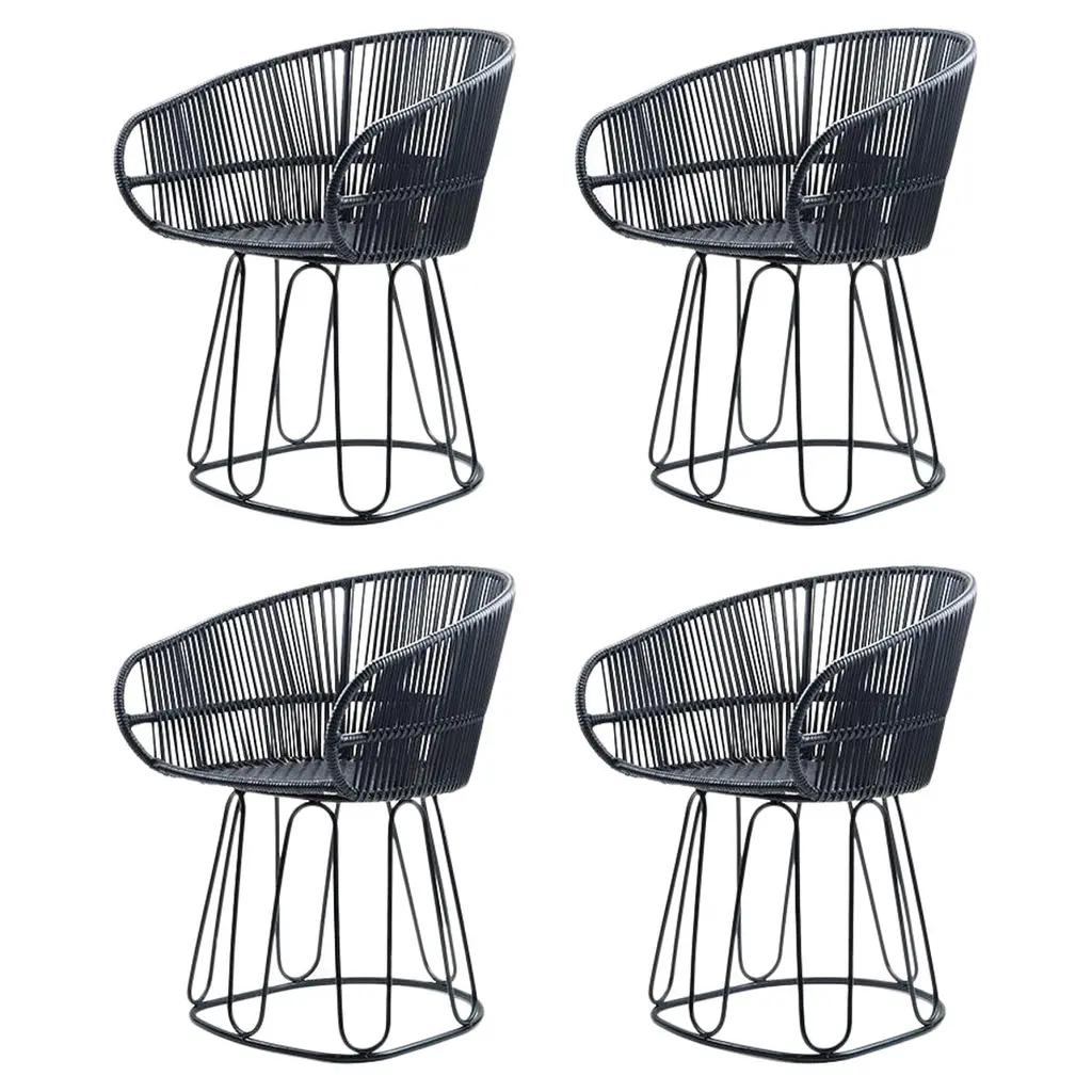 Set of 4 Olive Circo dining chair by Sebastian HerknerMaterials: Galvanized and powder-coated tubular steel. PVC strings.Technique: Made from recycled plastic. Weaved by local craftspeople in Colombia. Dimensions: W 61.5 x D 56.5 x H 77.5 cm Available in colors: olive - menta, honey - sand, purple - carne, black matt - black.Featuring gentle curves and intricate webbing, the Circo Dining Chair adds a touch of colorful elegance to indoor and outdoor spaces. A design by Sebastian Herkner, the comfortable and lightweight chair captures Colombia's vibrancy and spirit with its intriguing color contrast of webbing and steel frame. Additional seat pads covered with premium fabrics by Nya Nordiska, suitable for indoor use or outdoor use, are available upon request.Each chair is made in Santa Marta, a city on the Caribbean coast of Colombia, by local craftspeople. They weave the PVC strings, which are made from recycled plastic, around a powder-coated tubular steel frame. The weaving technique the artesanos and artesanas use are called Momposino, a traditional method known for intricate patterns. Just the preparation of all the materials takes 20 days, while the production of each chair takes two days.German designer Sebastian Herkner is a long-term collaborator of Ames and has visited Colombia multiple times to experience the country’s cities, nature and people first hand. He also visited many of the ateliers that Ames has partnered with to learn about the unique traditional crafts of Colombia's regions. A sought-after contemporary designer and recipient of many industry awards, he has worked with many international design brands, creating intriguing pieces that showcase his intuition for interesting material, color, and texture combinations.