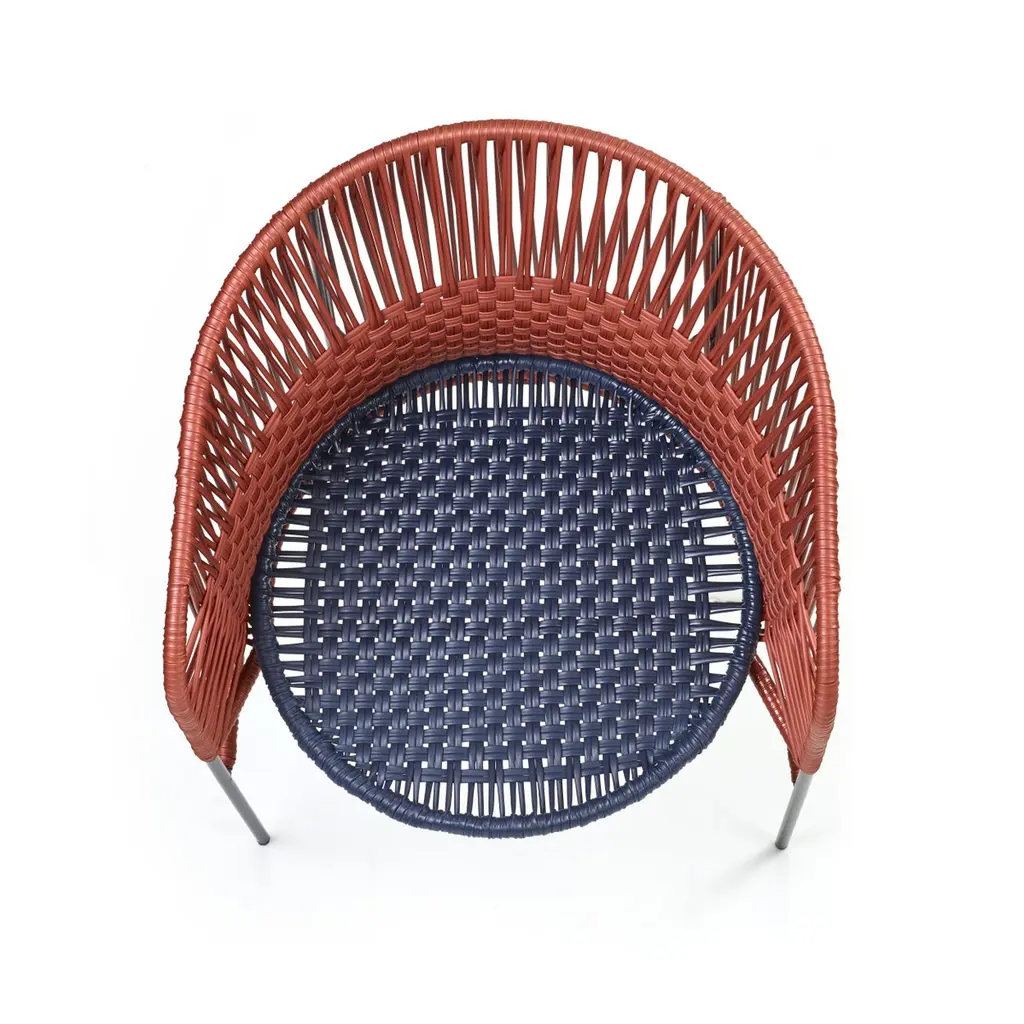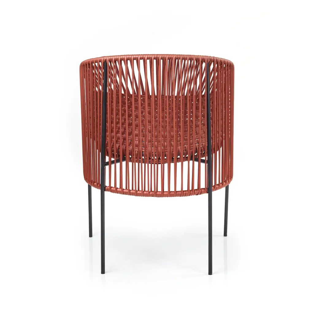 Set of 4 orange Caribe chic dining chair by Sebastian Herkner.Materials: galvanized and powder-coated tubular steel. PVC strings are made from recycled plastic.Technique: made from recycled plastic and weaved by local craftspeople in Colombia. Dimensions: W 55.3 x D 56 x H 75 cm.Also available colors: blue/ mint/ black, mint/ green/ black, orange/ rose/ curry, green/ rose/ curry. The Caribe Chic dining chair is an elegant design by Sebastian Herkner and can be used inside and outdoors. It’s part of our Caribe Chic collection, featuring an intricate hand-woven webbing in contrasting earthy, muted shades. The pieces and colors are inspired by the incredible nature of the Colombian Huila region where the serene Tatacoa desert meets the powerful Rio Magdalena.Each armchair is made in Santa Marta, a city on the Caribbean coast of Colombia, by local craftspeople. They weave the PVC strings, which are made from recycled plastic, around a powder-coated tubular steel frame. The weaving technique the artesanos and artesanas use are called Momposino, a traditional method known for intricate patterns. Just the preparation of all the materials takes ten days, while the production of each armchair takes three days.German designer Sebastian Herkner is a long-term collaborator of Ames and has visited Colombia multiple times to experience the country’s cities, nature and people first hand. He also visited many of the ateliers that Ames has partnered with to learn about the unique traditional crafts of Colombia's regions. A sought-after contemporary designer and recipient of many industry awards, he has worked with many international design brands, creating intriguing pieces that showcase his intuition for interesting material, color, and texture combinations.