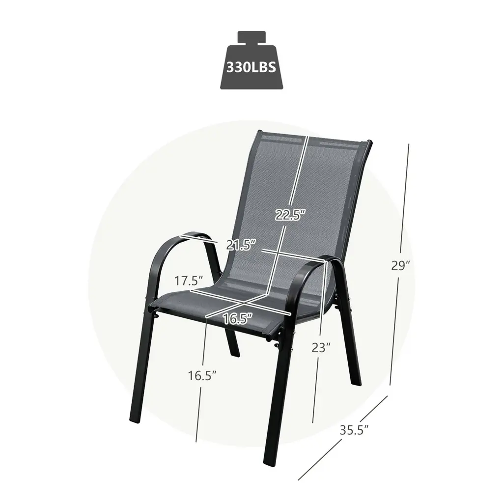 These patio stacking chairs will be a great addition to any outdoor place! If you choose these outdoor dining chairs, they will bring you optimal comfort because of the breathable fabric, incline backrests, cozy armrests and wide seats. Moreover, the perfect seat height from the ground (16.5") makes these patio chairs serve as outdoor dining chairs perfectly. When you sit on the armchair, the wear-resistant fabric and heavy-duty steel frame ensure long service time and strong stability. If you need to store them, just stack these armchairs together, greatly reducing storage space. Features:Specification