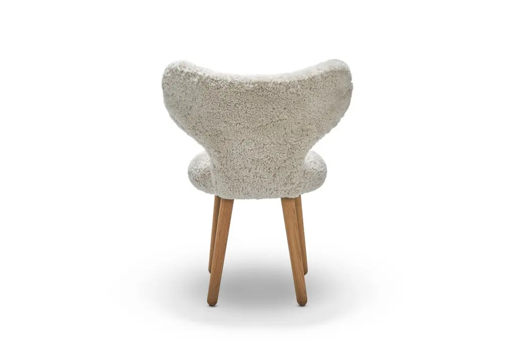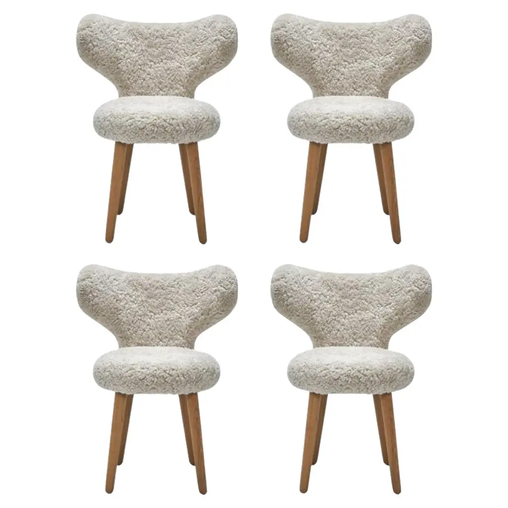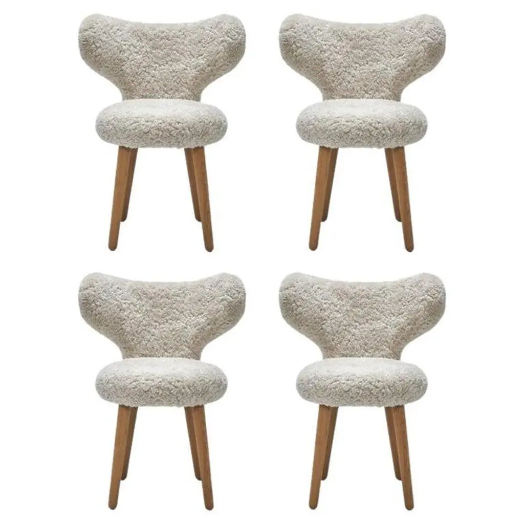 Set of 4 White WNG Chairs in Oak and Sheepskin Upholstery by Mazo DesignDimensions: W 60 x D 50 x H 76 cmMaterials: oak, sheepskin. Also available: DAW/Royal, KVADRAT/Hallingdal & Fiord, BUTE/Storr, KVADRAT/ Vidar, DAW/Mcnutt, DEDAR/Artemidor.The WNG Chair’s rounded shape is puffed up with the upholstery, which enhances its childlike chubbiness, and invites you to sit, like a baby elephant tempting you to take a ride on its back. The wings that Magnus Læssøe Stephensen gave the stool became an element that continued to inspire not only his own designs in the coming years, but many other furniture designers. A signature/statement chair for the small stylish studios of the modern metropolis. Mazo produce and re-launch both the iconic international design classics, and the hidden gems that have only been produced in a small number in this design universe. We are serious about authenticity. We rely on it, as it is the core of our existence.Humbled to be trusted with the exclusive rights to manufacture and launch furniture by the Danish architect Magnus Læssøe Stephensen (1903-1984), we believe the most foresighted design can be created by embracing the experience of the past. We aim though to also stay true to the revolutionary part of this heritage. That is why we partner with new and dedicated designers, who not only share our fondness of the Nordic and Japanese aesthetics and understand the balance of beauty and function, but also create new designs, in quality materials, suited for humans and homes of our days.Mazo furniture is made for people, respectful of the past, yet mindful of the present. Looking for the balance between beauty and function.In a home. At the nearest café or restaurant. At the office or in the hotel lobby.