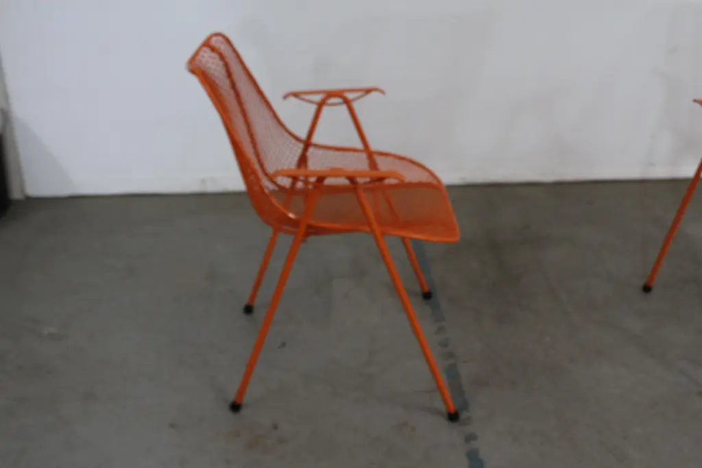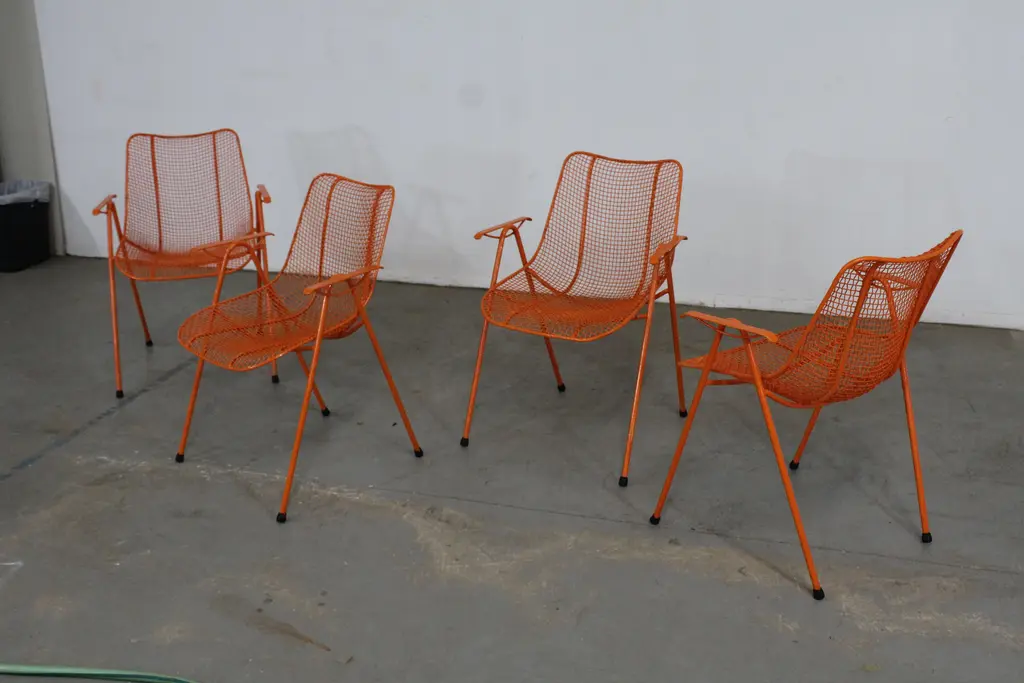 Set of 4 Mid-Century Danish Modern Woodard Sculptural Arm Chairs Offered is a set of 4 mid-century modern outdoor arm chairs designed by Russell Woodard (circa 1956) for the 'Sculptura' line. Features enameled and woven wrought iron. The chairs are structurally sound, in very good condition with new orange paint. Has some slight age wear and possible paint chips. Please review pictures carefully and message us for any additional info. They are not signed. See our other listings for more amazing mid-century modern finds! We have 2 sets of 4 available. Approximate Dimensions: 22.5" w x 24" d x 32" h seat height: 17 arm height: 25.5"