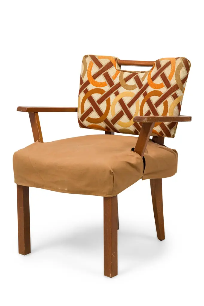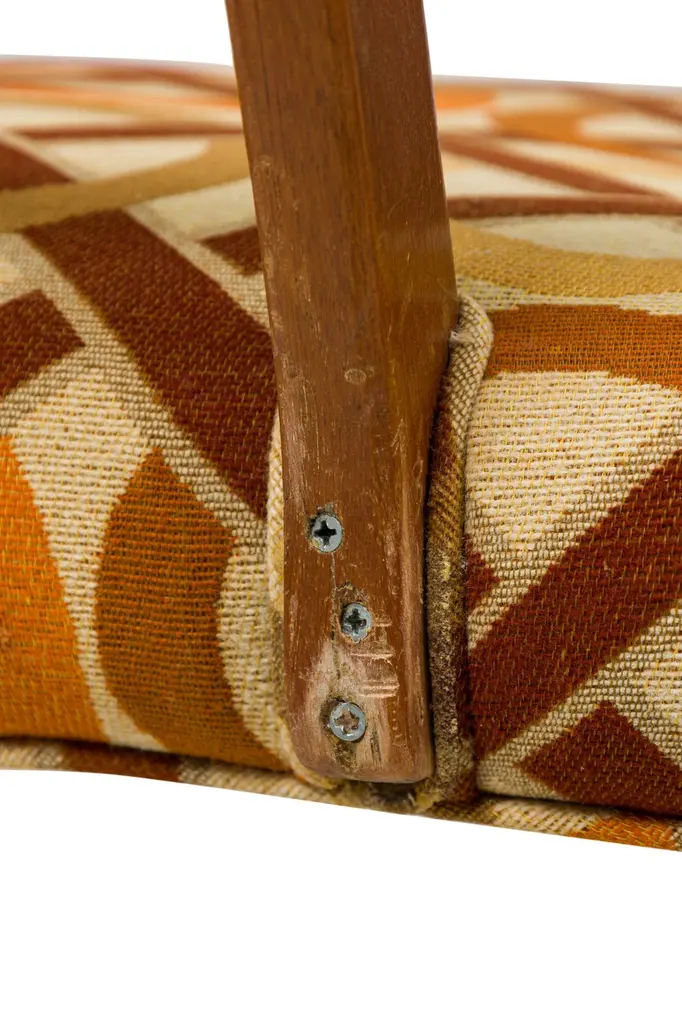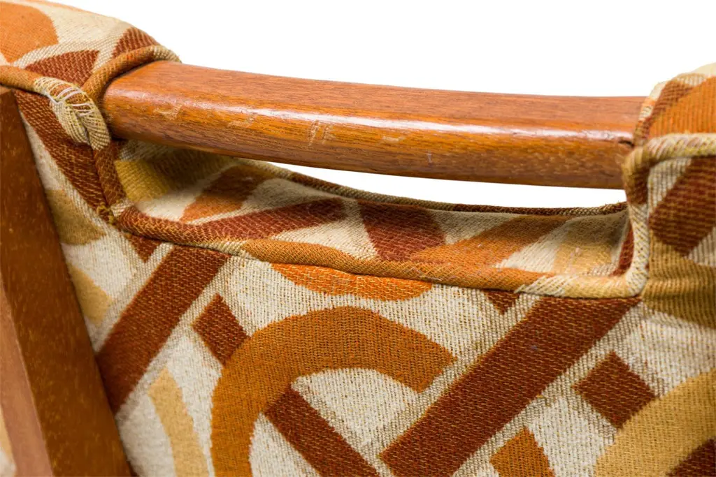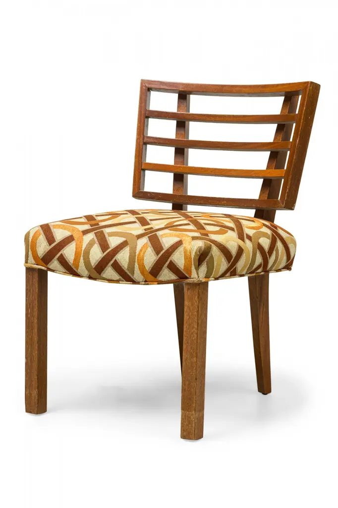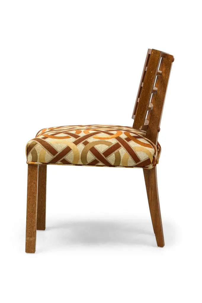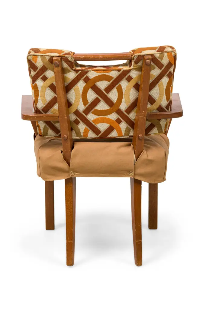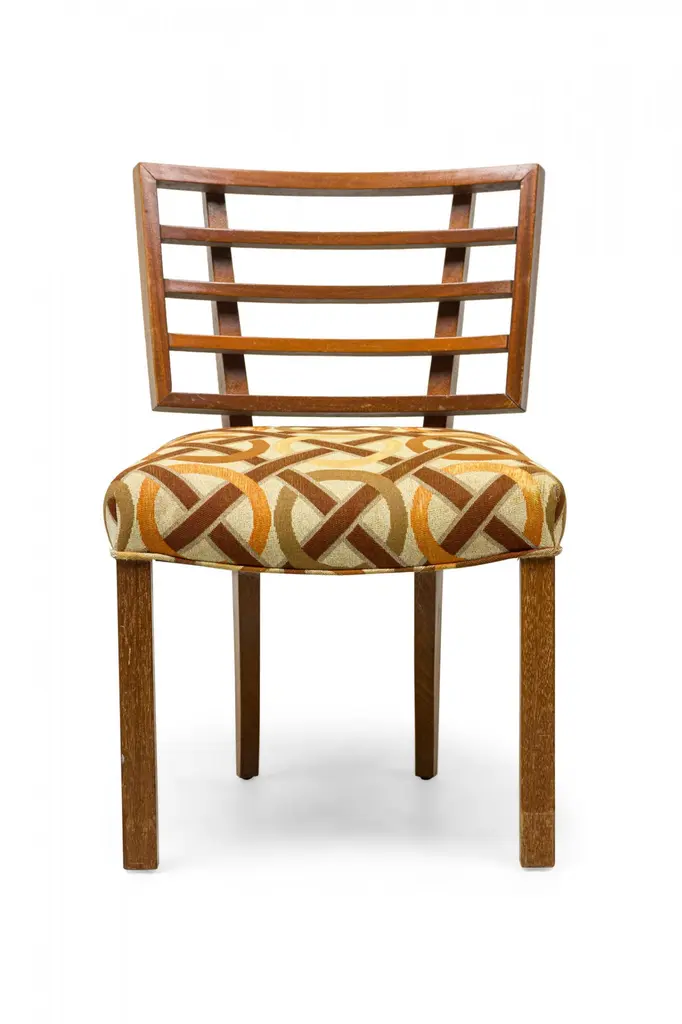 Set of 6 Mid-Century (1950s) American dining chairs comprised of 2 armchairs and 4 sides; the side chairs having open form horizontal slat backs and the armchairs having upholstered backs with a small cutout along the top rails, upholstered in a brown tone geometric patterned upholstery. (PAUL LASZLO) (PRICED AS Set) (Companion table: REG4079C)Some wear to finish on wood and upholstery.
