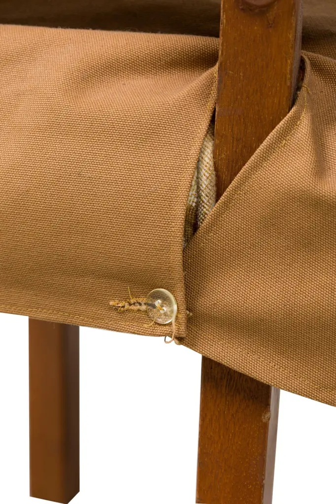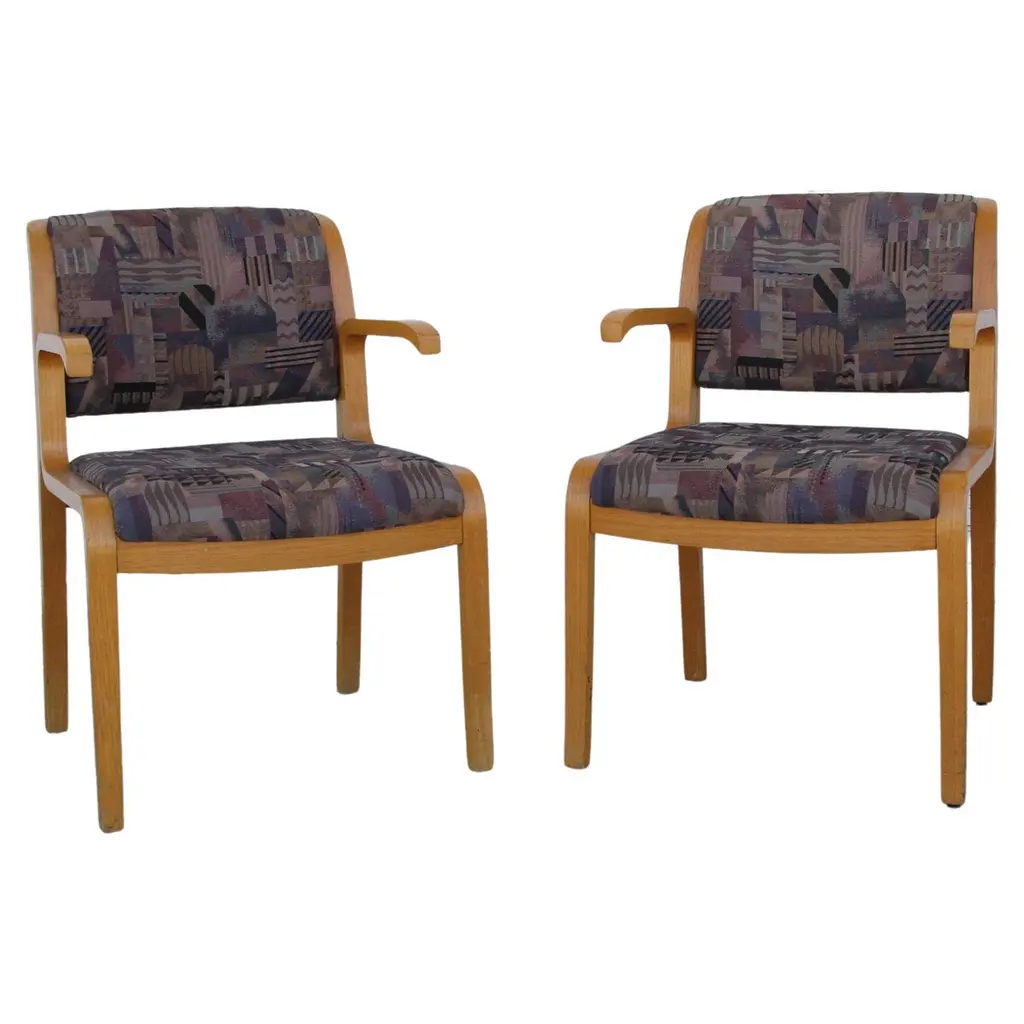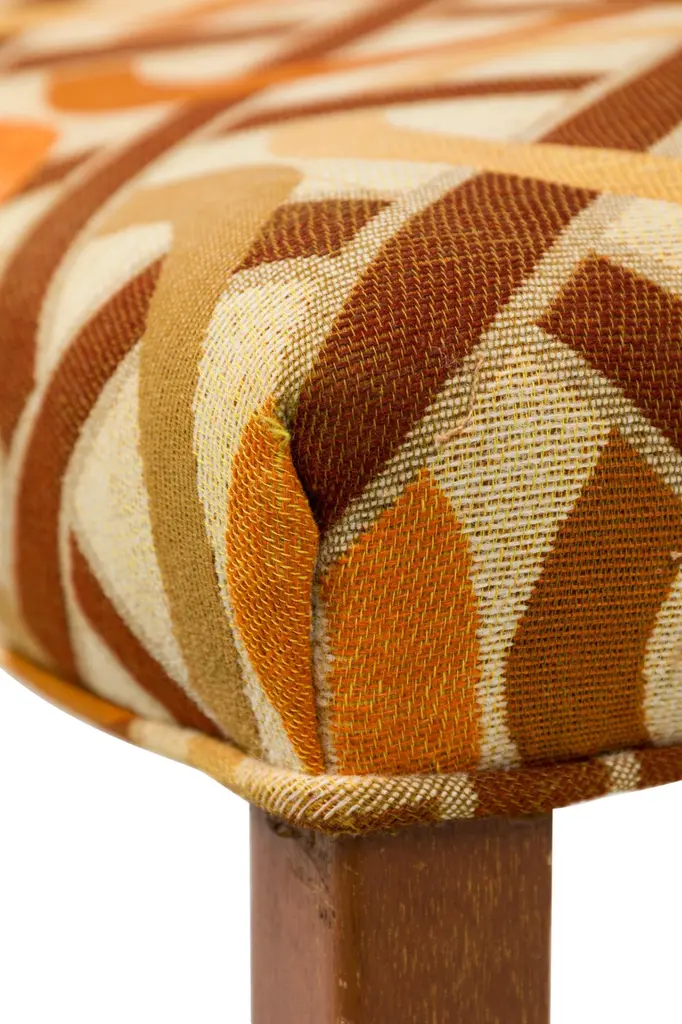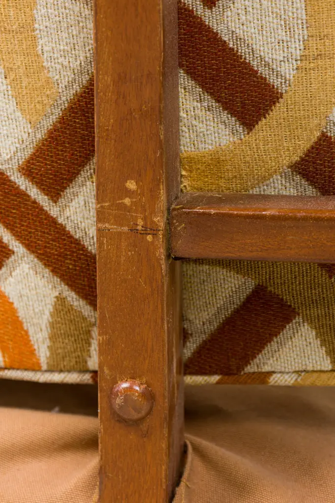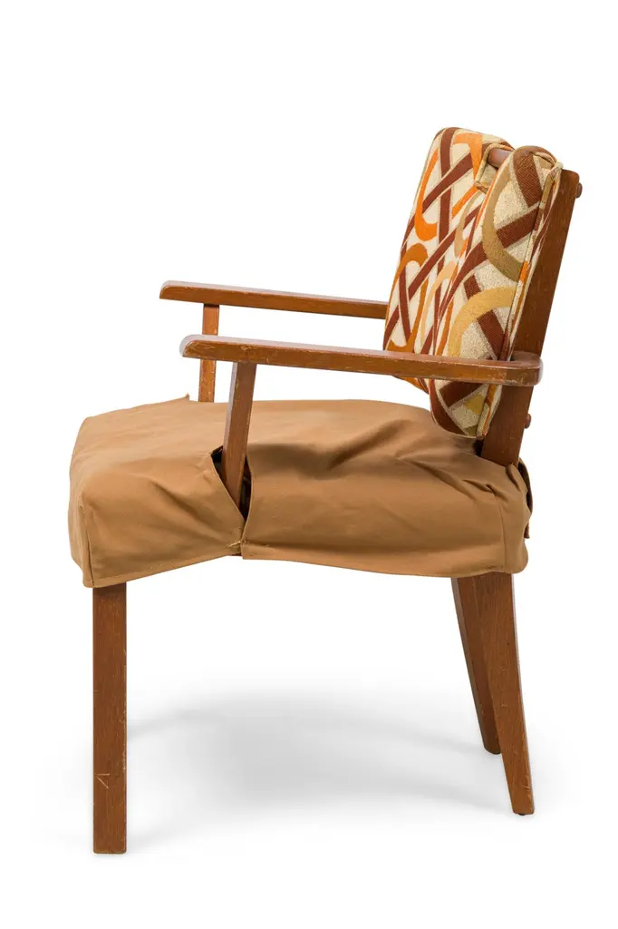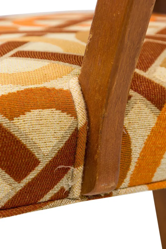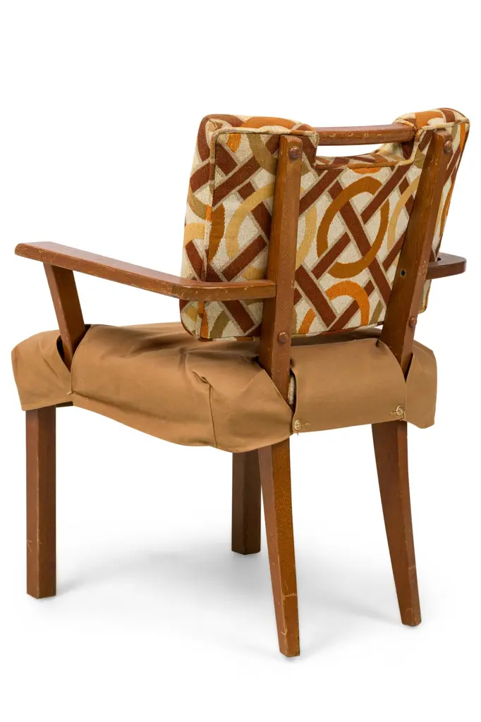 Set of 6 Mid-Century (1950s) American dining chairs comprised of 2 armchairs and 4 sides; the side chairs having open form horizontal slat backs and the armchairs having upholstered backs with a small cutout along the top rails, upholstered in a brown tone geometric patterned upholstery. (PAUL LASZLO) (PRICED AS Set) (Companion table: REG4079C)Some wear to finish on wood and upholstery.