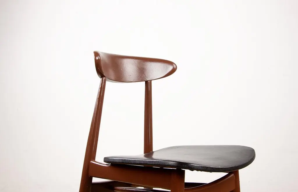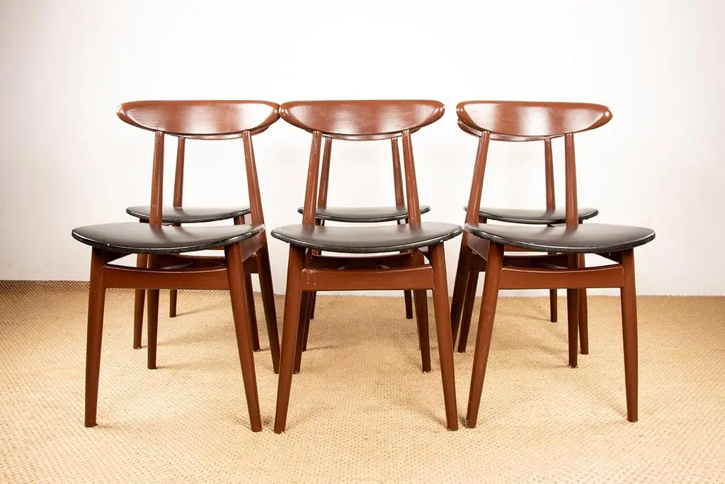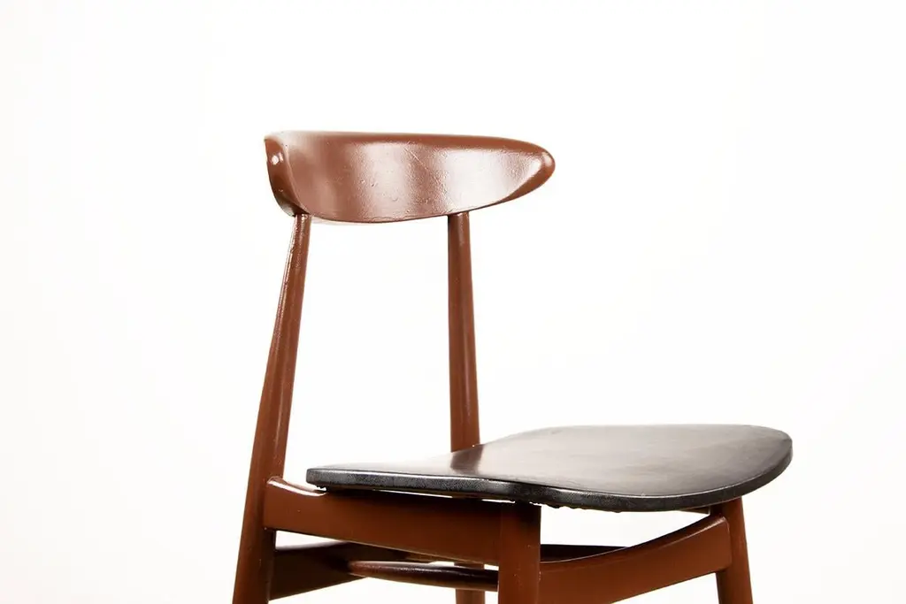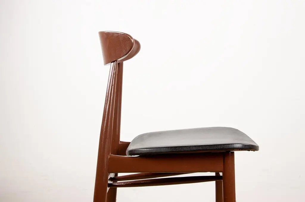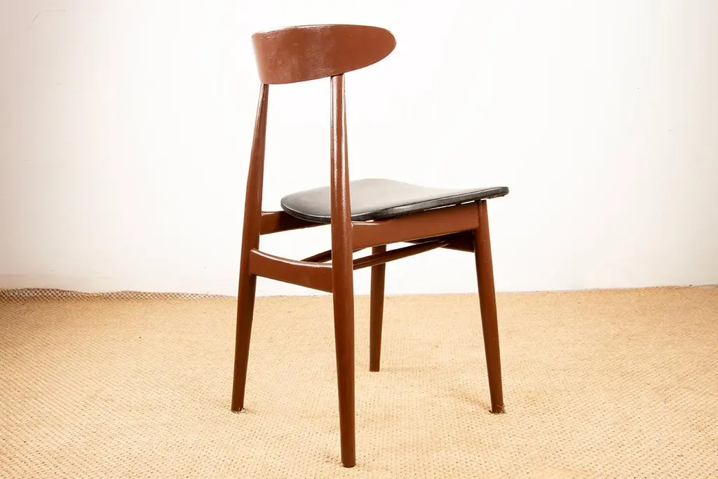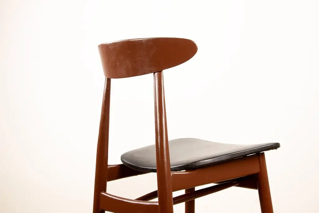 Beautiful vintage dining room chairs. Refinished in dark brown with elegant and comfortable airy seats. Scandinavian style. Very easy to repaint for a different color.Designer: Unknown.Manufacturer: Thonet.Origin: Germany.Period: 1960Condition: Very good condition.Dimensions: W: 40 cm – D: 42 cm – H: 75 cm – Seat height: 45 cm.Material: Dark brown lacquered wood and black leatherette.
