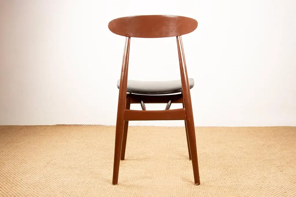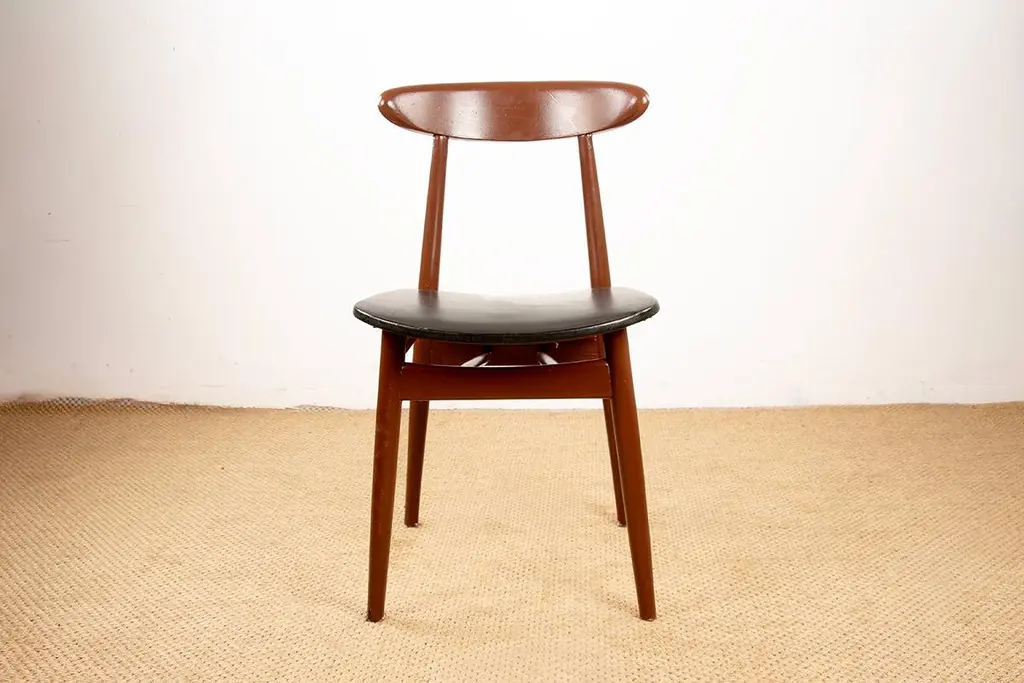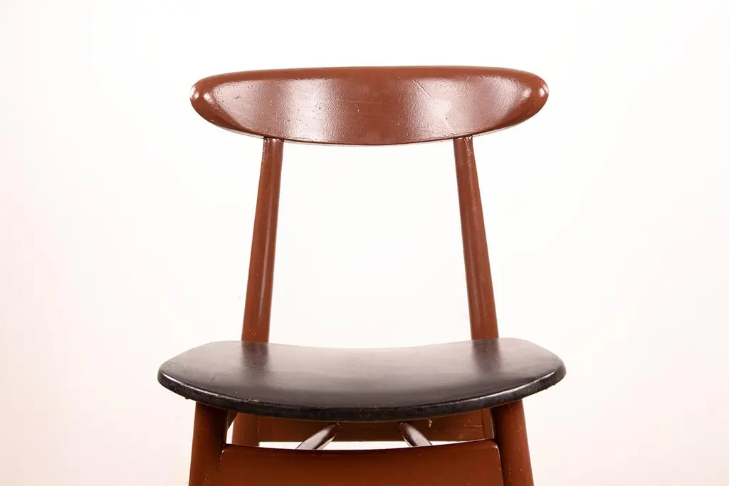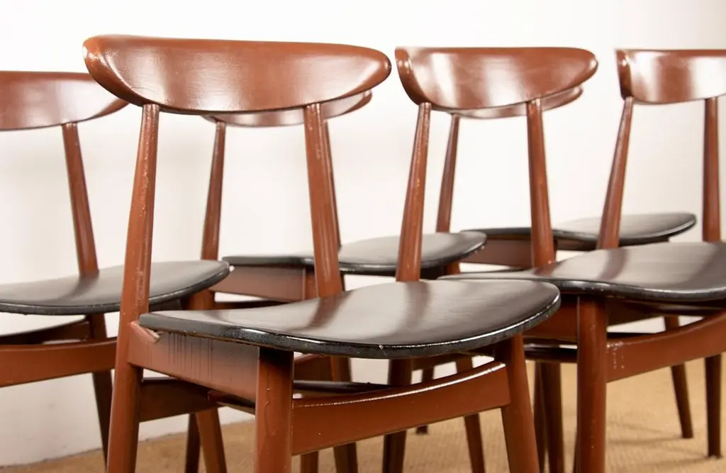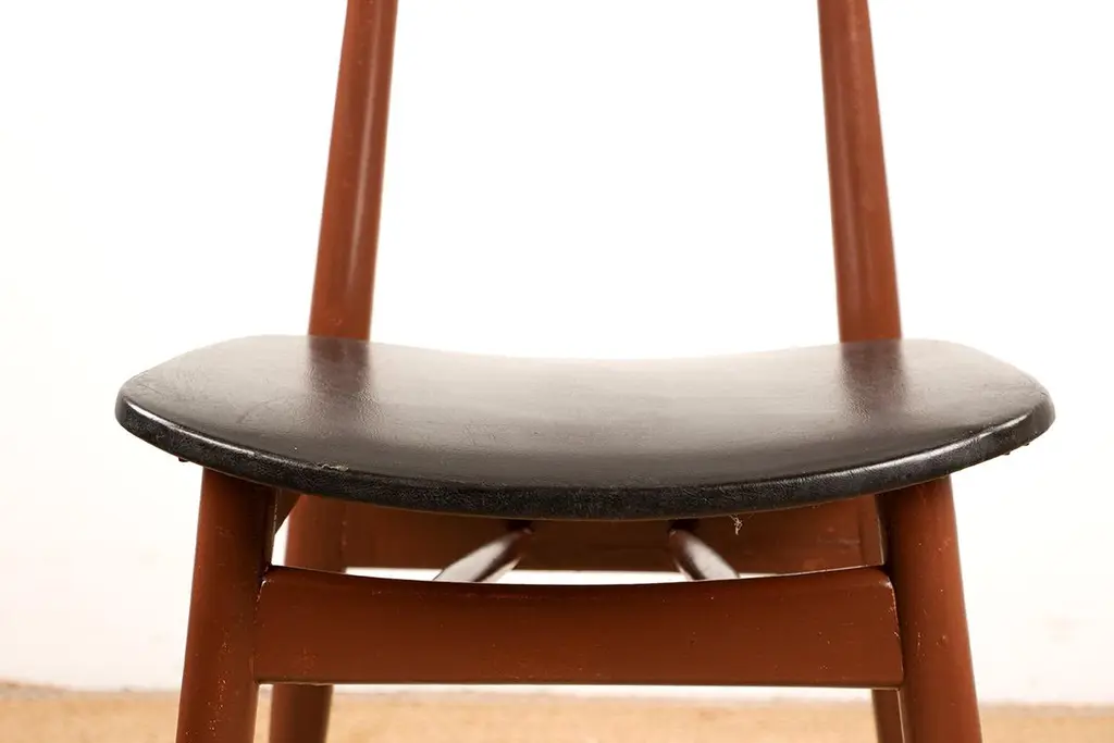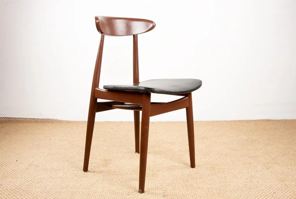 Beautiful vintage dining room chairs. Refinished in dark brown with elegant and comfortable airy seats. Scandinavian style. Very easy to repaint for a different color.Designer: Unknown.Manufacturer: Thonet.Origin: Germany.Period: 1960Condition: Very good condition.Dimensions: W: 40 cm – D: 42 cm – H: 75 cm – Seat height: 45 cm.Material: Dark brown lacquered wood and black leatherette.