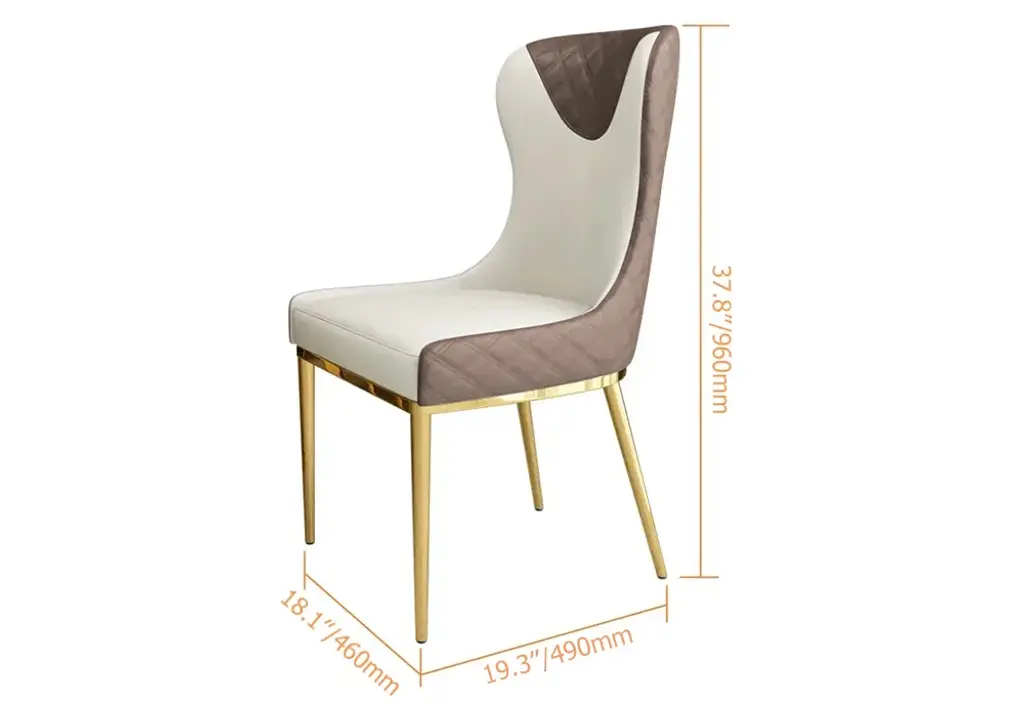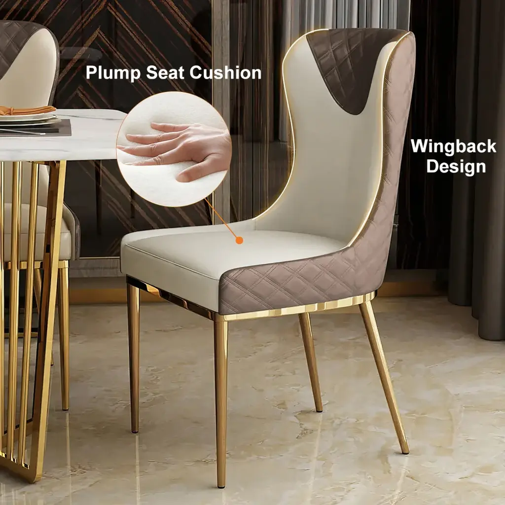Provide style and comfort to your dining space with this set of two modern wingback dining chairs, upholstered in soft and durable PU leather. These sleek gold stainless steel legs reinforce luxury, while the wingback design will keep you nicely supported through long dinners or casual gatherings. Elegant brown or white, versatile chairs blend with any dining room style from contemporary to modern. Perfect for creating an inviting and sophisticated dining atmosphere.