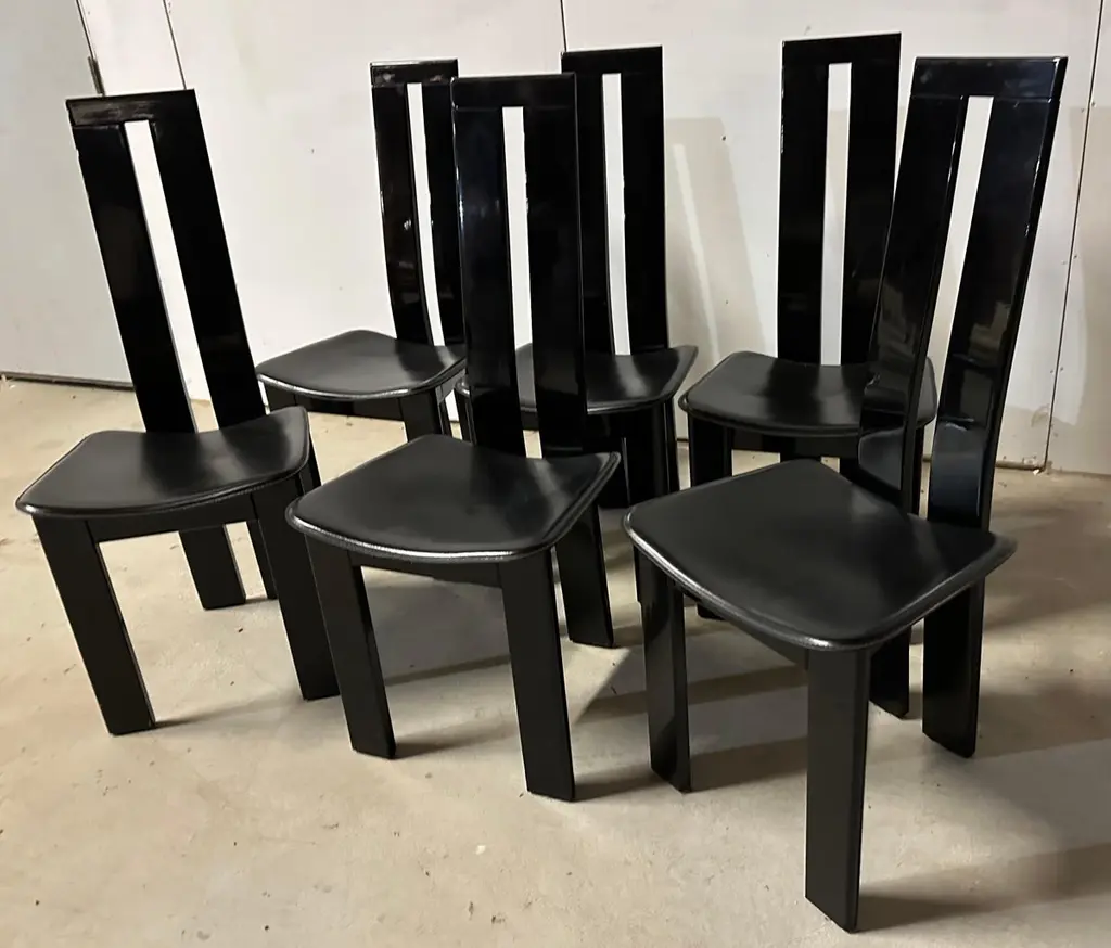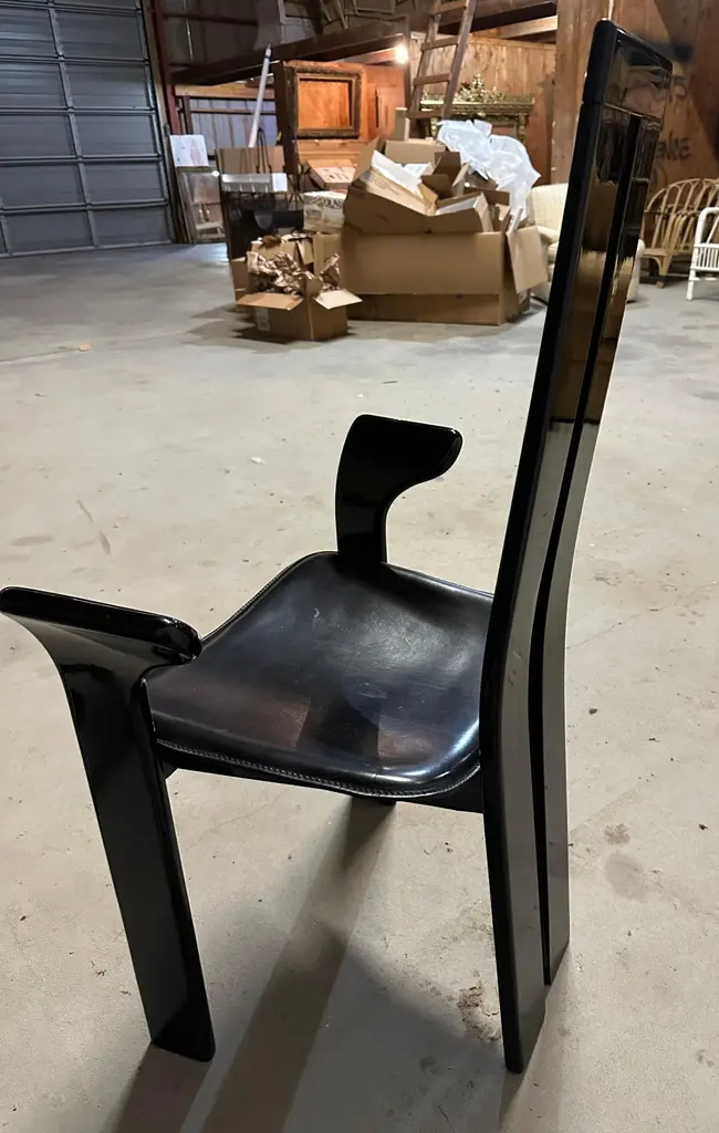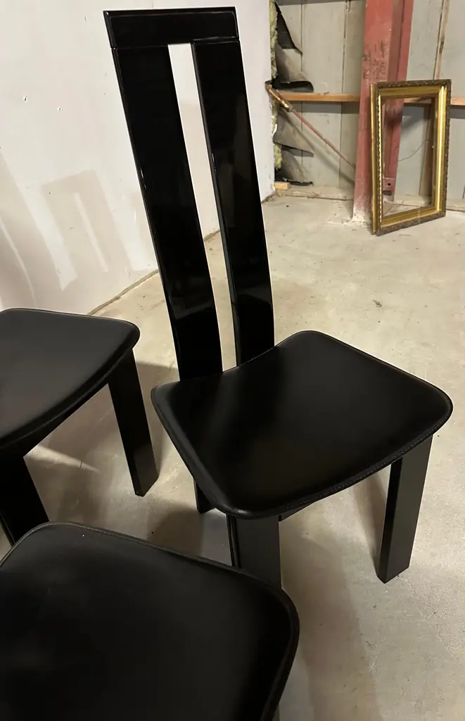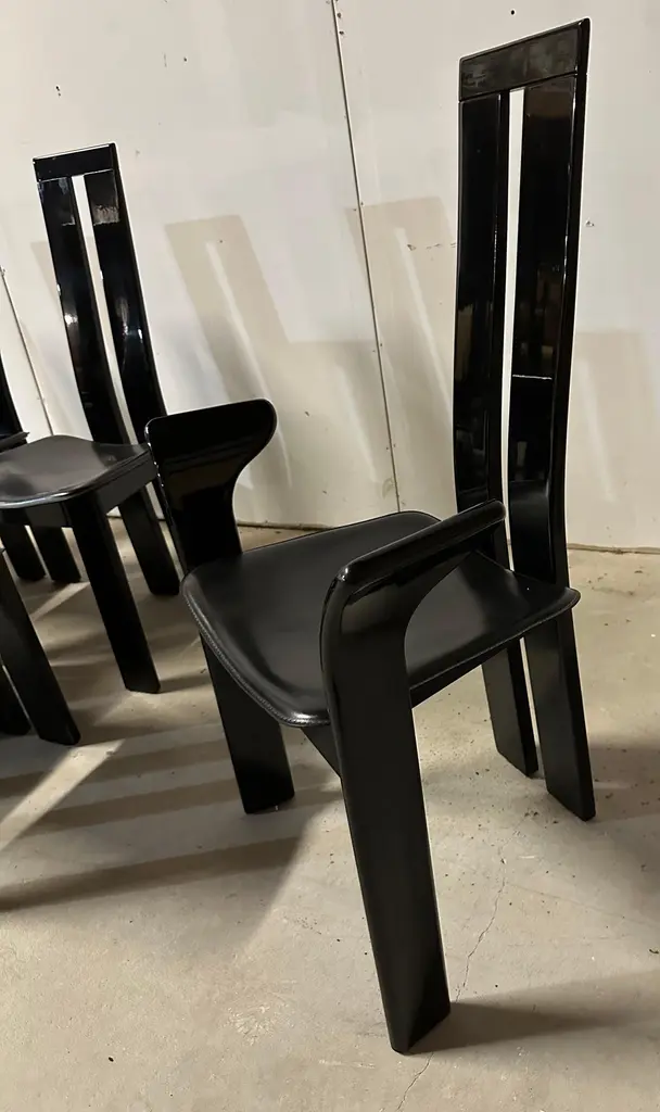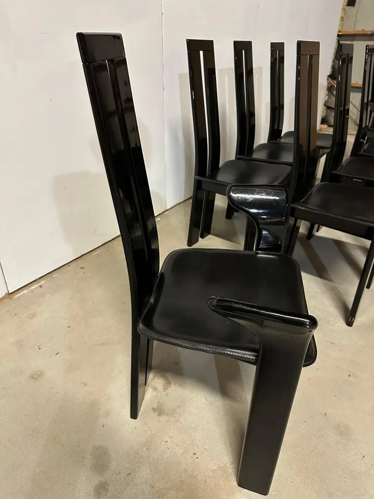 The post modern dining chairs are designed by Pietro Costantini in San Vito al Torre Italy. The iconic chairs feature sculptural style, piano black lacquered frames with conforming black leather seat pads. The set consists of 6 side chairs and two armchairs. The ergonomic chairs with a dramatic profile and finish are perfect for dining or conference room. A total of 18 side and 4 arm chairs in total are available.See listing for custom made by us, dining or conference table as shown in photos.Side chairs = $725 eachArm chairs = $900 eachArm chairs: 25.5 inches wide.