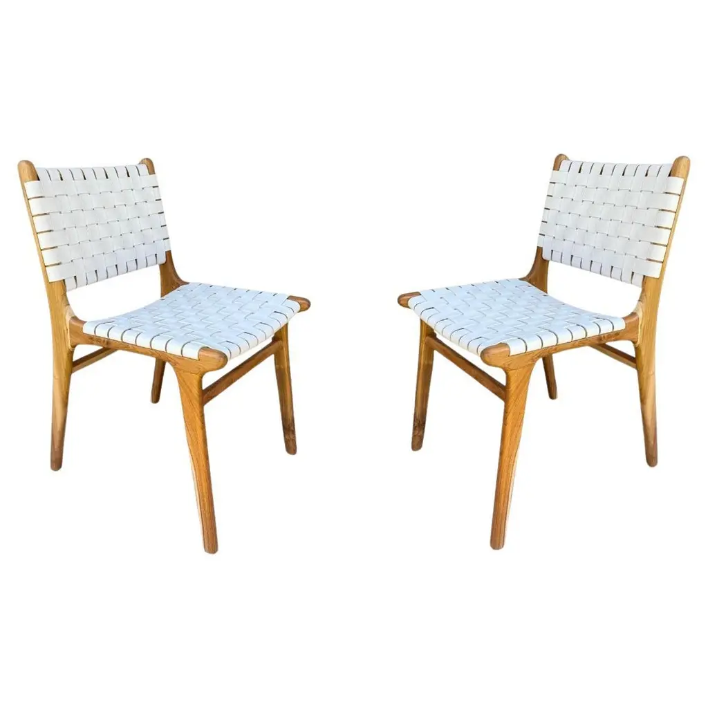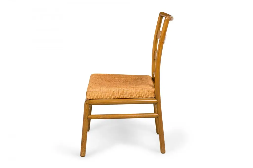 Set of 8 American Mid-Century dining side chairs with light wooden frames, woven rattan seats, and ladder backs, resting on four dowel legs with stretchers. (T.H. ROBSJOHN-GIBBINGS FOR WIDDICOMB FURNITURE COMPANY)(PRICED AS Set)Wear to frame finish. Some seats sagging slightly.