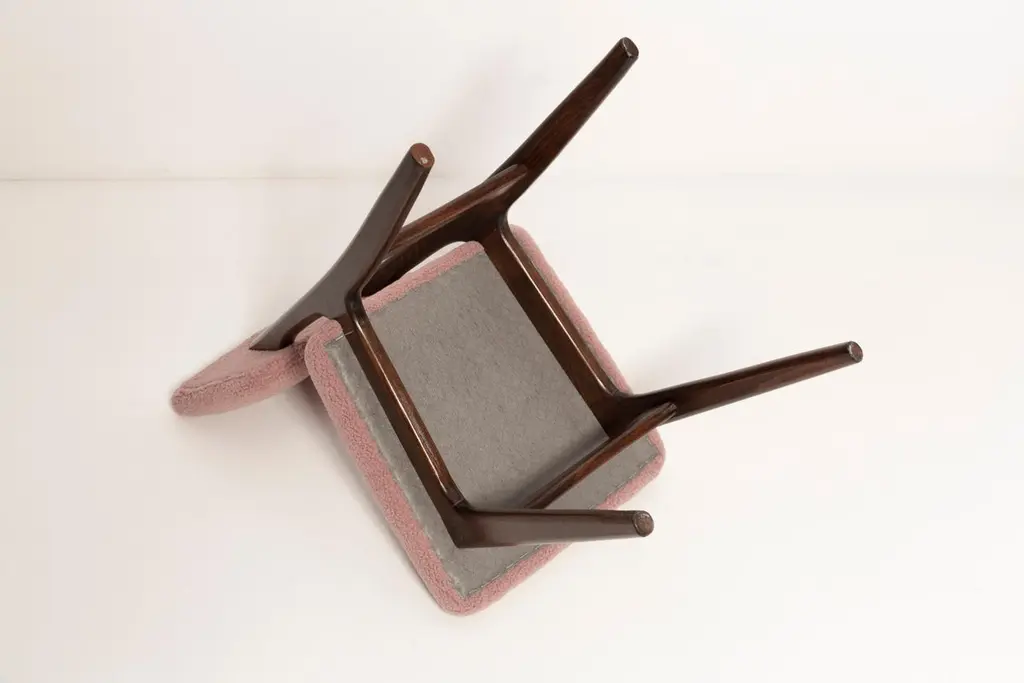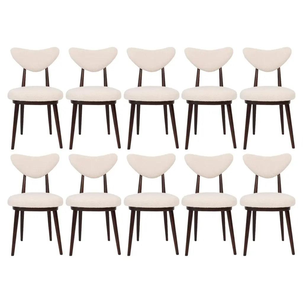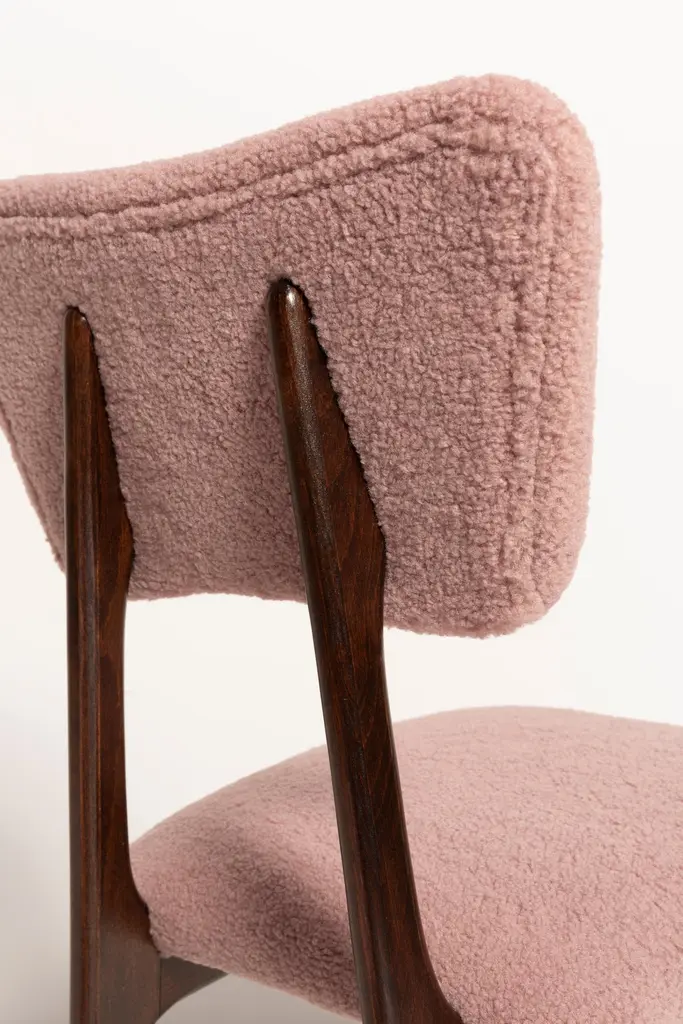 Dining chair called "Butterfly" with dark wenge stained beech legs and fully upholstered seat and back in beautiful boucle italian fabric (color number 03). This chair can be customized to your specifications or COM. Wood, stain, finish, fabric and custom dimensions options are available. Check the last picture with boucle color samples. This is vintage chair after professional renovation. Designed in 1960s in Poland. Here option of 8 chairs in a set. You can buy also more or less chairs if You need.