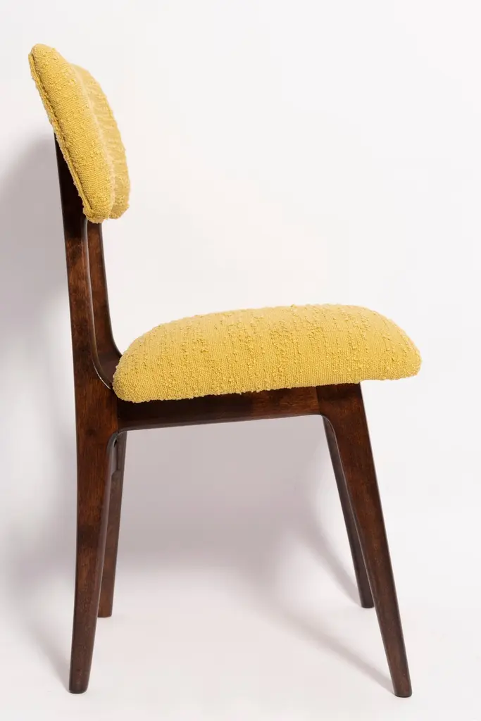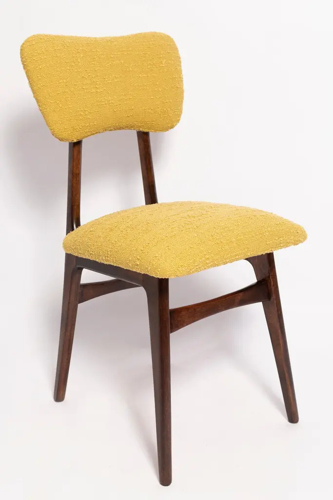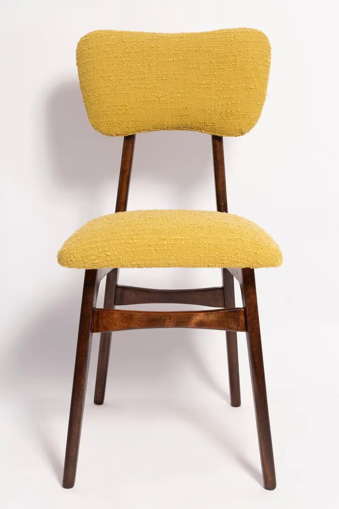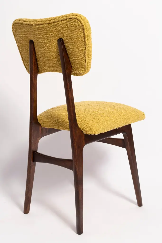 Dining chair called "Butterfly" with dark walnut stained beech legs and fully upholstered seat and back in beautiful boucle italian fabric (color number 01). A boucle fabric whose uniqueness is added by its particularly pronounced weave. The fabric is made of recycled polyester. It is characterised by high resistance to light. The fabric is composed of yarns of one colour but of different thicknesses. Isla perfectly combines with smooth structures, we can easily match it with multicoloured weaves. The fabric fits Scandinavian and rustic style, combined with chrome or black accessories it becomes elegant and balanced. A wide range of colours corresponds to this year's trends, it also includes many timeless colours.Easy cleaning will guarantee us comfort of use, clean and attractive furniture for years. The Oeko-Tex certificate assures us that the fabric is allergen-free and completely safe for human life and health. This chair can be customized to your specifications or COM. Wood, stain, finish, fabric and custom dimensions options are available. Check the last picture with boucle color samples. This is vintage chair after professional renovation. Designed in 1960s in Poland.