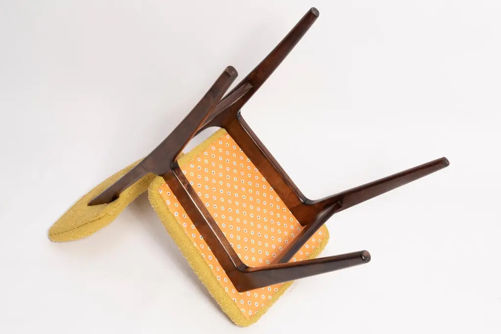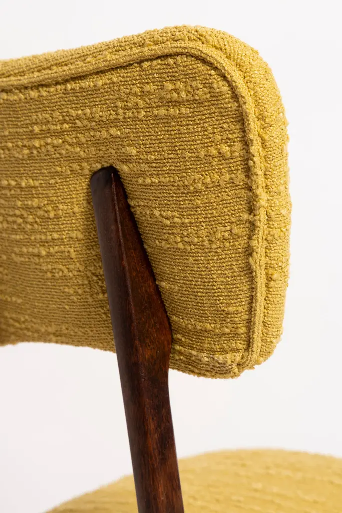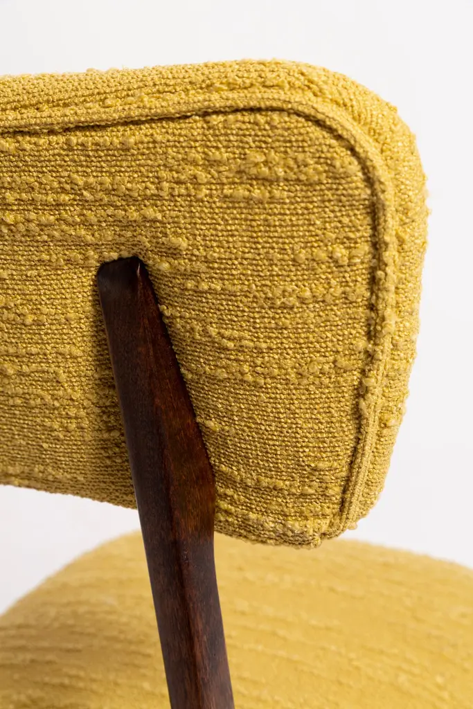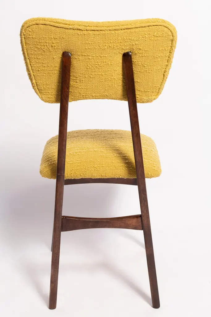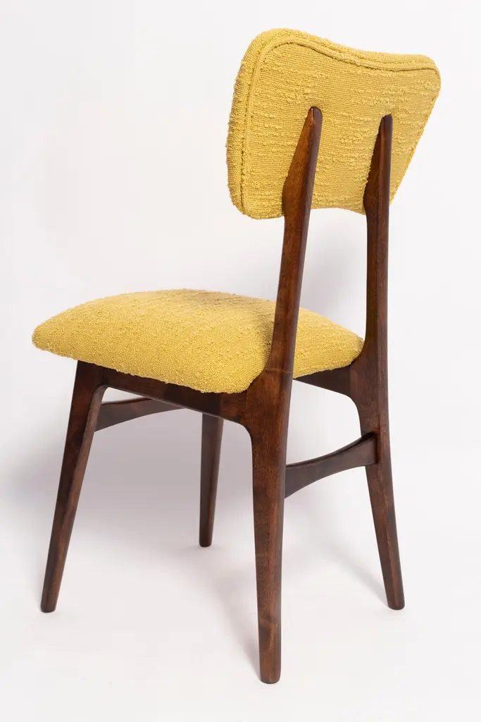 Dining chair called "Butterfly" with dark walnut stained beech legs and fully upholstered seat and back in beautiful boucle italian fabric (color number 01). A boucle fabric whose uniqueness is added by its particularly pronounced weave. The fabric is made of recycled polyester. It is characterised by high resistance to light. The fabric is composed of yarns of one colour but of different thicknesses. Isla perfectly combines with smooth structures, we can easily match it with multicoloured weaves. The fabric fits Scandinavian and rustic style, combined with chrome or black accessories it becomes elegant and balanced. A wide range of colours corresponds to this year's trends, it also includes many timeless colours.Easy cleaning will guarantee us comfort of use, clean and attractive furniture for years. The Oeko-Tex certificate assures us that the fabric is allergen-free and completely safe for human life and health. This chair can be customized to your specifications or COM. Wood, stain, finish, fabric and custom dimensions options are available. Check the last picture with boucle color samples. This is vintage chair after professional renovation. Designed in 1960s in Poland.