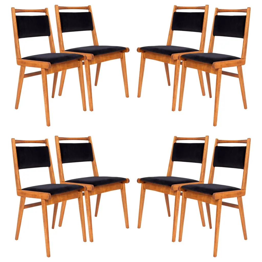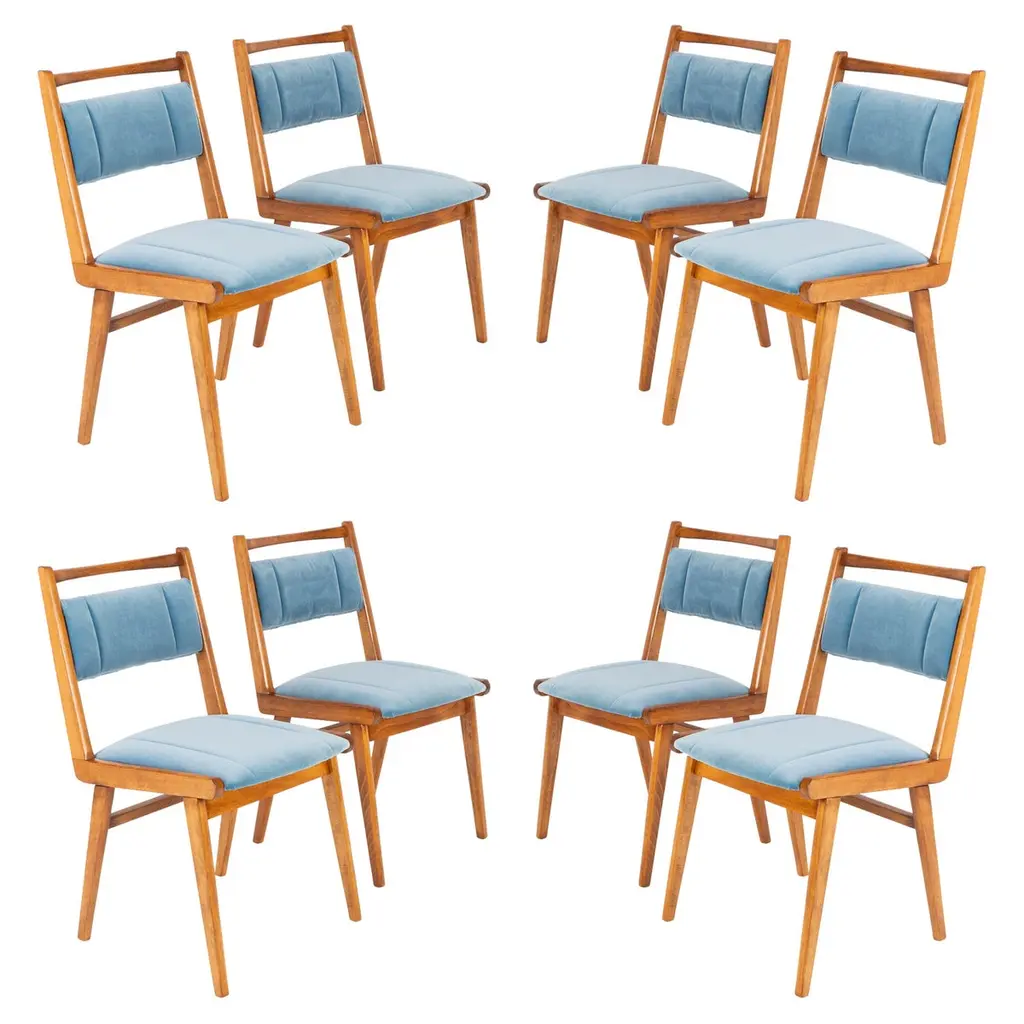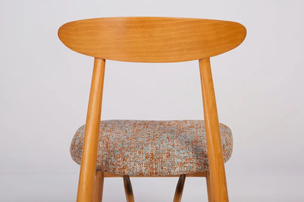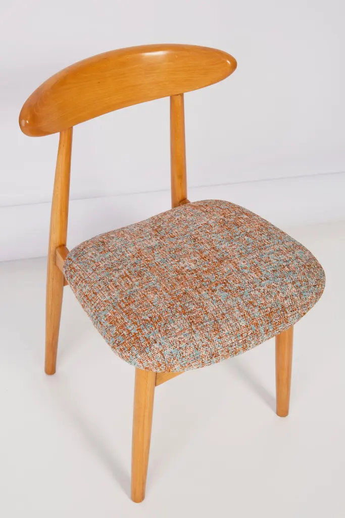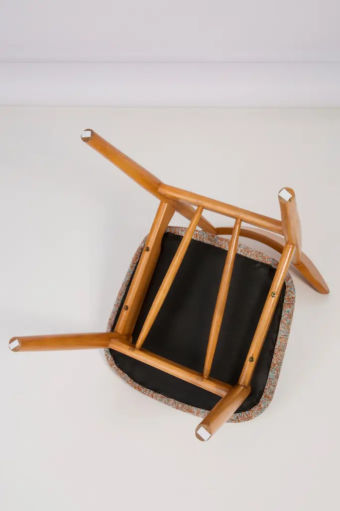 Chairs type 5908, designed in 1960s by Rajmund Teofil Halas, are one of the most recognizable projects of Polish design.The chairs have a simple, modernist silhouette. They are characterized by streamlined, organic characteristic shapes for Industrial Design in the 1960s. The construction was made of beech wood, upholstery with high quality pixel fabric. The form of the furniture is clearly inspired by the Danish design from the period of the second half of the 20th century. The set of chairs is after a professional renovation. The chair model is very ergonomic and comfortable, as the furniture designs of that time were largely focused on the user. Due to its small size, the furniture fits perfectly into the interiors of contemporary apartments, perfectly meeting the needs of customers.
