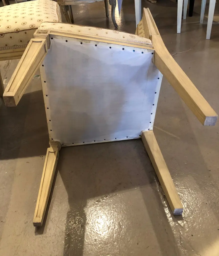 Set of Five Jansen style paint decorated and gilt Louis XVI style dining chairs. Each in a new upholstery with new springs and welts. The set with fine sleek and clean lines in a linen white form of parchment faux paint with gilt hi lights. The set strong and sturdy. Can purchase as many as are needed. Priced per chair.