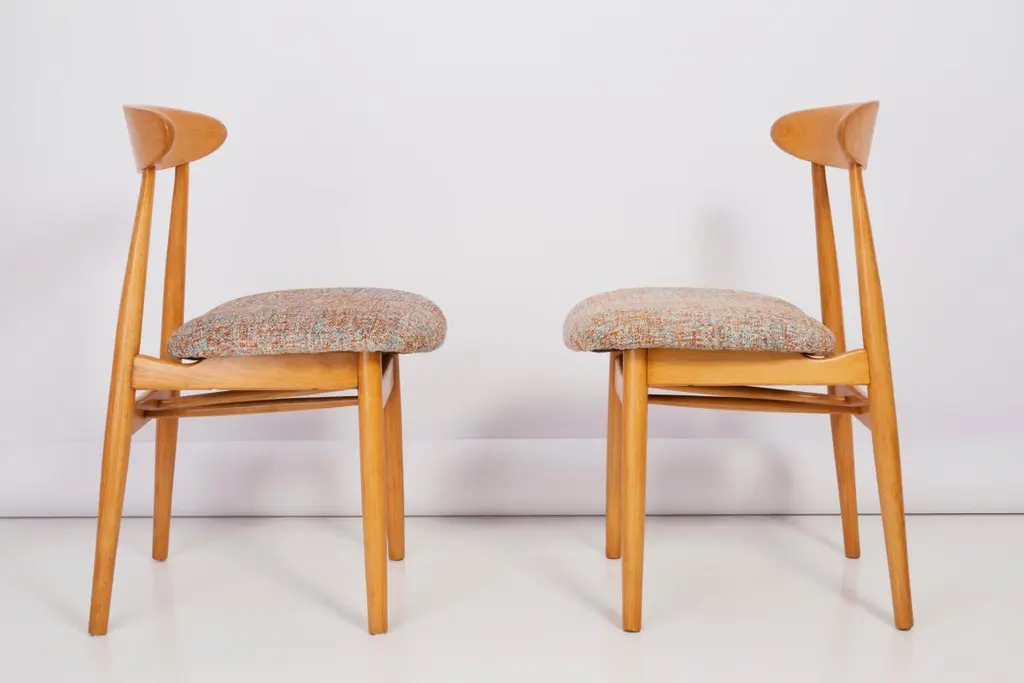 Chairs type 5908, designed in 1960s by Rajmund Teofil Halas, are one of the most recognizable projects of Polish design.The chairs have a simple, modernist silhouette. They are characterized by streamlined, organic characteristic shapes for Industrial Design in the 1960s. The construction was made of beech wood, upholstery with high quality pixel fabric. The form of the furniture is clearly inspired by the Danish design from the period of the second half of the 20th century. The set of chairs is after a professional renovation. The chair model is very ergonomic and comfortable, as the furniture designs of that time were largely focused on the user. Due to its small size, the furniture fits perfectly into the interiors of contemporary apartments, perfectly meeting the needs of customers.