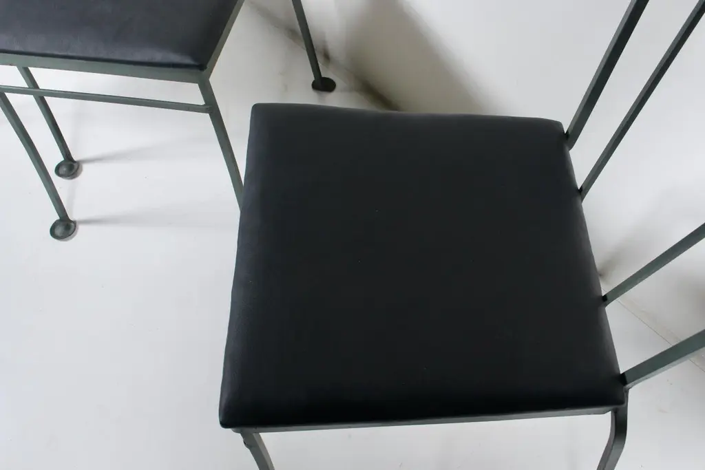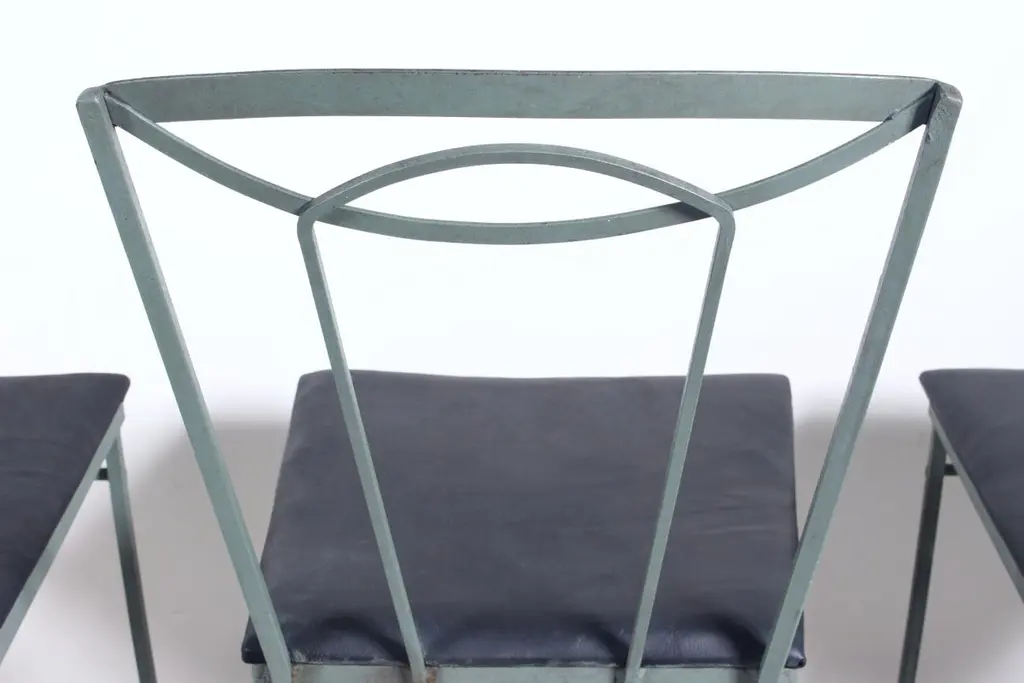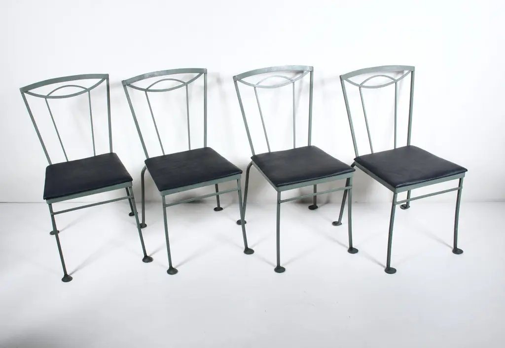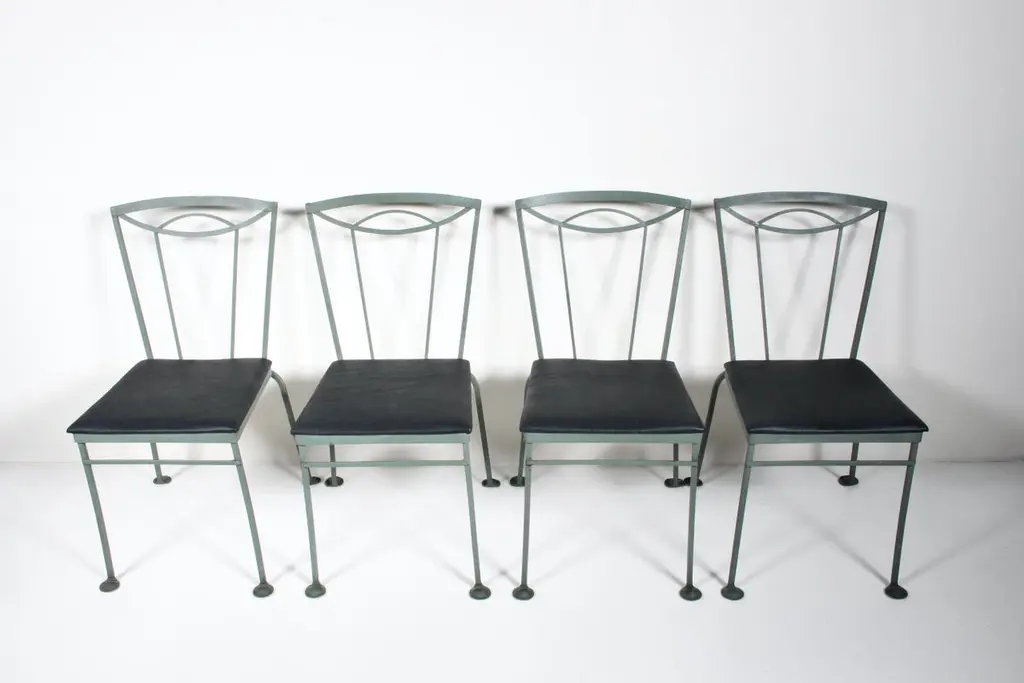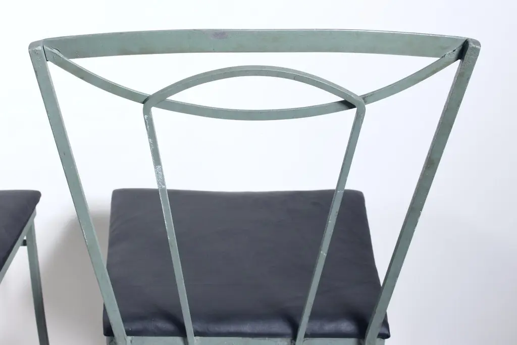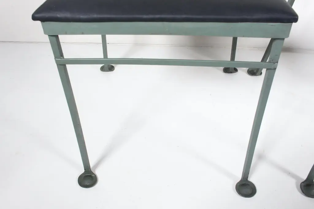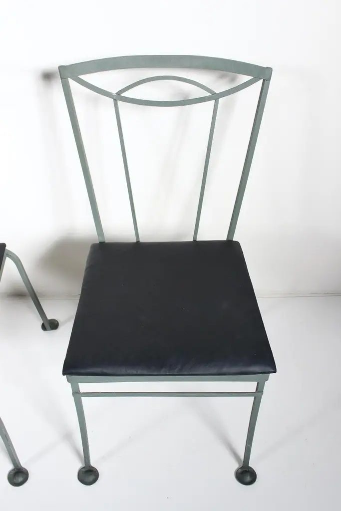 Set of 4 Maurizio Tempestini for John Salterini Iron Conservatory Dining Side Chairs. Featuring welded construction, handwrought iron, ergonomic curved backs, newly upholstered padded Black Leather seats, original wood bottom, rust resistant Neva-Rust Sage Green paint, atop four balanced, reinforced slender legs atop wide lily pad forged feet. Covered Patio. Screened Porch. Covered Veranda. Sunroom. 14 lbs each. Timeless. Sturdy. Hollywood Regency. John B. Salterini label to underside. Additional shipping options may be available, please inquire
