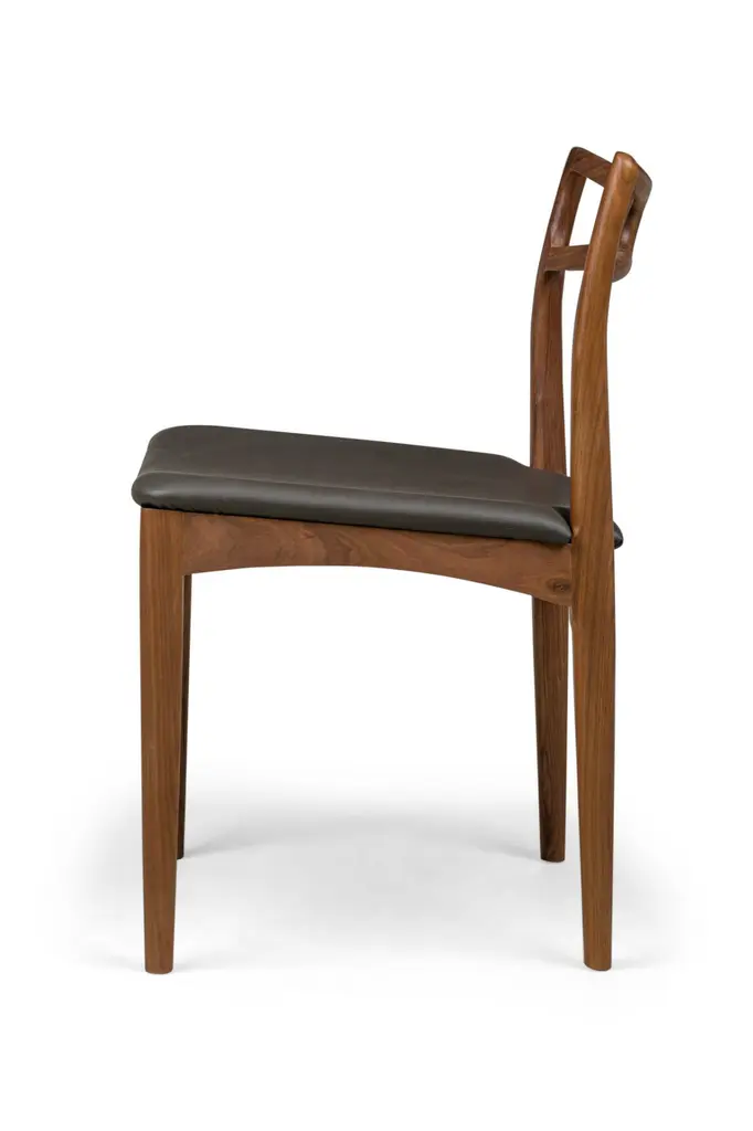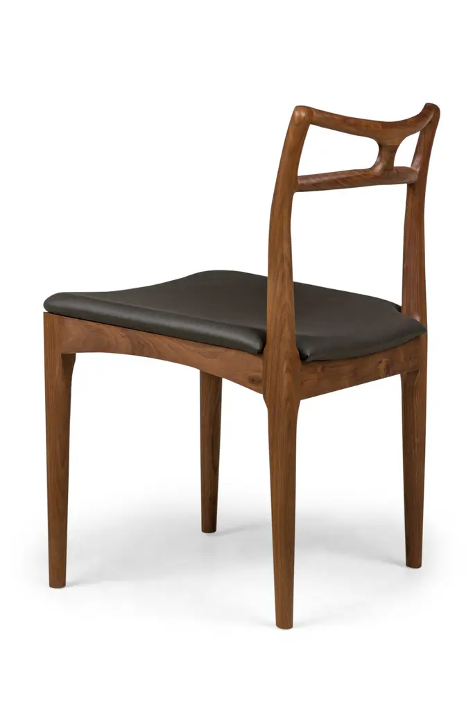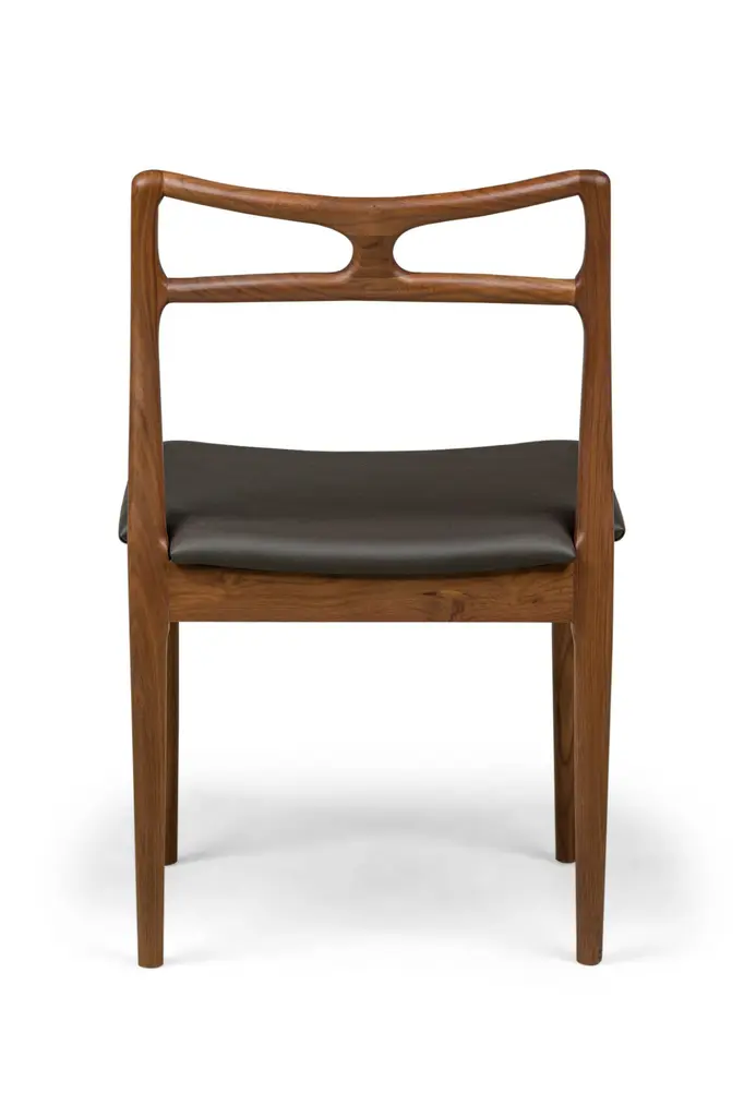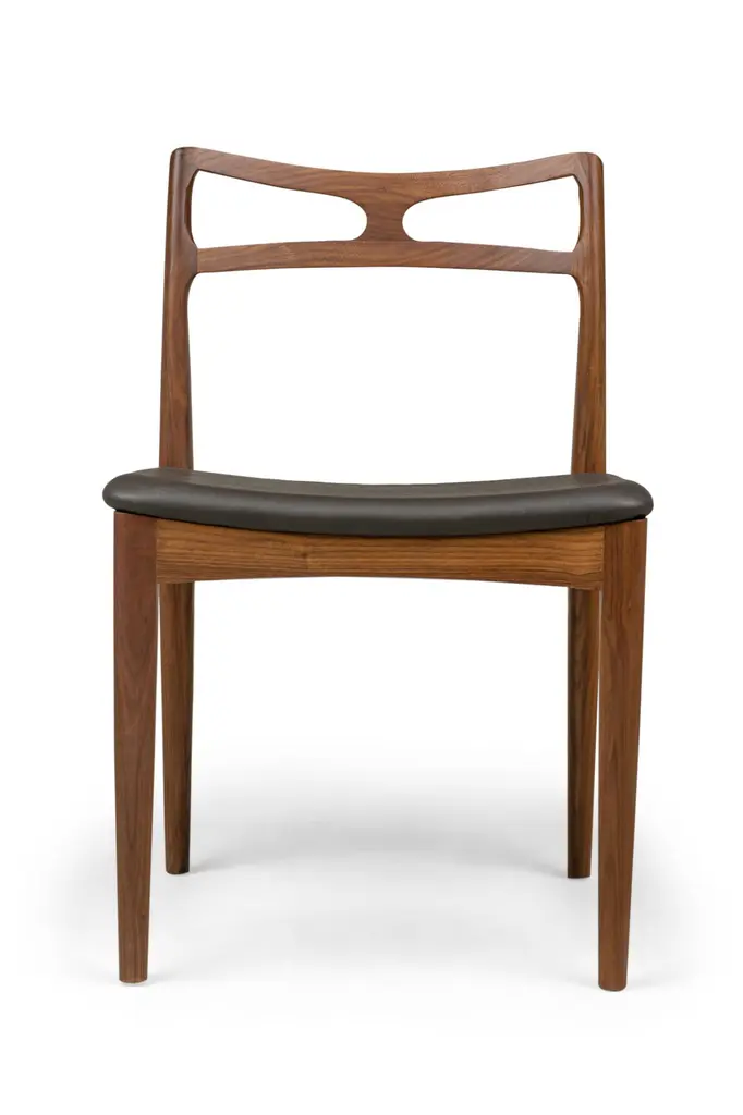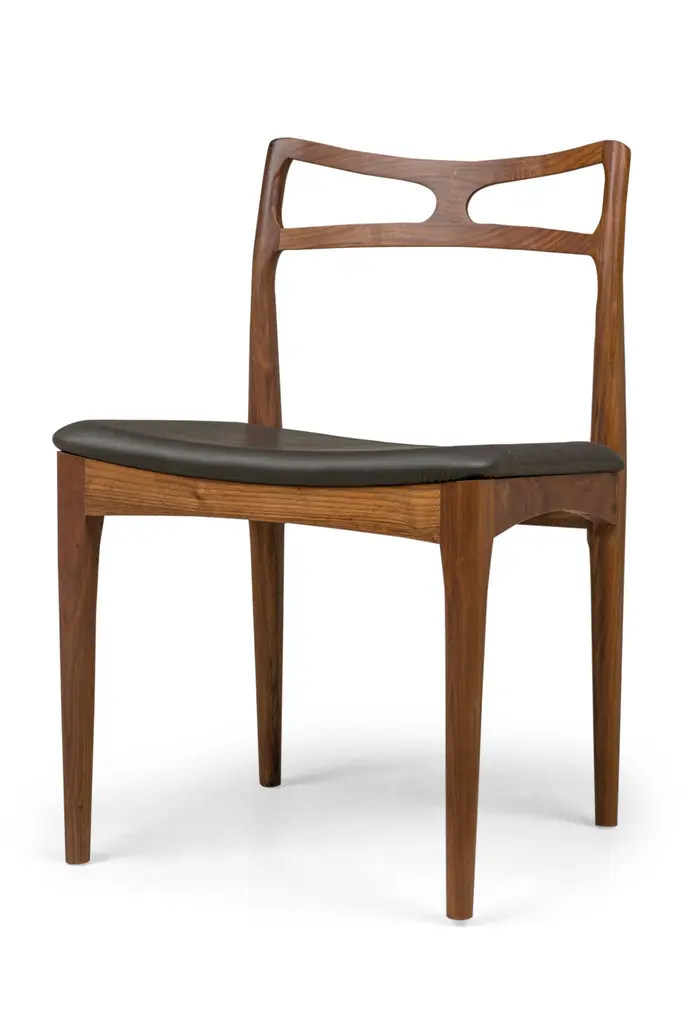 12 "HUGO" Mid-Century style dining chairs constructed of sustainably harvested FSC-certified American walnut, upholstered in leather. (PRICED EACH).Condition: Good; Wear consistent with age and use