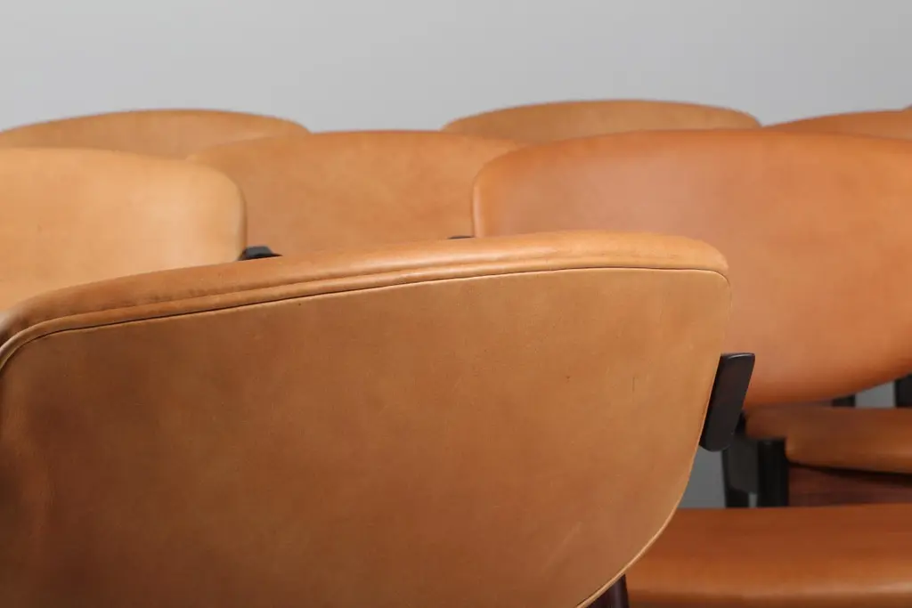 Set of dining chairs produced by Skovman Andersen for the Illum Bolighus department store in Copenhagen. Rosewood frames with seat and back reupholstered with vintage tan aniline leather. Back pad has tilt function for added comfort.