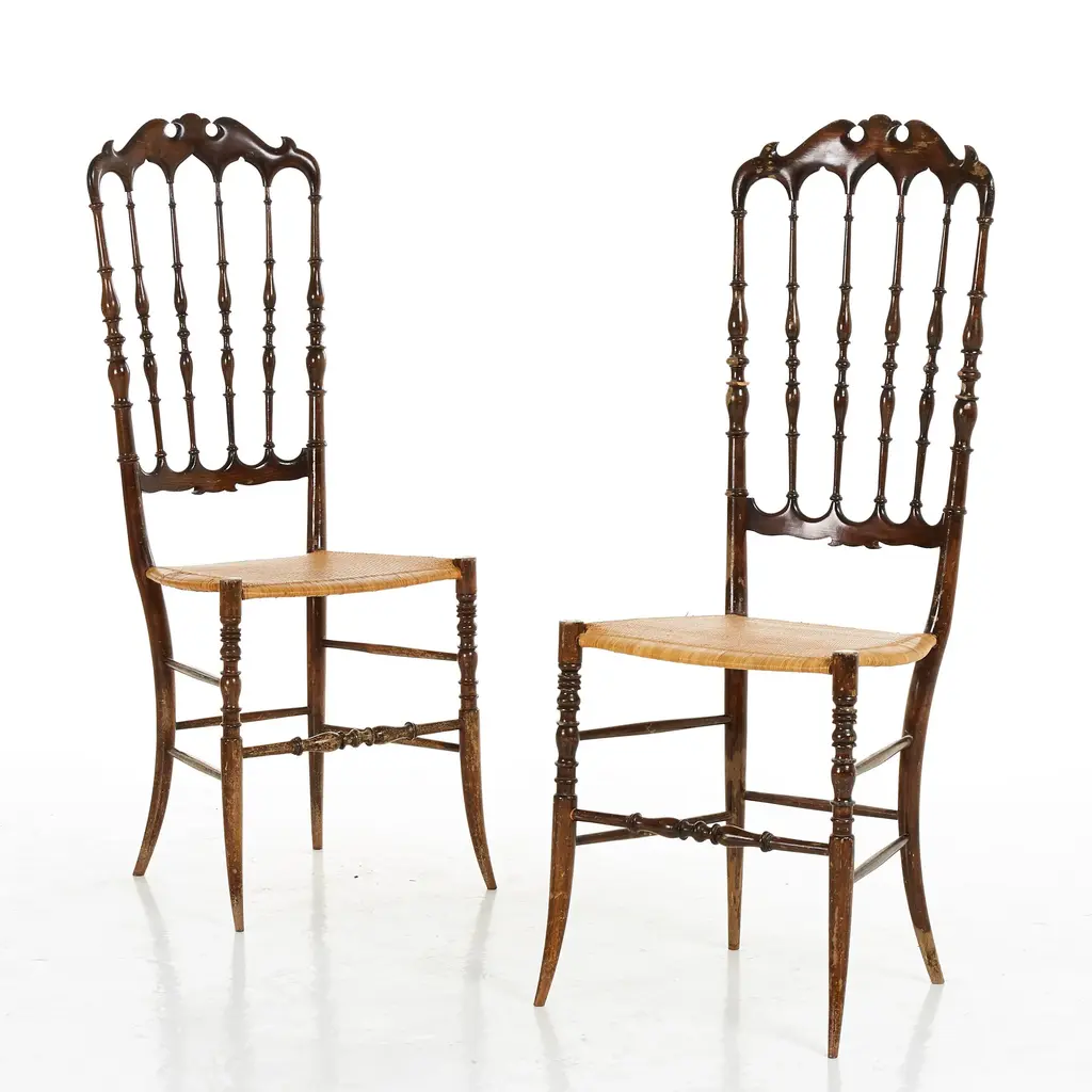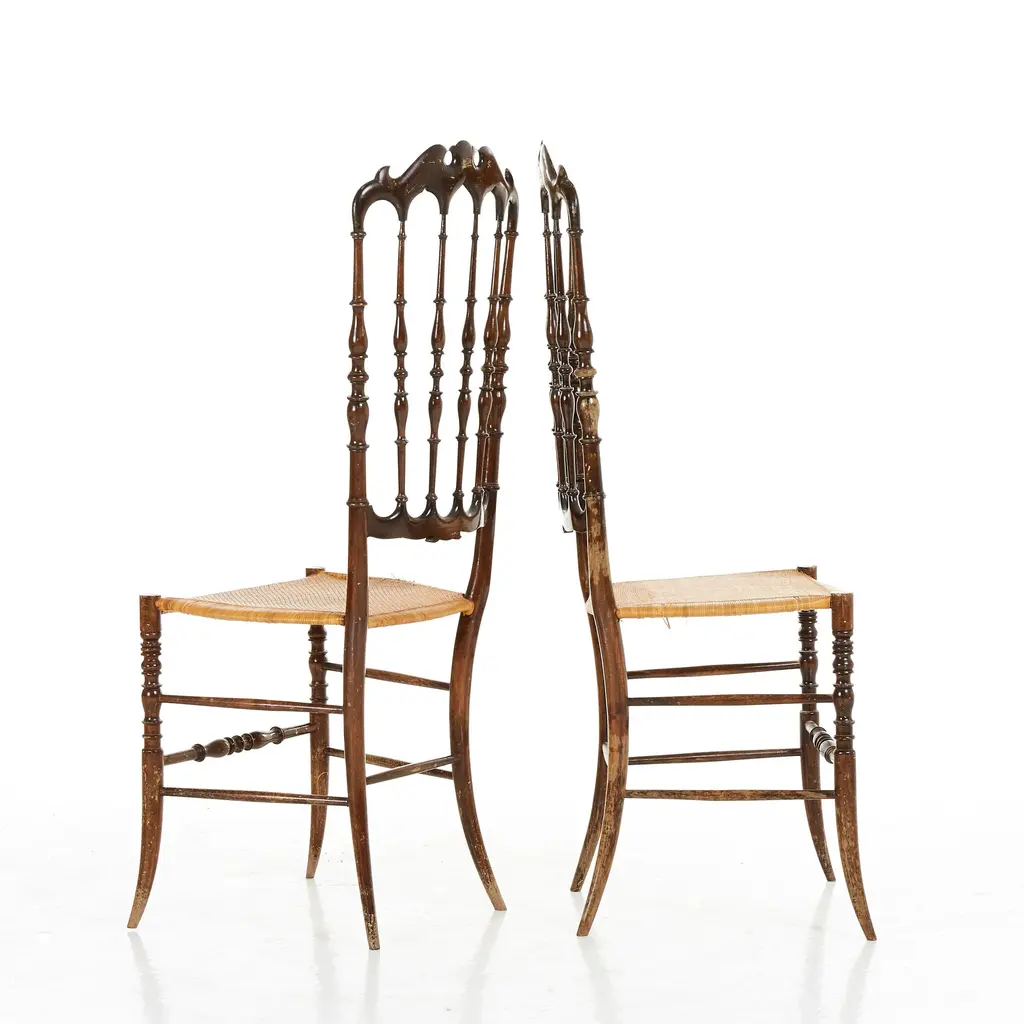 - Italian production from the 1950s - Designed by Colombo Sanguineti - Manufactured by Sedie e Mobili Sanguineti - Chiavari chairs - Each stamped at the back - Slim design and amazingly light - Pearwood frame with cane seat