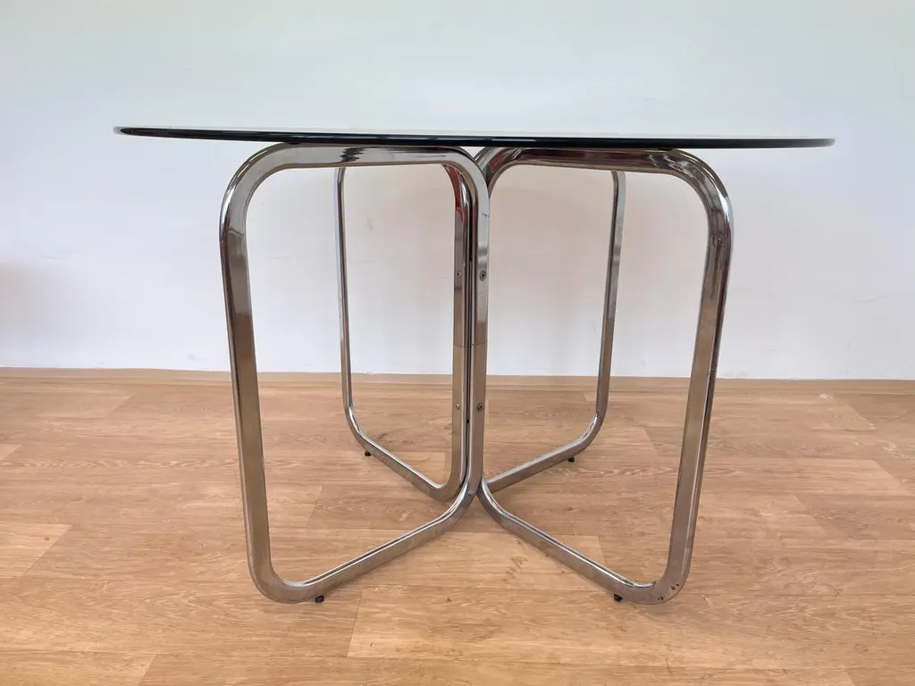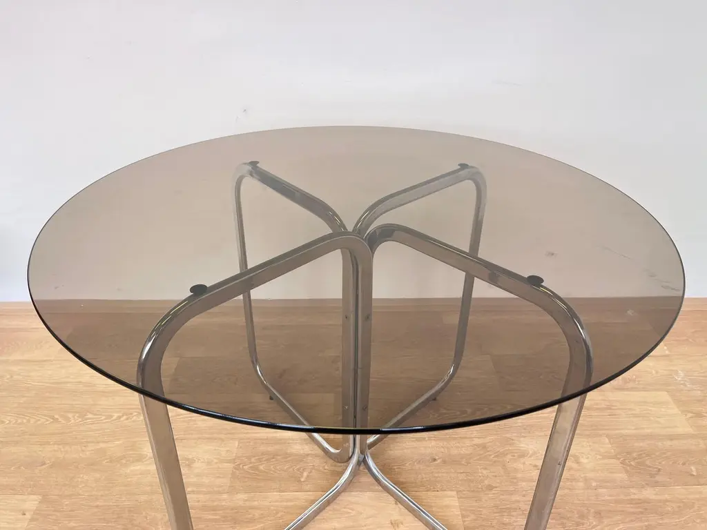 - good original condition- around 1980s- chrome in perfect condition with patina- smoked glass- suitable for new upholstery- table: diemater: 110cm, height: 74cm.