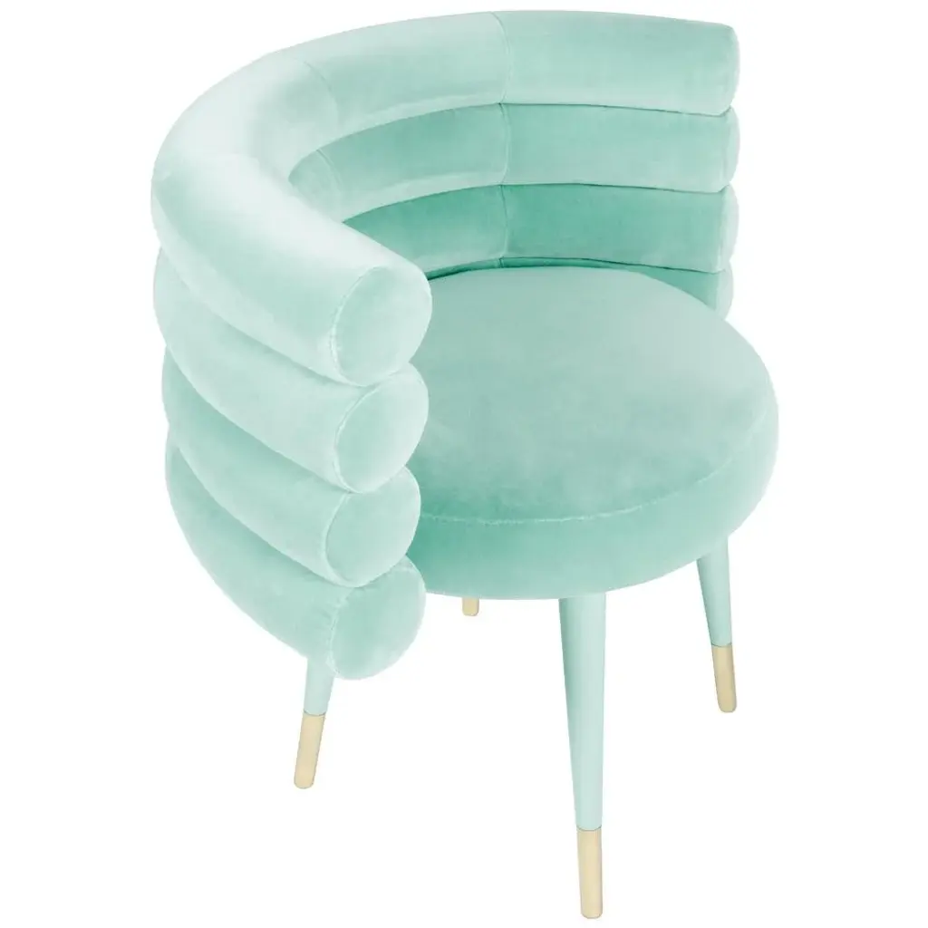 Set of 2 mustard marshmallow dining chairs, Royal Stranger. Dimensions: 78 x 70 x 60 cm Materials: Velvet upholstery and brass. Available in: Mint green, light pink, royal green and royal red. Royal Stranger is an exclusive furniture brand determined to bring you the best unique pieces of art and design. Fusing design, art and the best craftsmanship, they strive to deliver the best state of the handmade art furniture. The design team works every day to create meaningful products that represent values such as passion, function, aesthetics and know-how. Values that are meant to represent Royal Stranger’s DNA. This dedication is present at all stages of production and the combination of craftsmanship and innovative design contributes to our final purpose: To produce certified high-quality products, made with passion and expertise and using royal materials such as gold leaf, rich woods and high quality lacquers. It was in 2013, as an architects, that Sofia Santos & Rui Santos started to push the boundaries of innovation in several retail design concepts for some of the best stores in Portugal. This will has always been present in their work, and that’s how the brand was born. This piece is attributed to the mentioned designer/maker. It has no attribution mark and no official proof of authenticity, however it is well documented in design history. I take full responsibility for any authenticity issues arising from misattribution