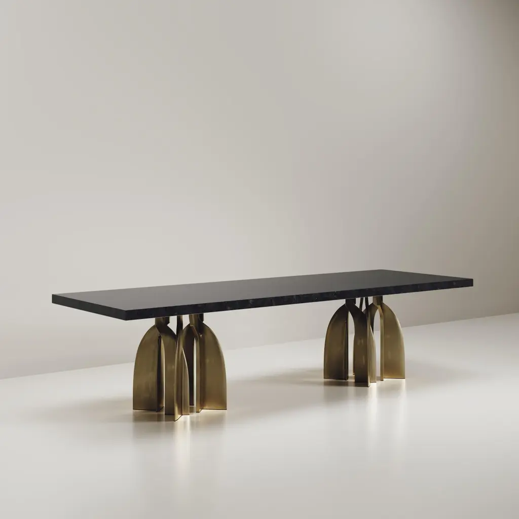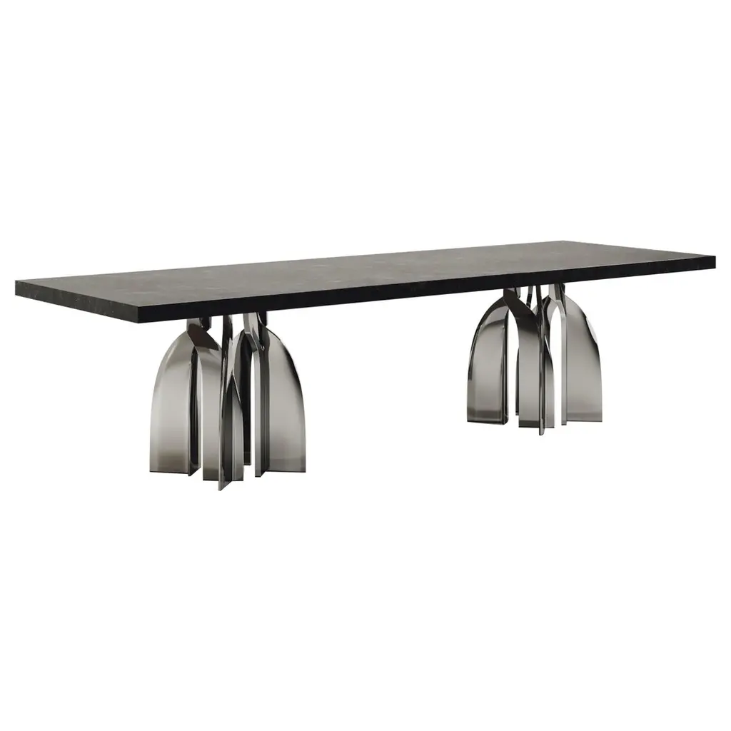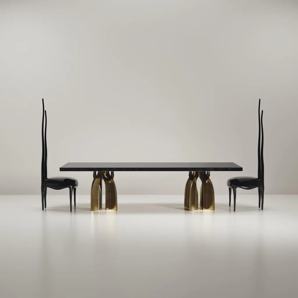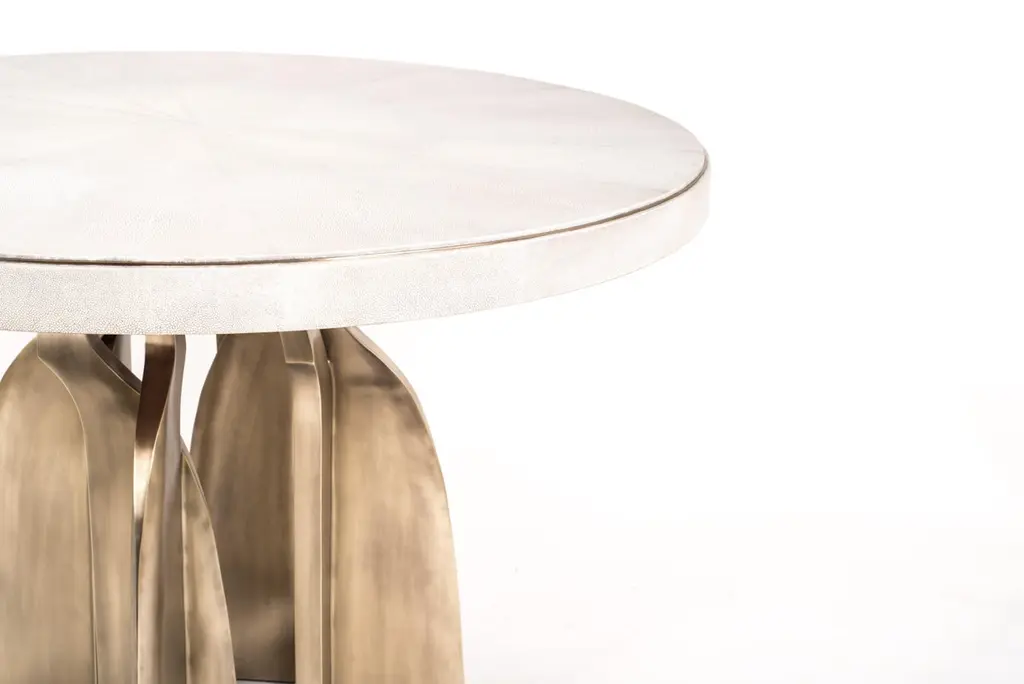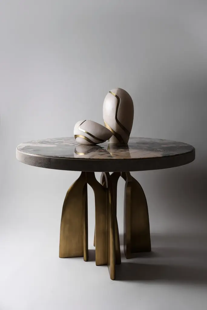 The Paris based label has distinguished themselves since their launch, with their iconic use of shagreen mixed with brass and other exotic materials. All furniture is handcrafted by skilled artisans, ultimately making each piece unique, designed in Paris and produced in the Philippines.The Chital dining table is a stunning piece, a statement in any space. The black pen shell inlaid top is sleek and dramatic, and followed by bronze-patina brass sculptural legs clustered together as the base. This piece is designed by Kifu Augousti, the daughter of Ria & Yiouri Augousti. Available in other finishes and as a round breakfast table version. The dimensions of this piece are 304.8 x 106.9 x 75 cmThis dining table is sold with a pair of Sylvie chairs. The Sylvie chair is an iconic design by R & Y Augousti. One of their very first designs, this majestic and ethereal piece is a statement in any space. This piece has been photographed in numerous celebrity homes, including design Alexander Wang's New York apartment designed by Ryan Korban. This piece is shown in black pen shell, but custom color or sizing are available on request. 60 x 55 x 180 cmAll Kifu Paris pieces are handmade by artisans, ultimately making each piece unique. Custom color or sizing available on request. Wipe clean with soft dry cloth.Although inspired by her parents, her collection of Home Accessories and Furniture is a distinct identity of its own. Kifu uses handmade techniques of elaborate inlay patterns of shagreen, shells, semi-precious stones, materials she experienced as a child growing up in her parent’s studio, but interpreted in a younger quirkier way reflecting her youth. From her "jewelry inspired knobs" on decorative boxes, gold bar boxes and an extravagant inlay pattern mix of shagreen and shell inspired by galactic constellations, as seen on her enormous round mirror, is refreshing to see. Kifu embodies whimsical elements throughout her collection and is not afraid to be daring and unexpected in her approach to design. All shagreen-covered items should be kept out of direct sunlight, color variants may occur on the stingray and other exotic finishes, but this showcases the Parisian label's commitment to creating authentic luxurious products using natural components.