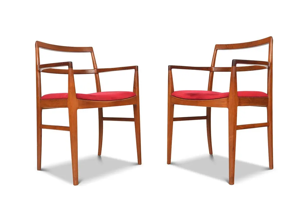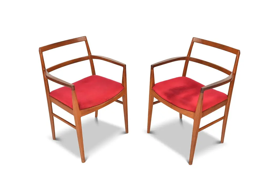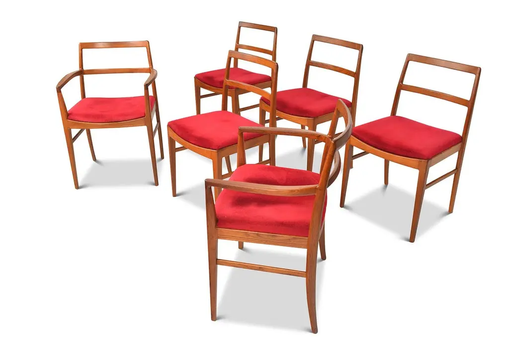 Origin: DenmarkDesigner: Arne VodderManufacturer: UnknownEra: UnknownMaterials: Teak, WoolMeasurements (side chairs): 19? wide x 18? deep x 31.5? tallCaptains Chairs: 22? wide x 19? deep x 31.5? tallCondition:In excellent original condition.
