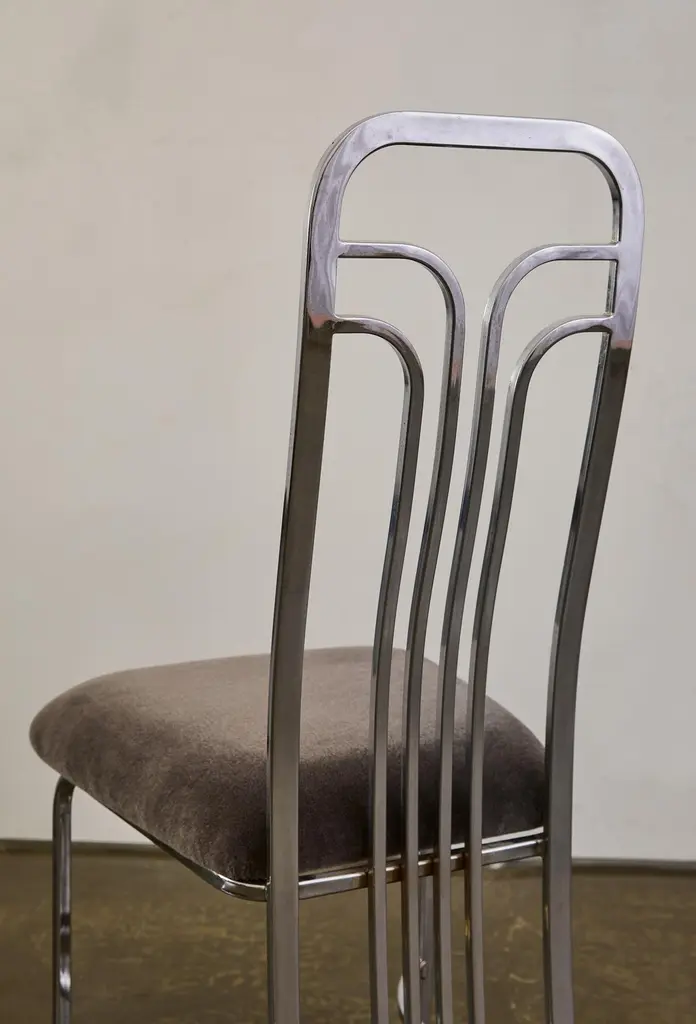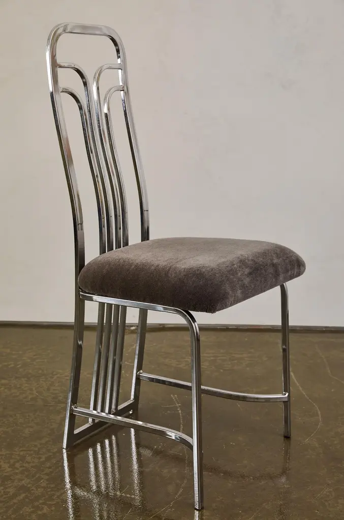 This set of 6 Art Deco revival dining chairs circa 1980s with a vintage chrome finish and newly upholstered gray mohair seats. There is wear to the chrome finish commensurate with age. Chairs can be purchased in sets of two or as a complete set.
