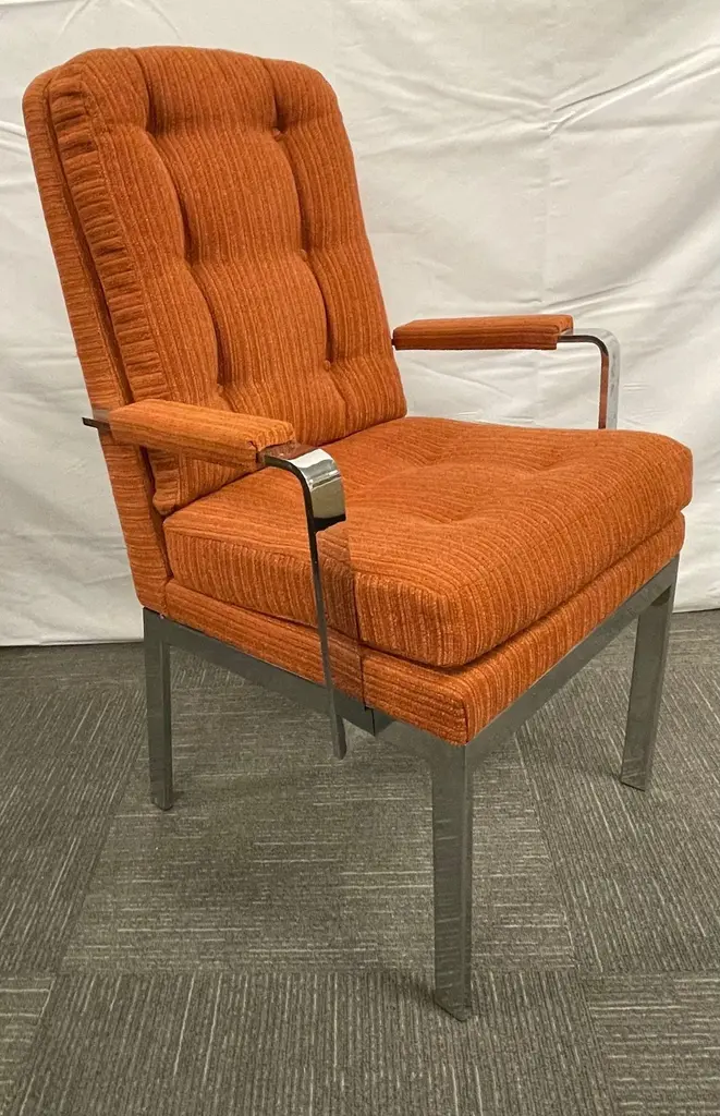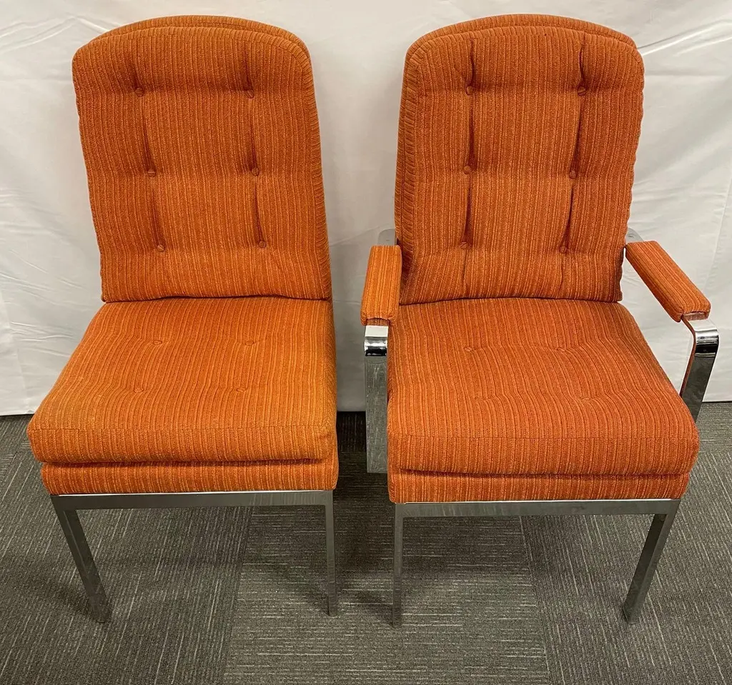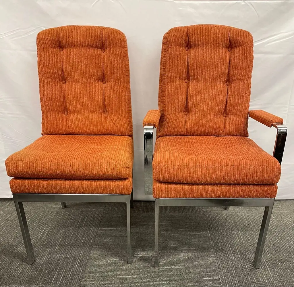 Set of six Mid-Century Modern Dining Chairs, Milo Baughman style, Chrome, FabricSet of six Mid-Century Modern dining room chairs comprised of four side chairs and a pair of arm chairs. Both comfortable as well as sturdy and strong, each is made with plush cushion seats and backrests with a substantial chrome leg construction. Upholstery can use a cleaning but overall good condition. Measures: Arm Chairs: Height 39 inches, Width 22 inches, Depth 21 Seat Height 21 inchesSide Chairs: Height 36 inches, Width 22 inches, Depth 20 inches, Seat Height 21 inches.