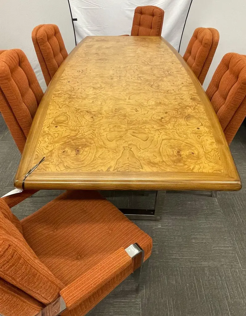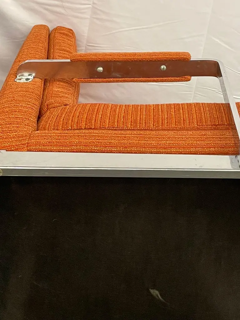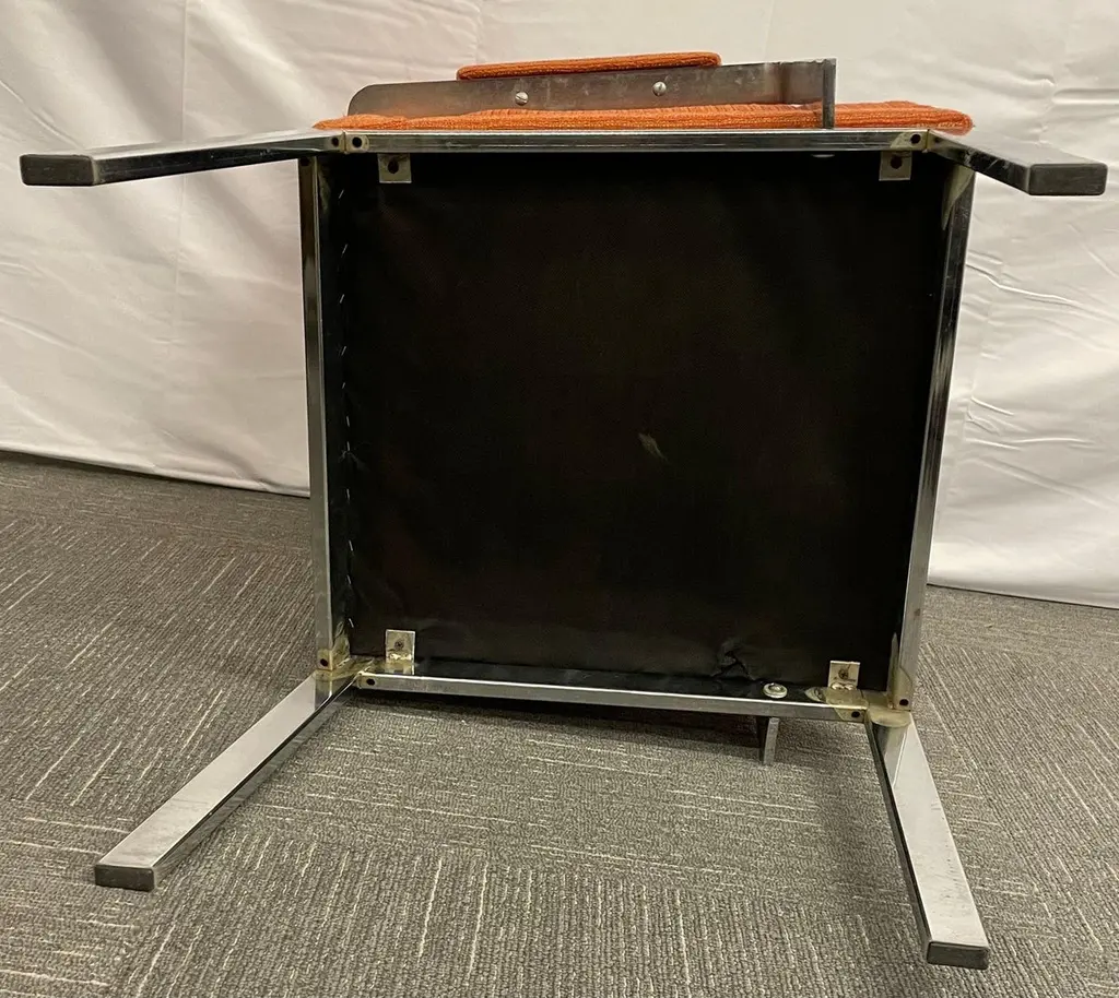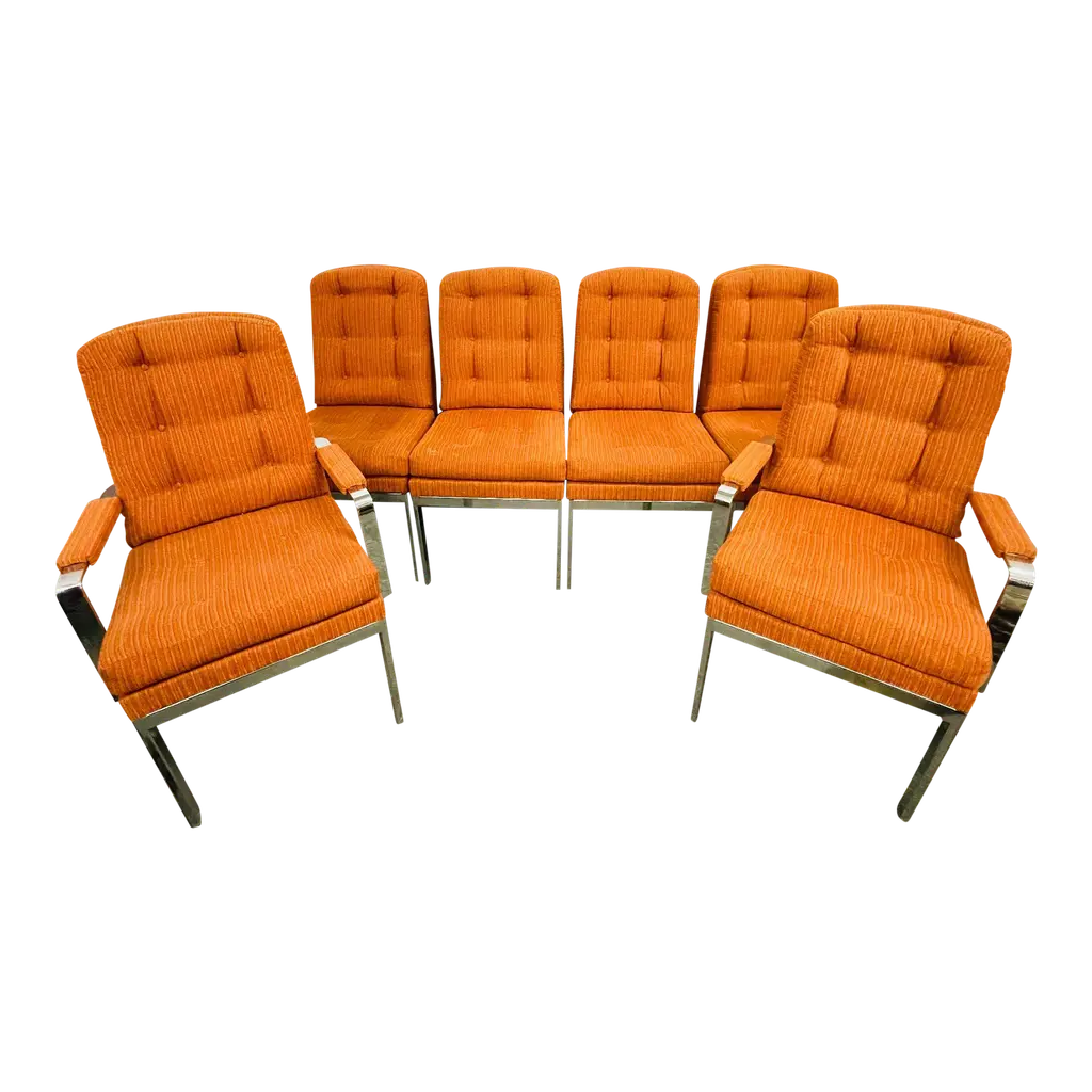 Set of six Mid-Century Modern Dining Chairs, Milo Baughman style, Chrome, FabricSet of six Mid-Century Modern dining room chairs comprised of four side chairs and a pair of arm chairs. Both comfortable as well as sturdy and strong, each is made with plush cushion seats and backrests with a substantial chrome leg construction. Upholstery can use a cleaning but overall good condition. Measures: Arm Chairs: Height 39 inches, Width 22 inches, Depth 21 Seat Height 21 inchesSide Chairs: Height 36 inches, Width 22 inches, Depth 20 inches, Seat Height 21 inches.