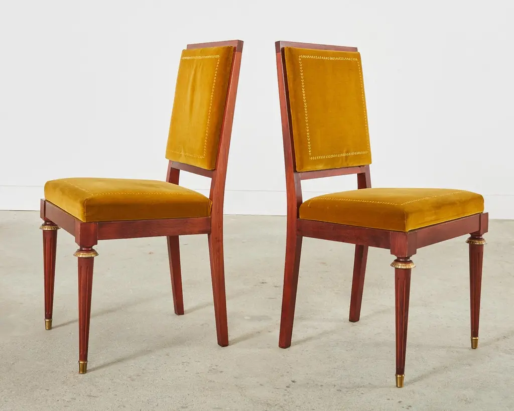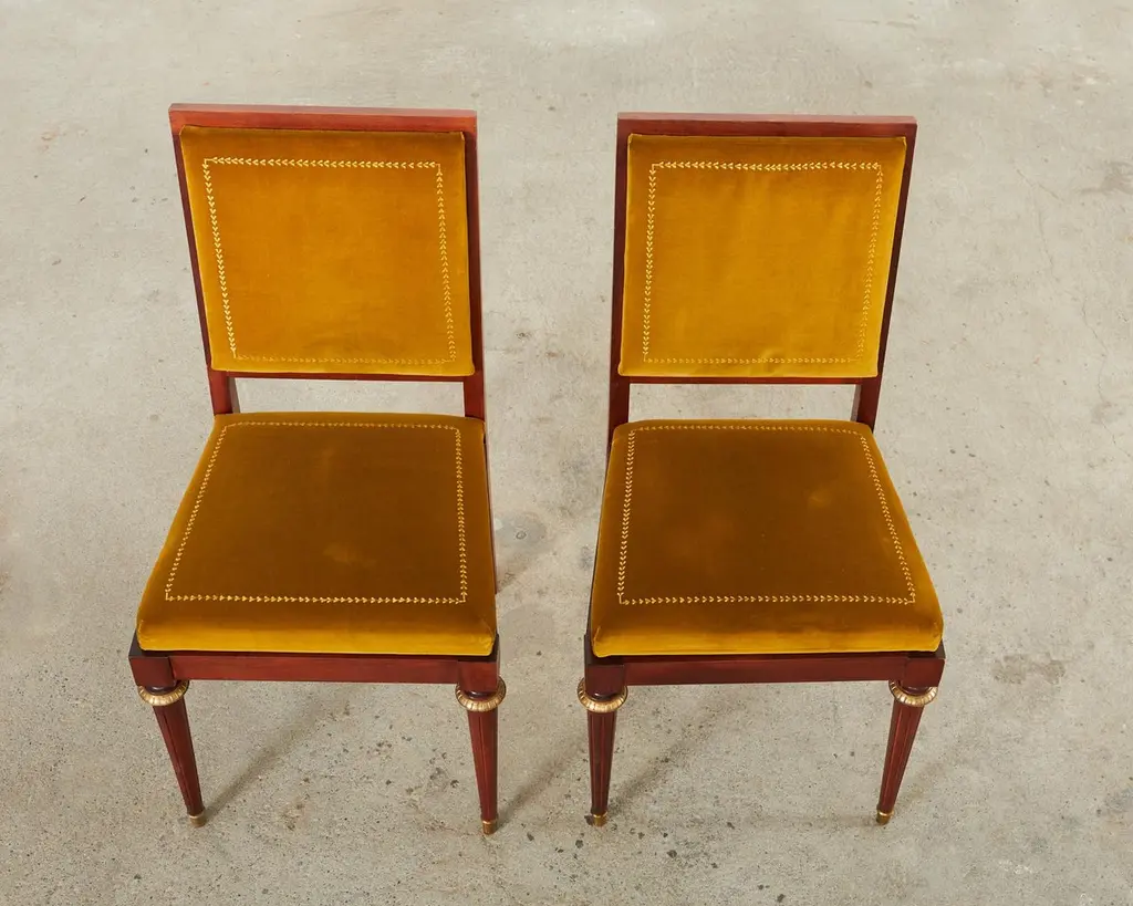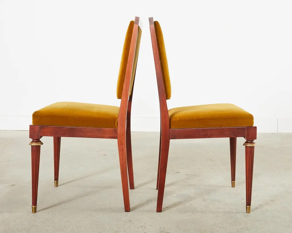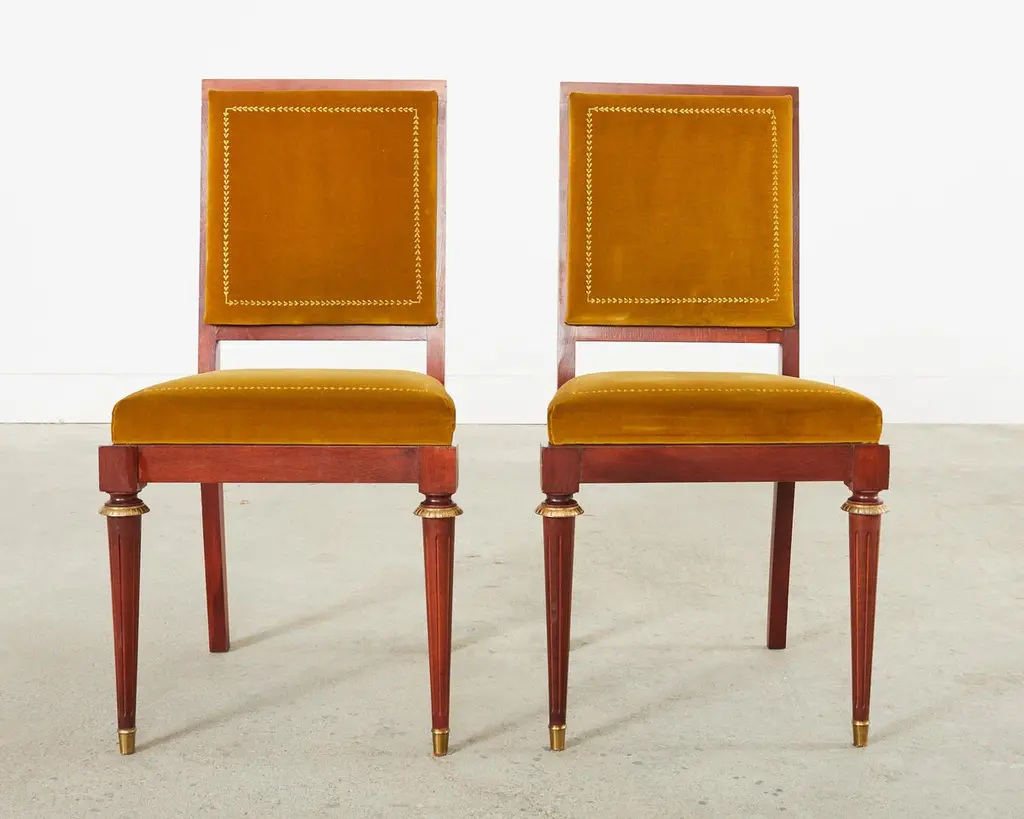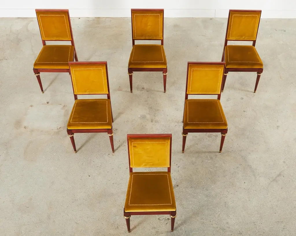 Extraordinary set of six mahogany dining chairs made in the grand Napoleonic Empire taste. The chairs feature beautifully crafted mahogany frames with rich, deep woodgrains on the finish. The square back is conjoined to a square seat both having velvet covered cushions with a subtle gilt laurel leaf border. The seats are supported by neoclassical tapered and fluted legs with patinated bronze mounts on the top and ending with brass sabot capped feet. The chairs have a dramatic profile with excellent joinery and craftsmanship. Vintage upholstery that still shows well. Signed by cabinet maker on bottom of frames.