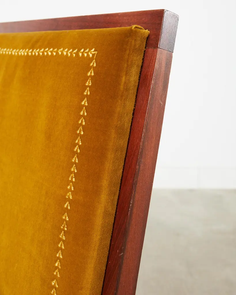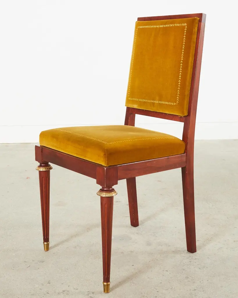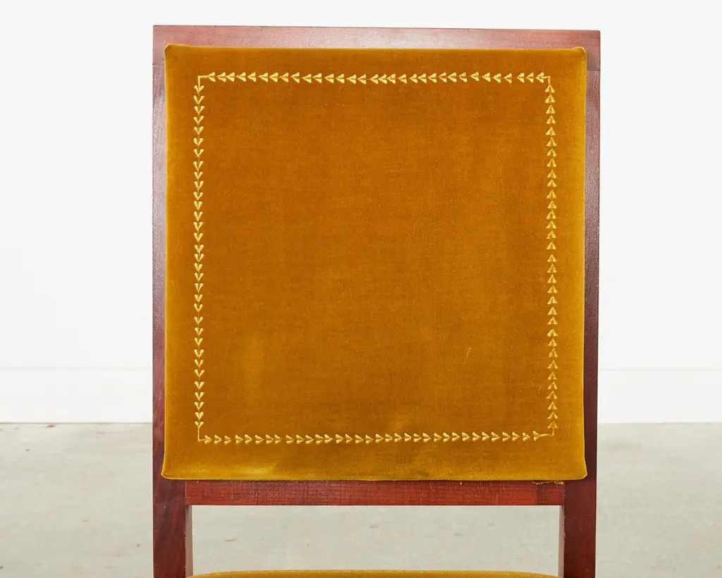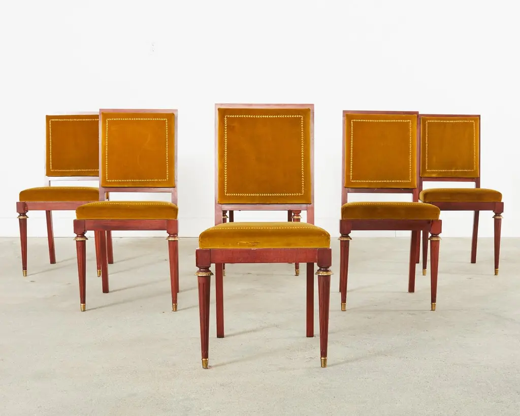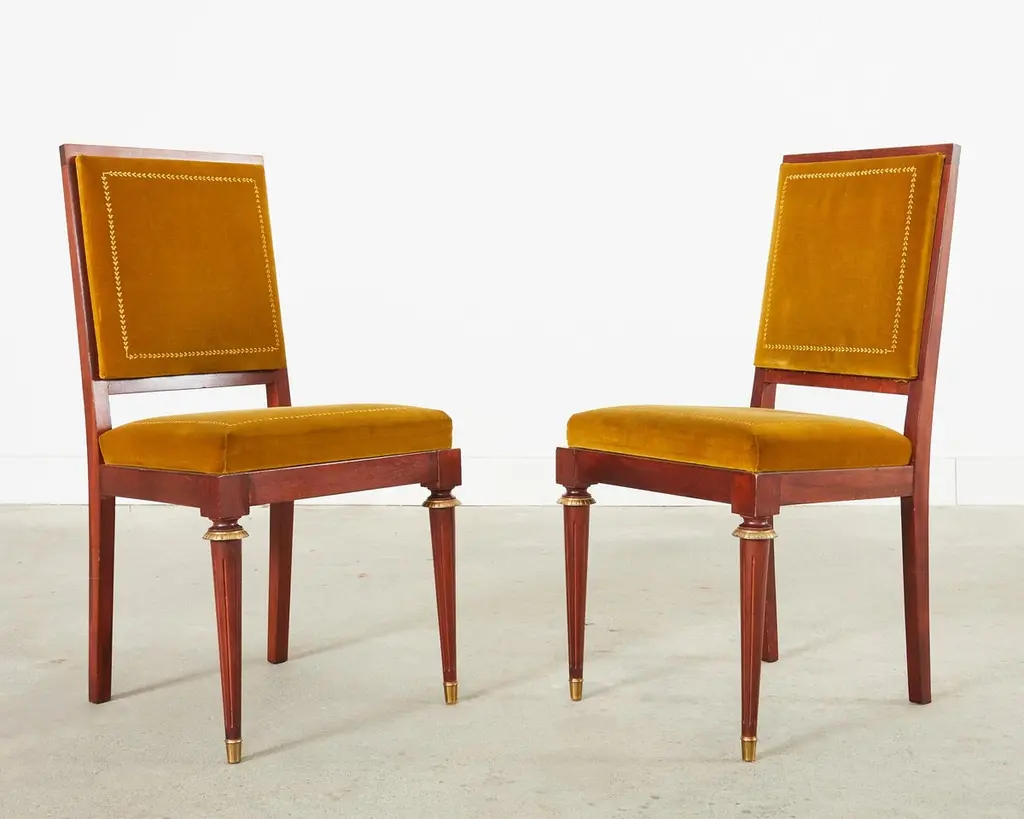 Extraordinary set of six mahogany dining chairs made in the grand Napoleonic Empire taste. The chairs feature beautifully crafted mahogany frames with rich, deep woodgrains on the finish. The square back is conjoined to a square seat both having velvet covered cushions with a subtle gilt laurel leaf border. The seats are supported by neoclassical tapered and fluted legs with patinated bronze mounts on the top and ending with brass sabot capped feet. The chairs have a dramatic profile with excellent joinery and craftsmanship. Vintage upholstery that still shows well. Signed by cabinet maker on bottom of frames.