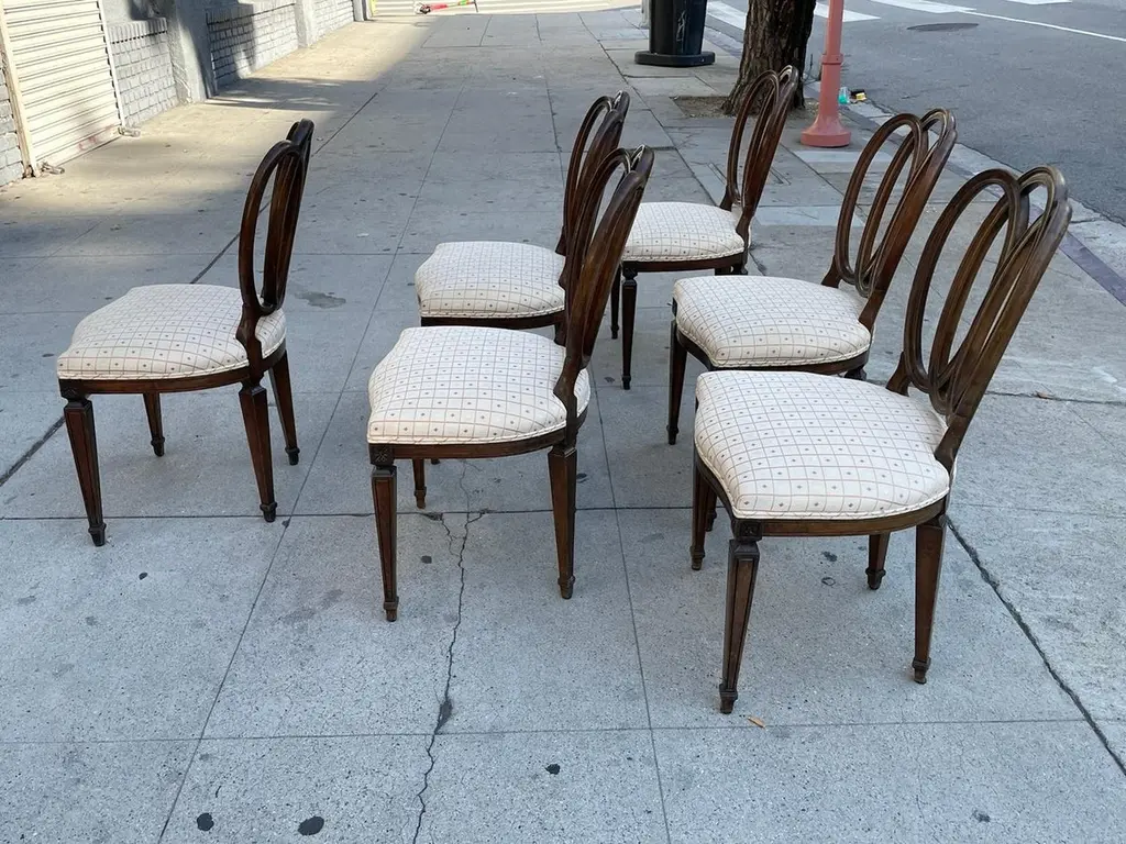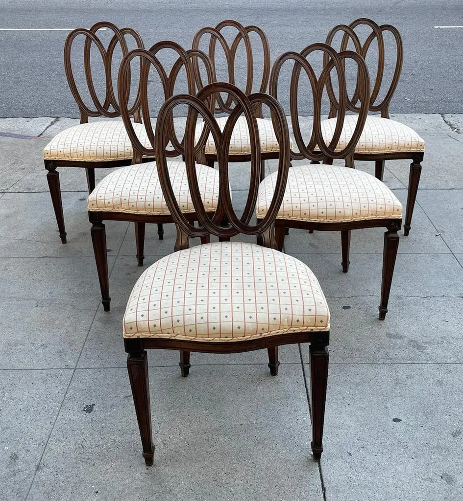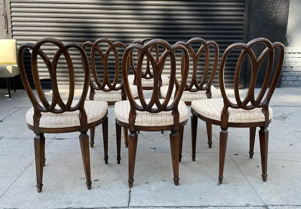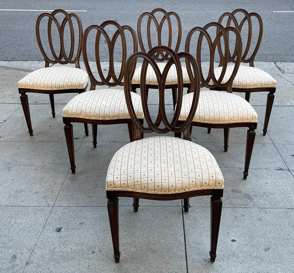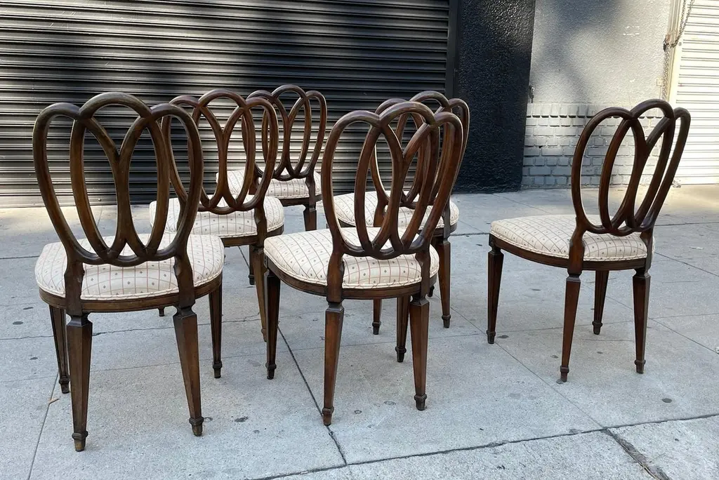 Introducing the elegant and sophisticated Set of Six Ribbon Back Dining Chairs by Dennis and Leen. This exquisite collection of dining chairs is a true testament to the craftsmanship and attention to detail that Dennis and Leen are renowned for.The chairs feature a stunning ribbon back design, adding a touch of timeless charm to any dining space. Crafted with utmost precision, these chairs boast a flawless white and beige upholstery, effortlessly blending into any interior color scheme. Each chair has been meticulously crafted to offer the utmost comfort and support, ensuring a delightful dining experience for you and your guests.Not only do these chairs provide exceptional comfort, but they also make a striking statement piece in any room. The combination of the ribbon back design and the neutral upholstery adds a touch of sophistication and elegance, elevating your dining area to new heights of style.Made with the finest materials and expert craftsmanship, these dining chairs are built to last. Whether you are hosting a formal dinner party or enjoying a casual family meal, the Set of Six Ribbon Back Dining Chairs by Dennis and Leen will undoubtedly become the focal point of your space.The Chairs are not labeled.Measurements:36.50 inches high x 24.75 inches wide x 21.50 inches deep x 18.50 inches seat height.