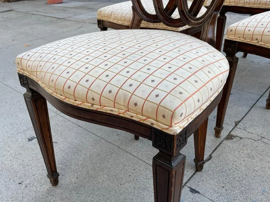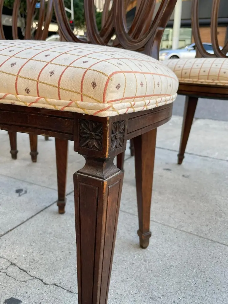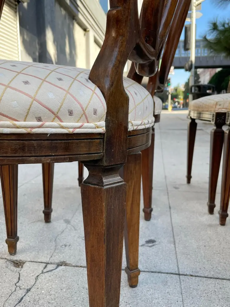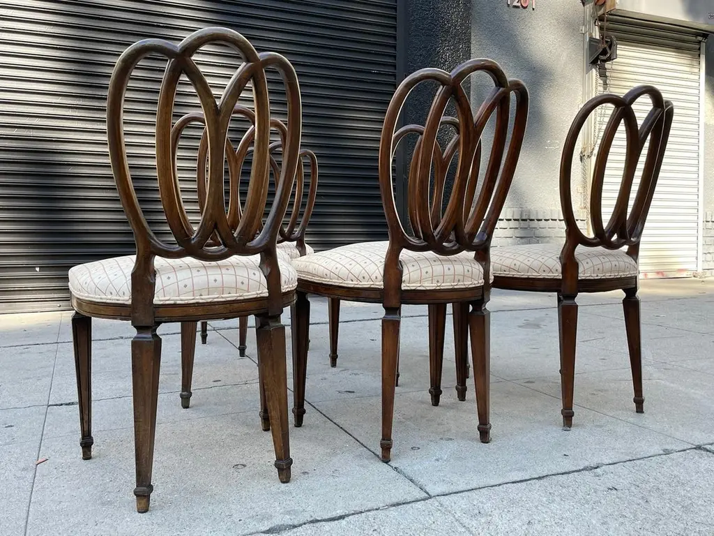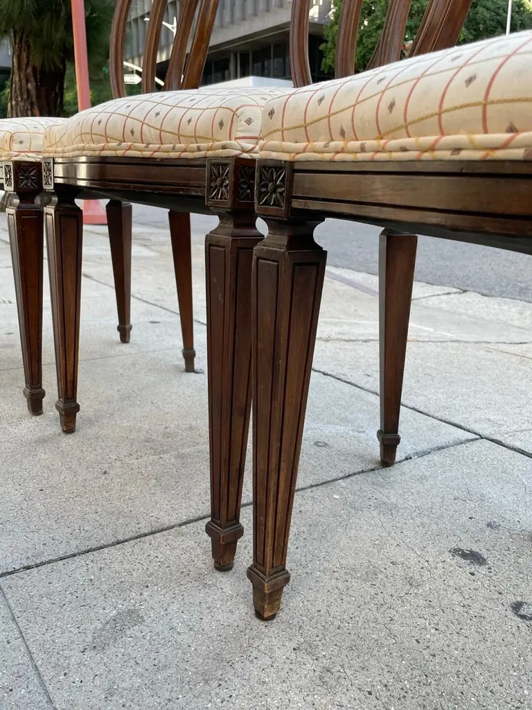 Introducing the elegant and sophisticated Set of Six Ribbon Back Dining Chairs by Dennis and Leen. This exquisite collection of dining chairs is a true testament to the craftsmanship and attention to detail that Dennis and Leen are renowned for.The chairs feature a stunning ribbon back design, adding a touch of timeless charm to any dining space. Crafted with utmost precision, these chairs boast a flawless white and beige upholstery, effortlessly blending into any interior color scheme. Each chair has been meticulously crafted to offer the utmost comfort and support, ensuring a delightful dining experience for you and your guests.Not only do these chairs provide exceptional comfort, but they also make a striking statement piece in any room. The combination of the ribbon back design and the neutral upholstery adds a touch of sophistication and elegance, elevating your dining area to new heights of style.Made with the finest materials and expert craftsmanship, these dining chairs are built to last. Whether you are hosting a formal dinner party or enjoying a casual family meal, the Set of Six Ribbon Back Dining Chairs by Dennis and Leen will undoubtedly become the focal point of your space.The Chairs are not labeled.Measurements:36.50 inches high x 24.75 inches wide x 21.50 inches deep x 18.50 inches seat height.