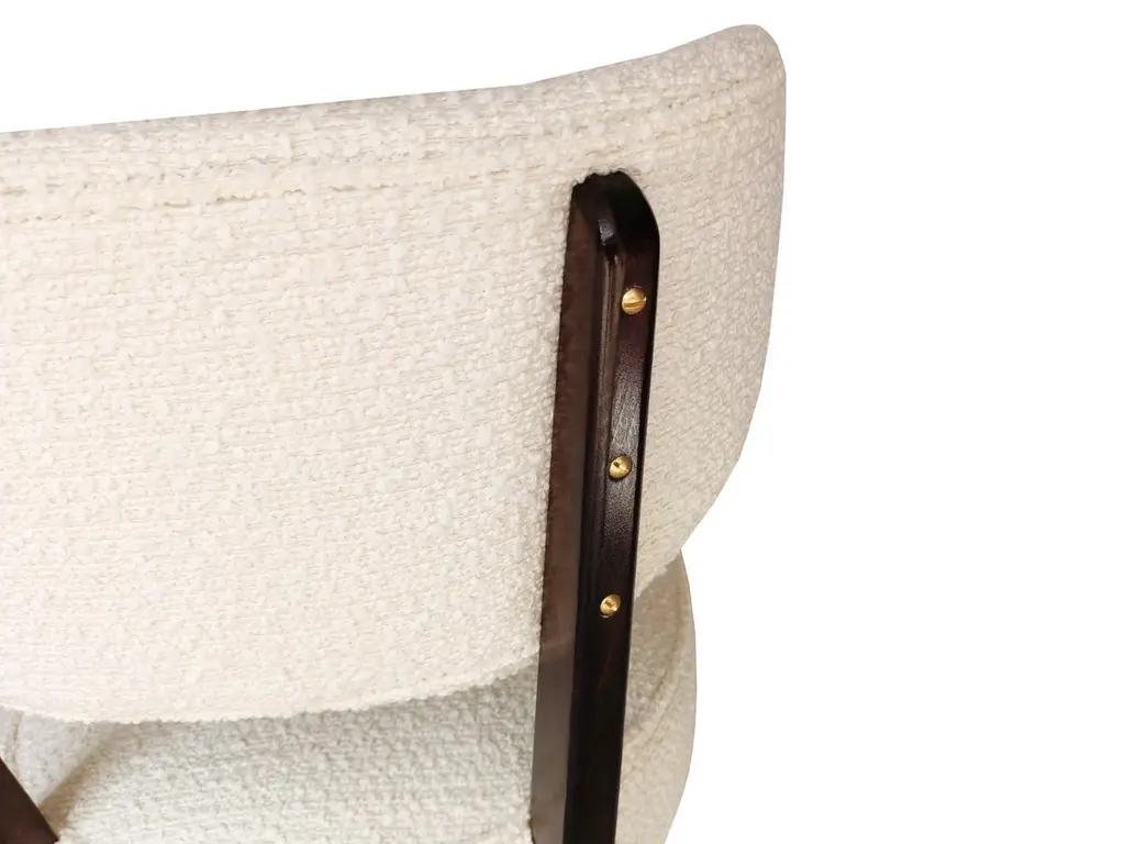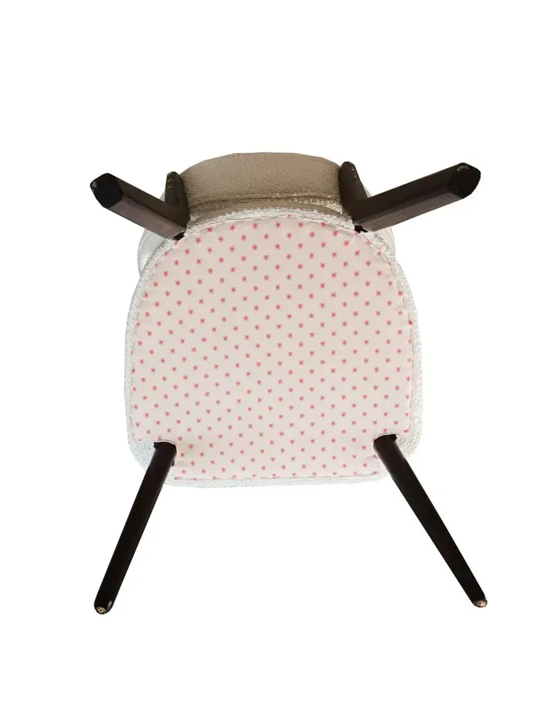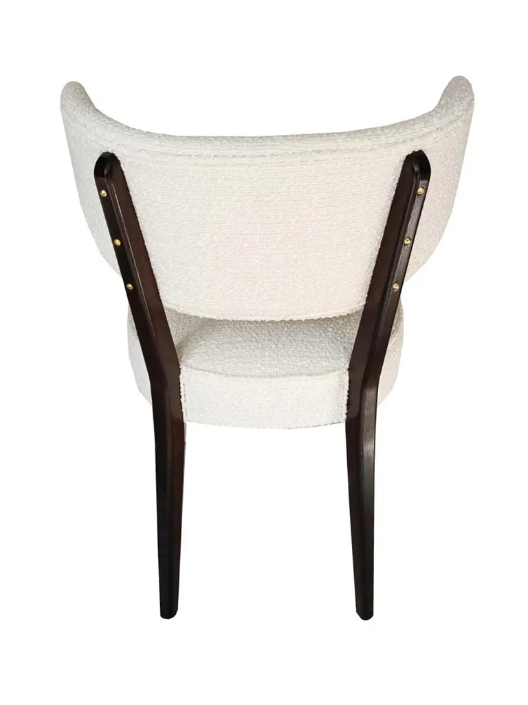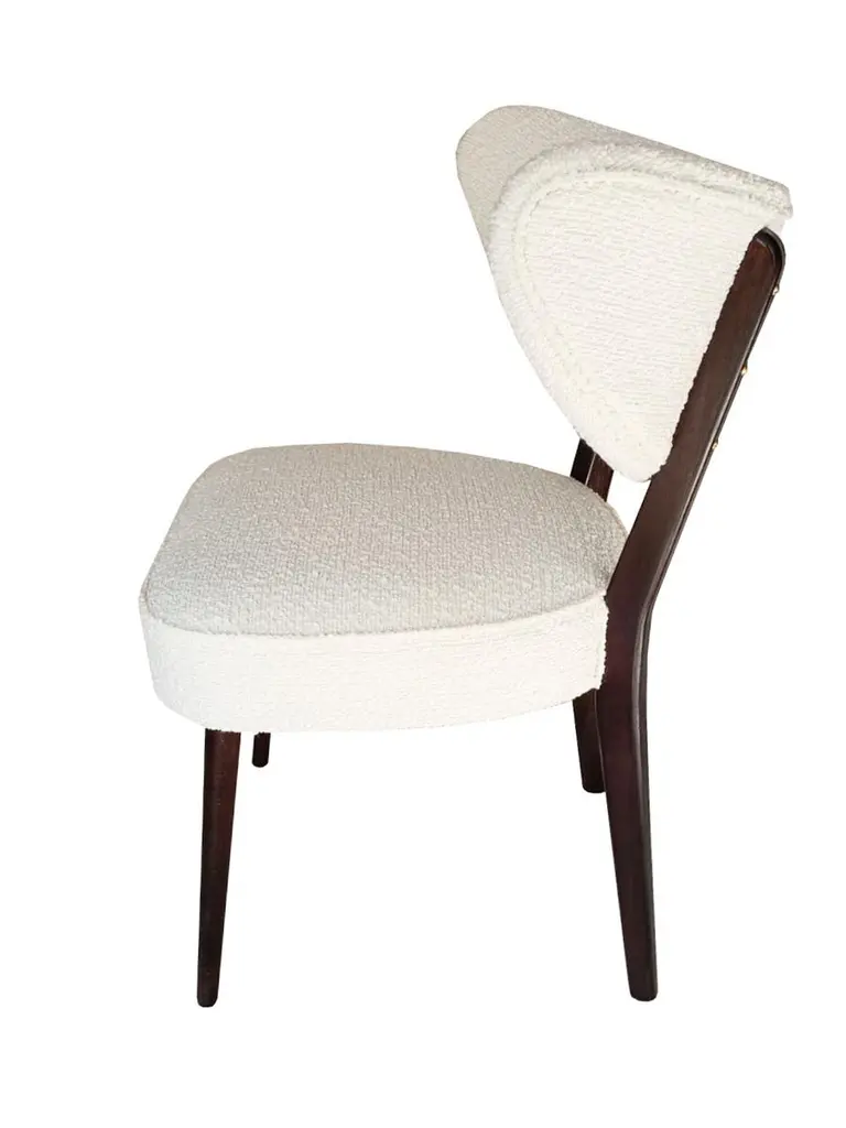 A contemporary piece with the soul of the 1960s. Designed by Ola Szewczul for Vintola Studio, this chair blends elegance, nobility, and everyday comfort. It was created for interiors where refined form meets functionality.Springy, very comfortable, and perfectly stable, it can serve as both a dining or accent chair. Handcrafted since 2024 at the Vintola Studio factory in Poland.Dimensions: 55 x 50 x h 82 cmAbout the fabric:Alba is a trendy boucle furniture fabric with characteristic, large, irregular loops. The combination of expressive texture and subdued, natural colours (warm shades of white, beige, grey, graphite) allows for creating surprising texture contrasts in monochrome interiors inspired by earth tones. Alba looks particularly impressive on furniture with slightly curved or simple forms, without quilting or stitching – it is sufficiently interesting in itself and does not require additional upholstery treatments. Pleasant to the touch and soft, it helps to create an atmosphere of cosiness and warmth in the interior. Alba is also very practical in everyday use – minor snags (e.g., made by your cat's claws) disappear in its rich texture.Composition: Acrylic 5% Polyester 95%Martindale: 50000Made in ItalyAll options of fabrics and wood colors are possible to prepare. Change of dimensions are also possible.Please ask for more informations.Here set of 6 chairs is available.