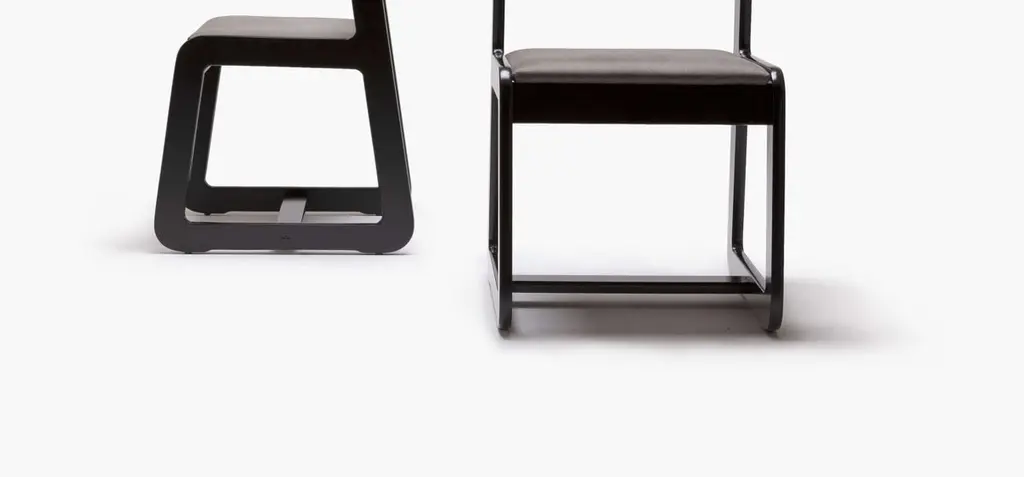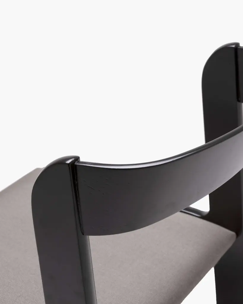 This set of ten dining chairs, designed by Willy Rizzo for Mario Sabot, feature an elegantly curved back and frame of black lacquered wood. Offering up simple, ergonomic elegance, the set is upholstered with a sophisticated grey-toned cotton blend fabric.